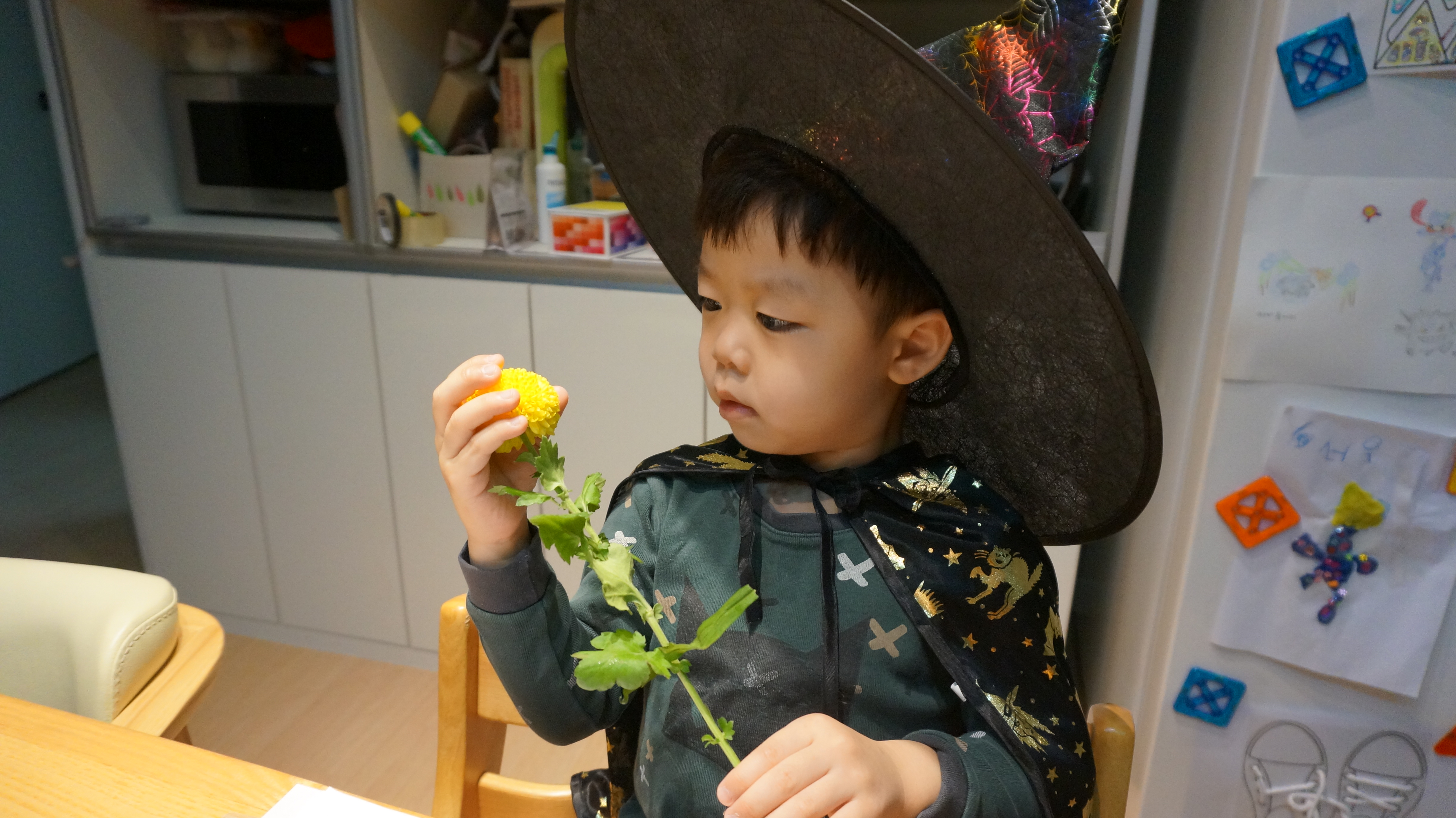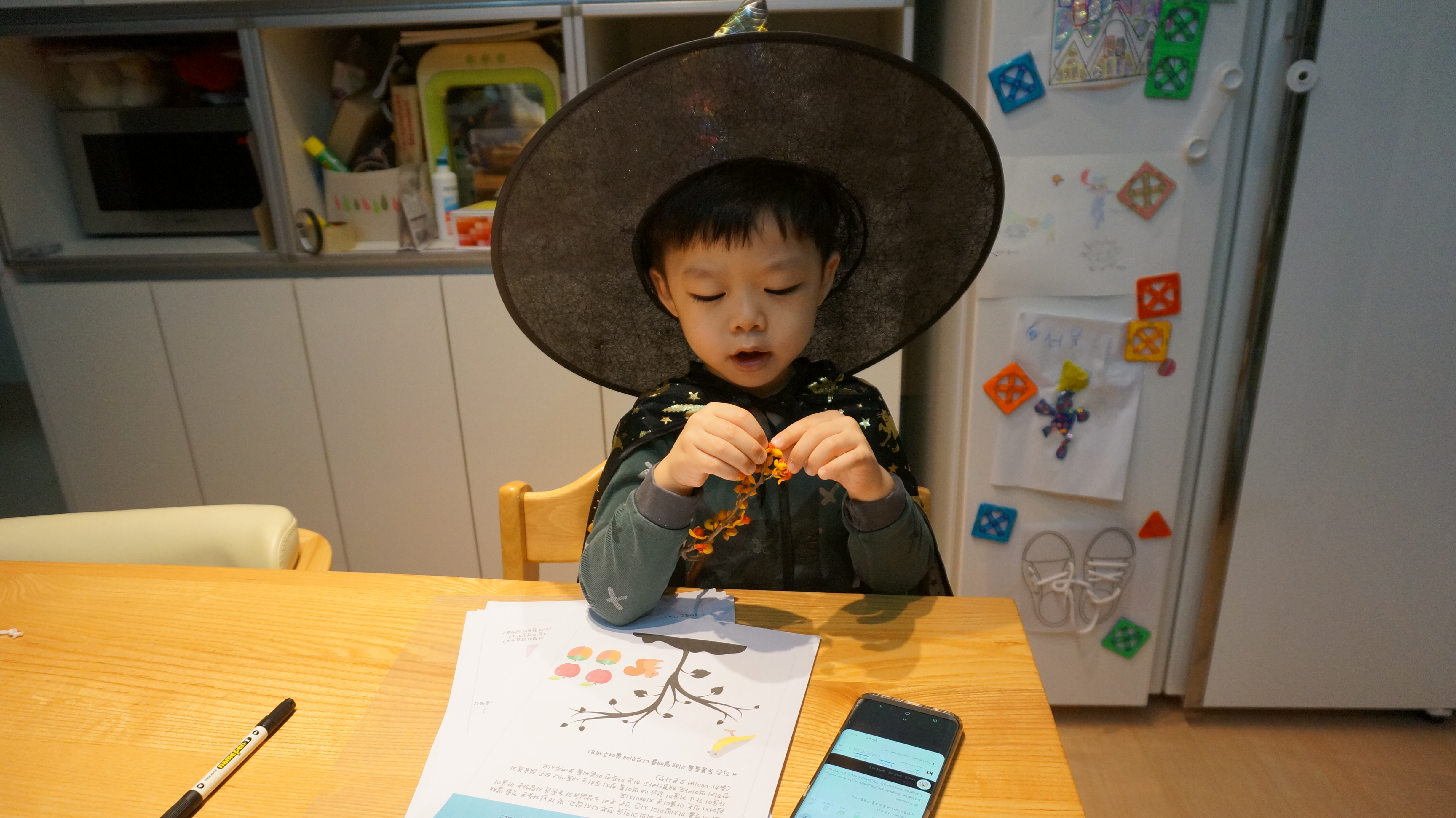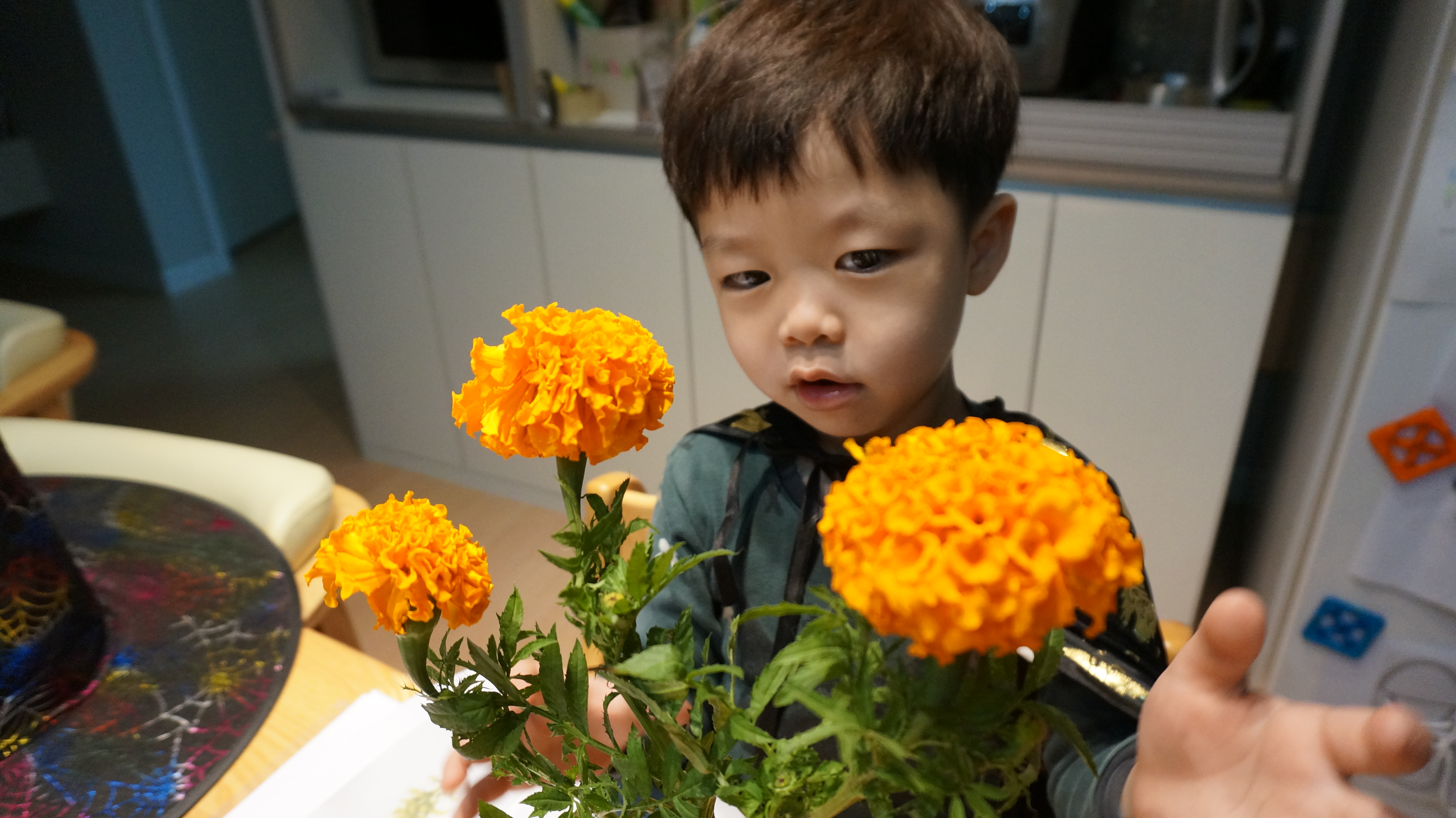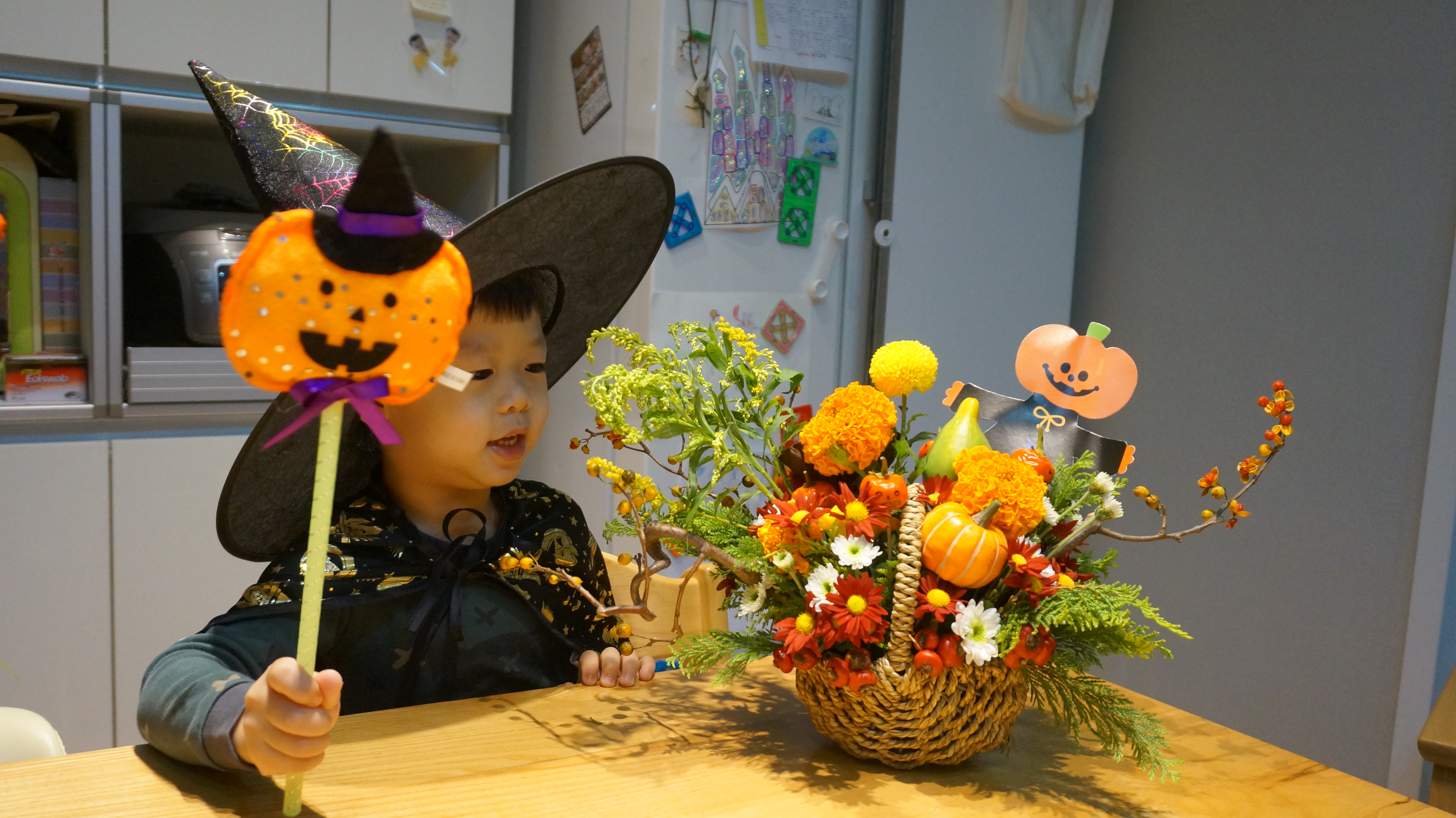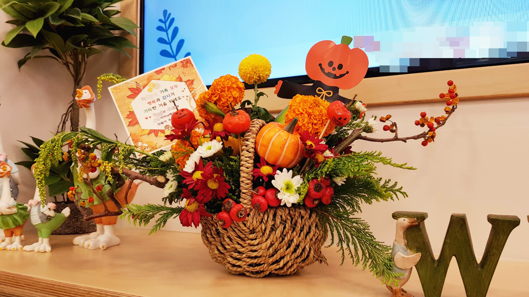 다음날 아침, 동글이가 다니고 있는 어린이집에 할로윈 꽃바구니를 가져가서 친구들과 함께 보고싶다고 하더군요.