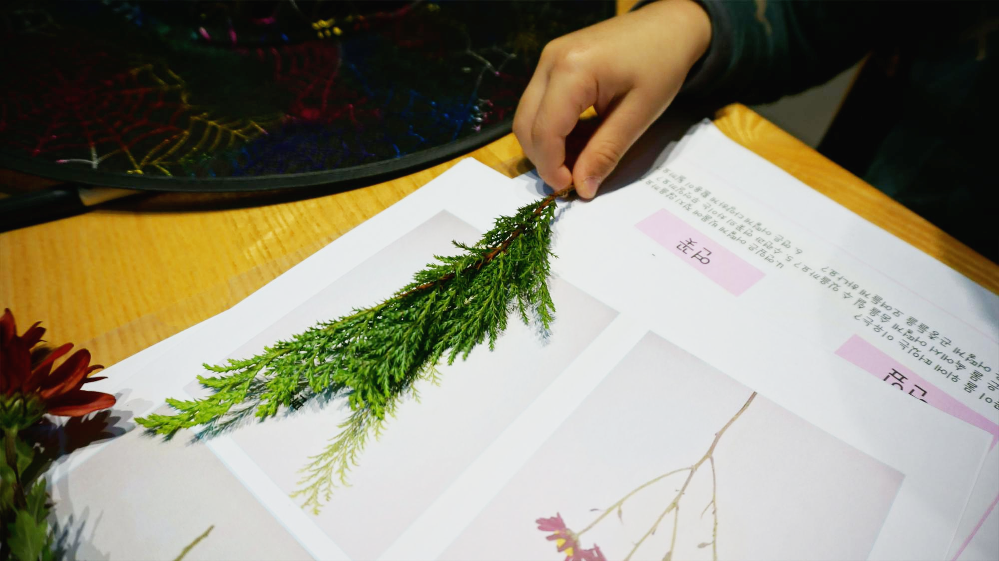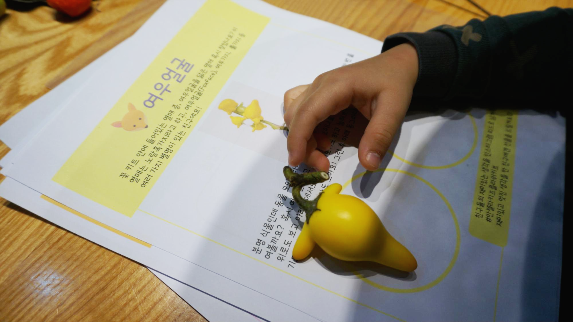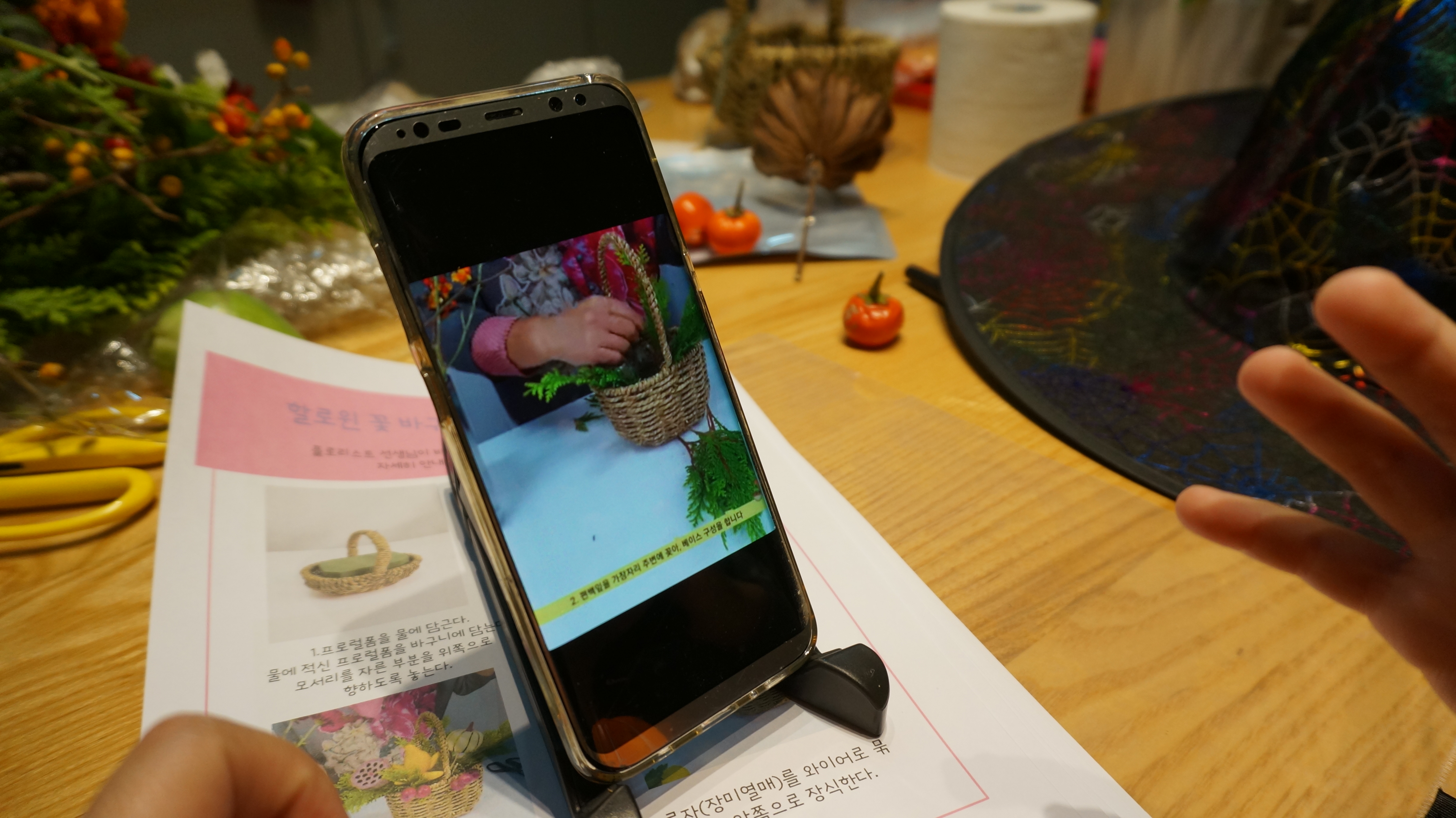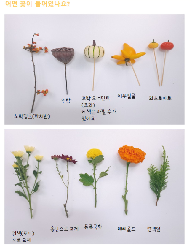 꽃바구니를 만들기에 앞서 워크지와 꽃을 함께 살펴보았어요.