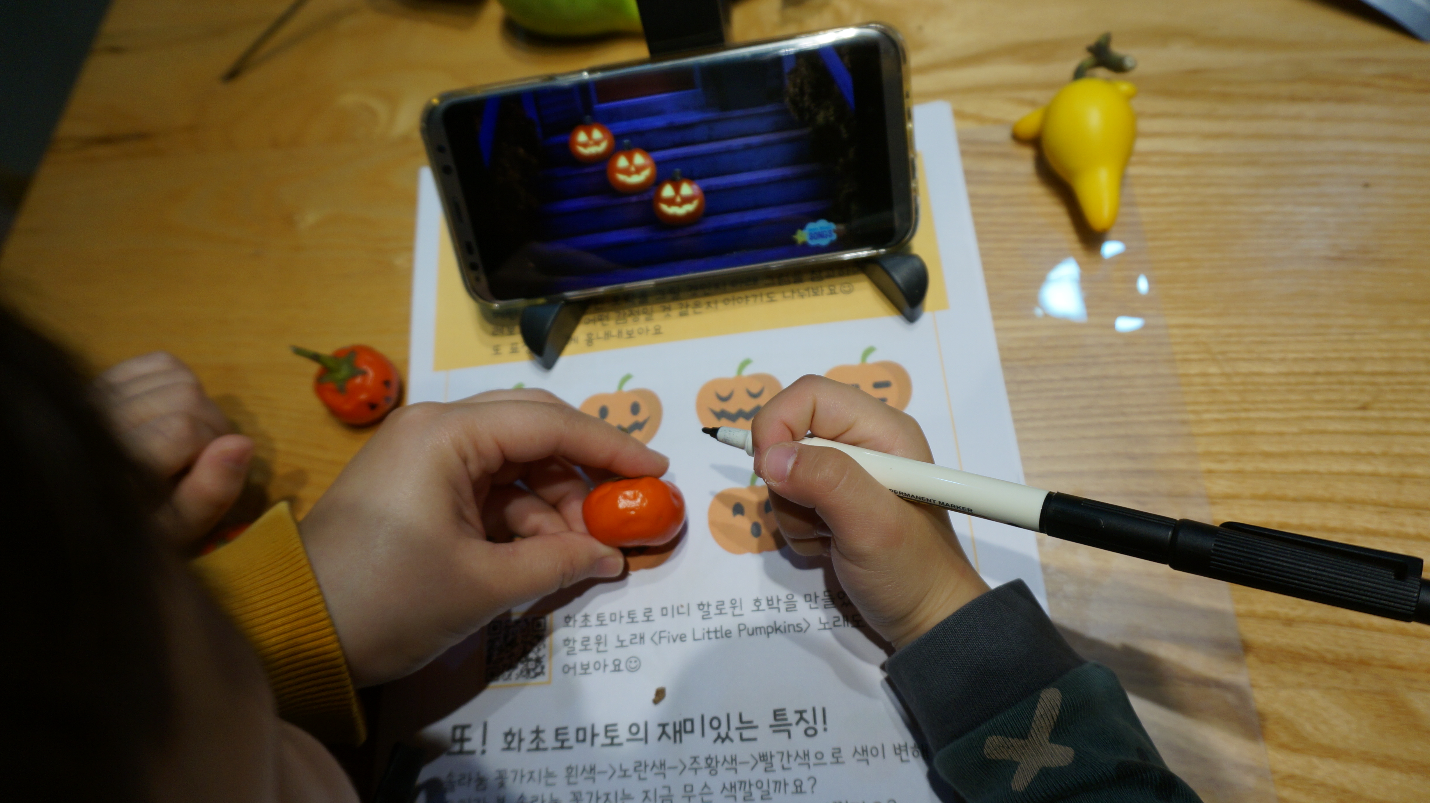워크지에 할로윈노래영상이 QR코드로 실려있어 동글이와 함께 보며 네임펜으로 화초토마토에 호박괴물처럼 얼굴을 그려주었어요.