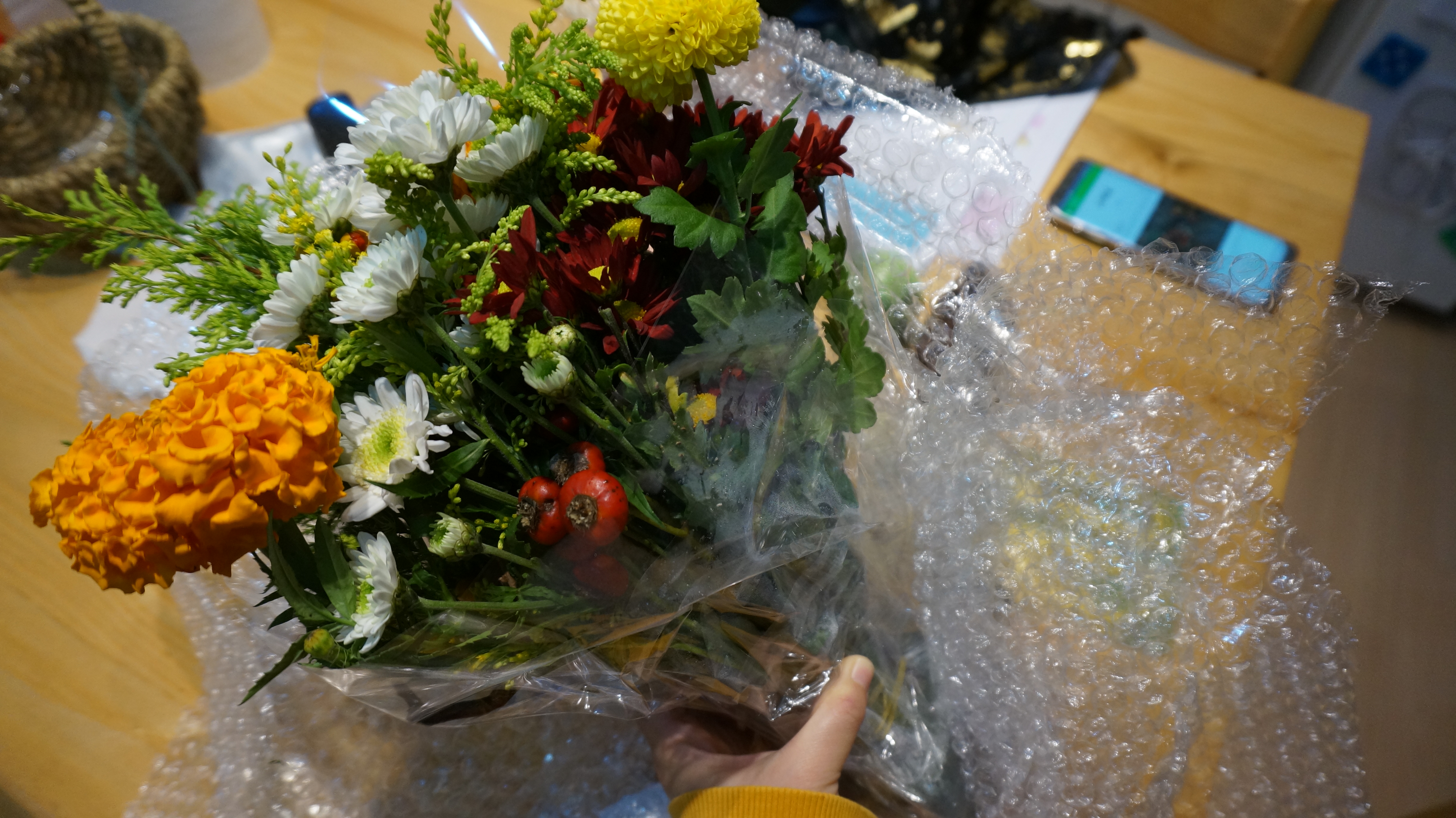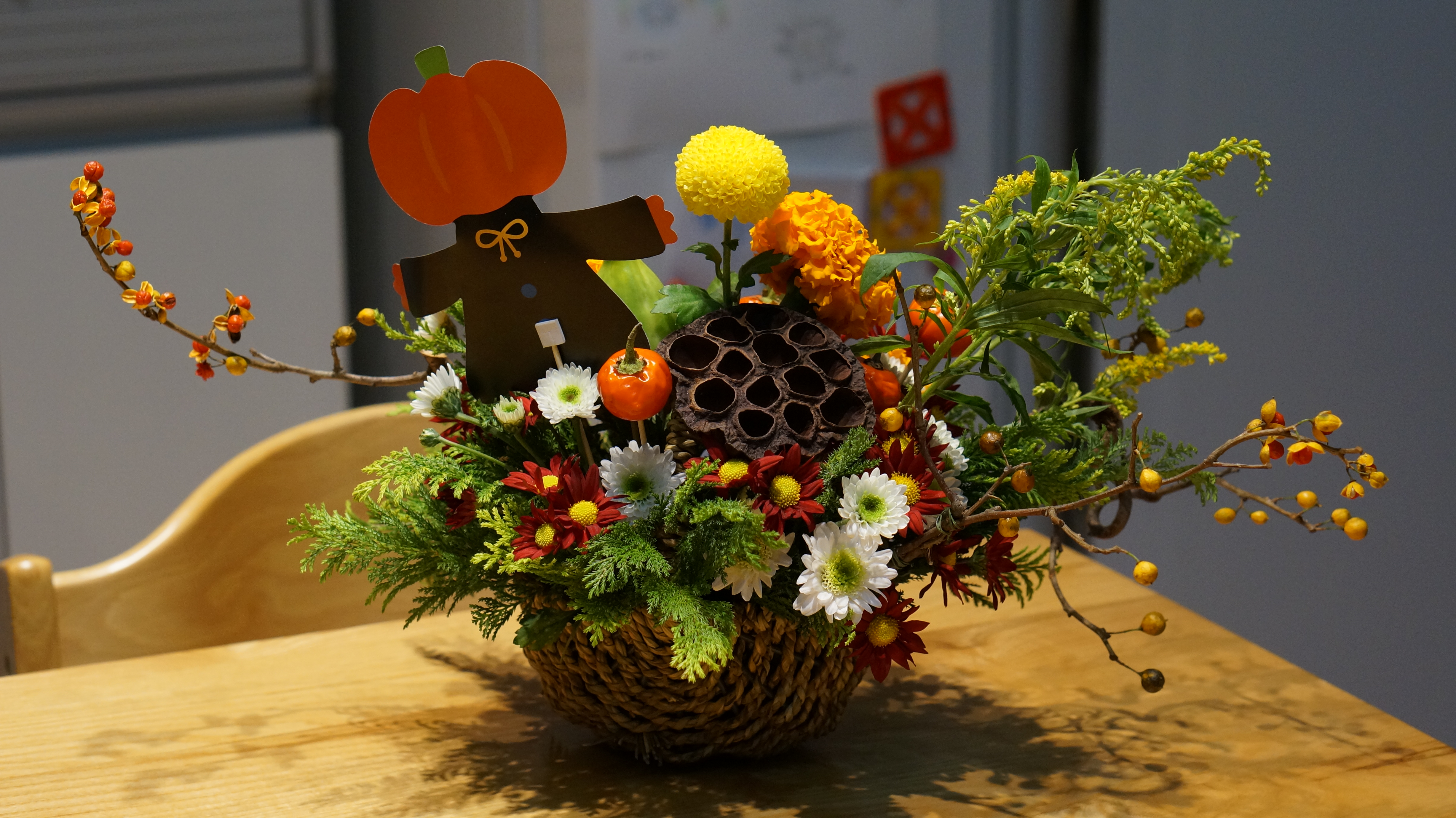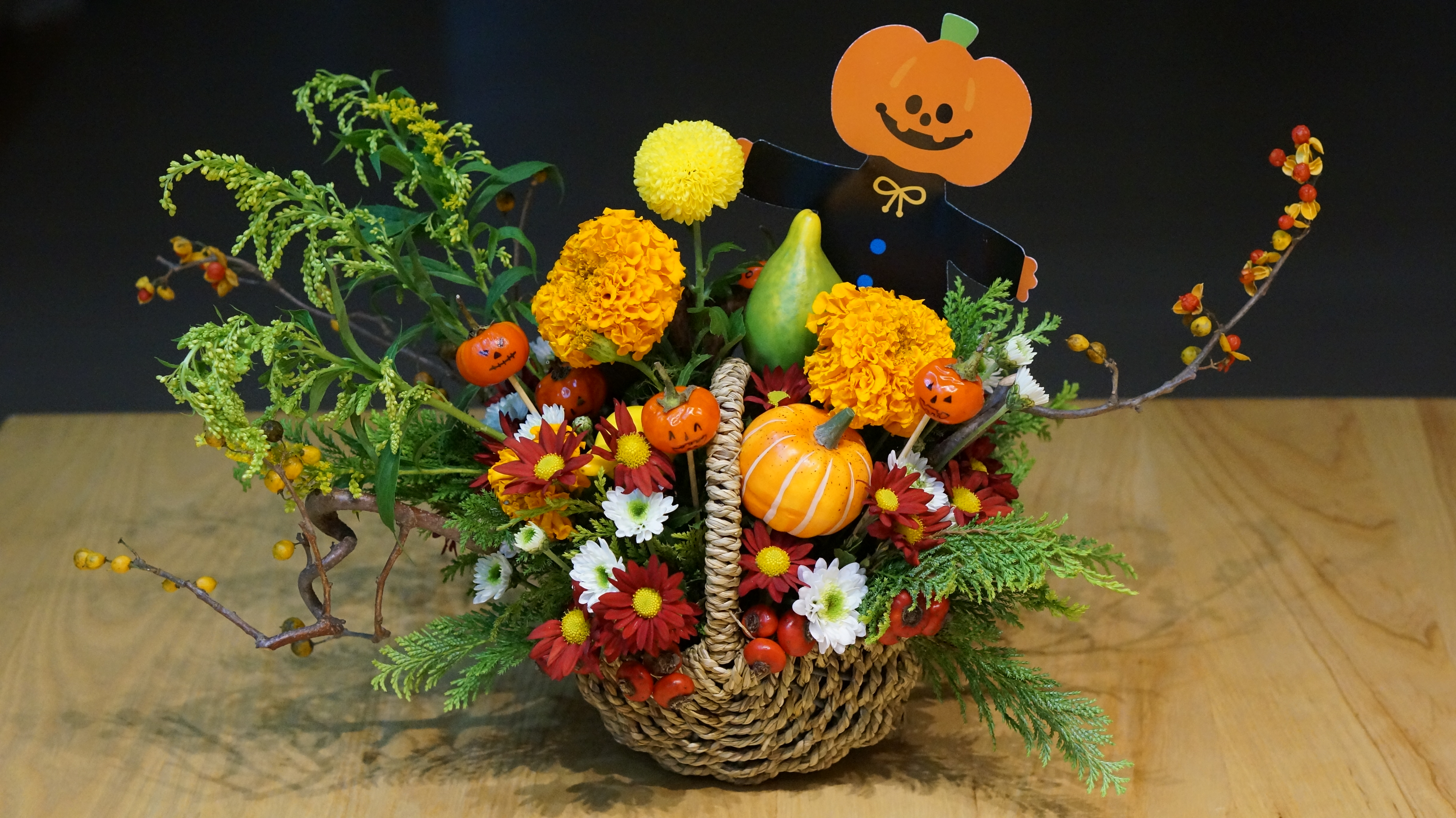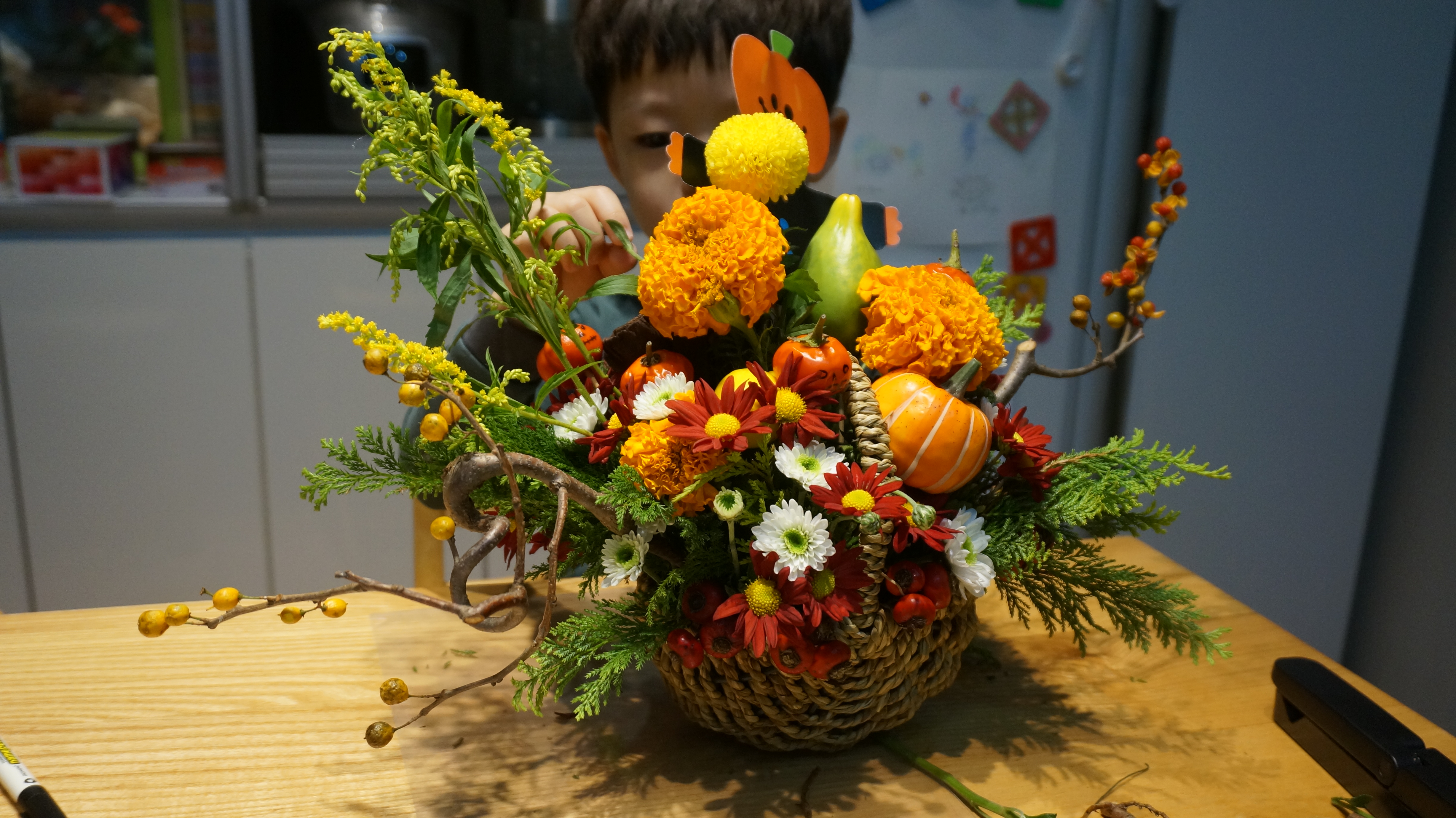메리골드와 퐁퐁국화, 소국, 노박덩굴, 할로윈장식까지 꽂아 완성!