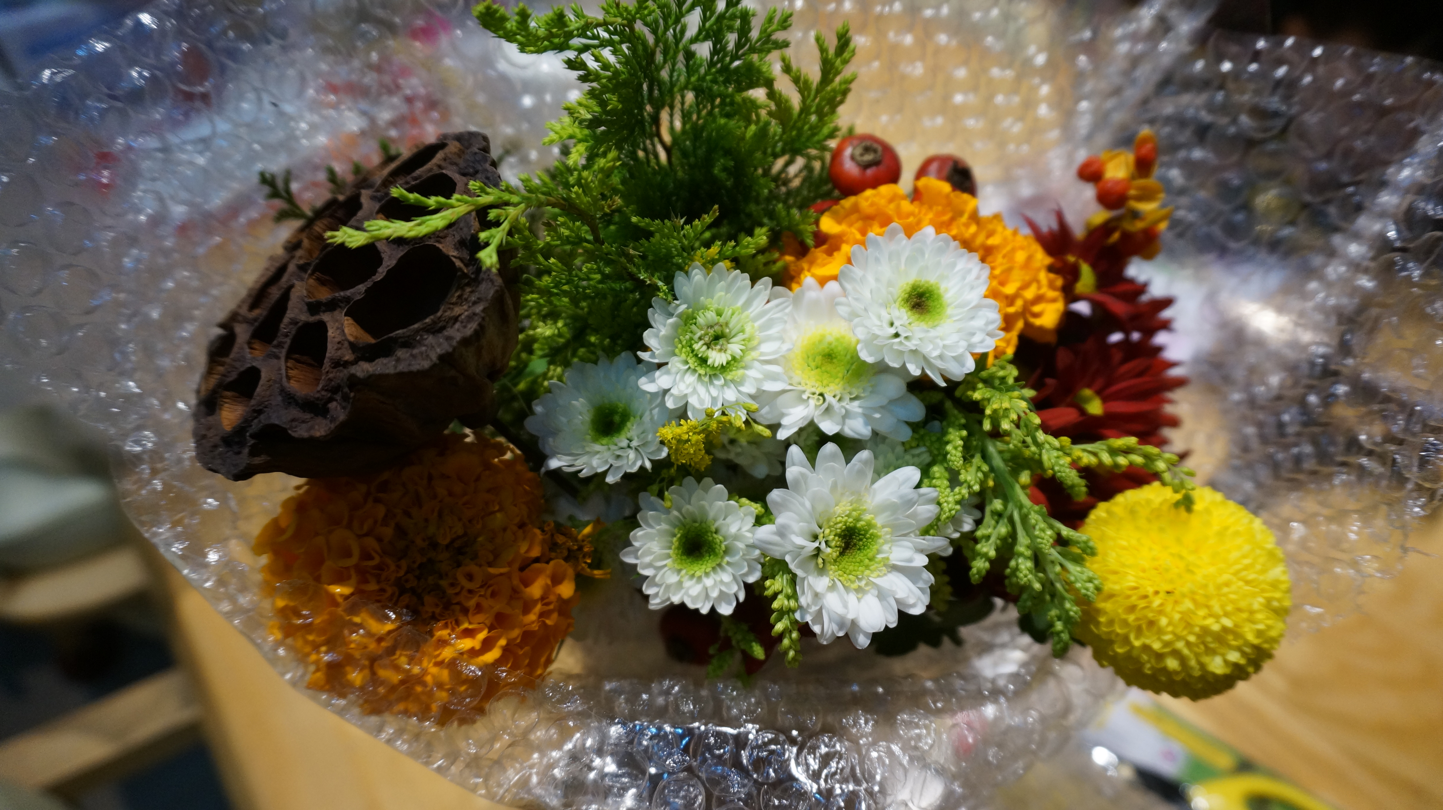 향기가 너무 좋은 생화다발은 파손되지 않도록 뽁뽁이에 싸여왔고, 싱싱하게 올 수 있도록 젖어있는 플로럴폼에 꽂혀왔어요.