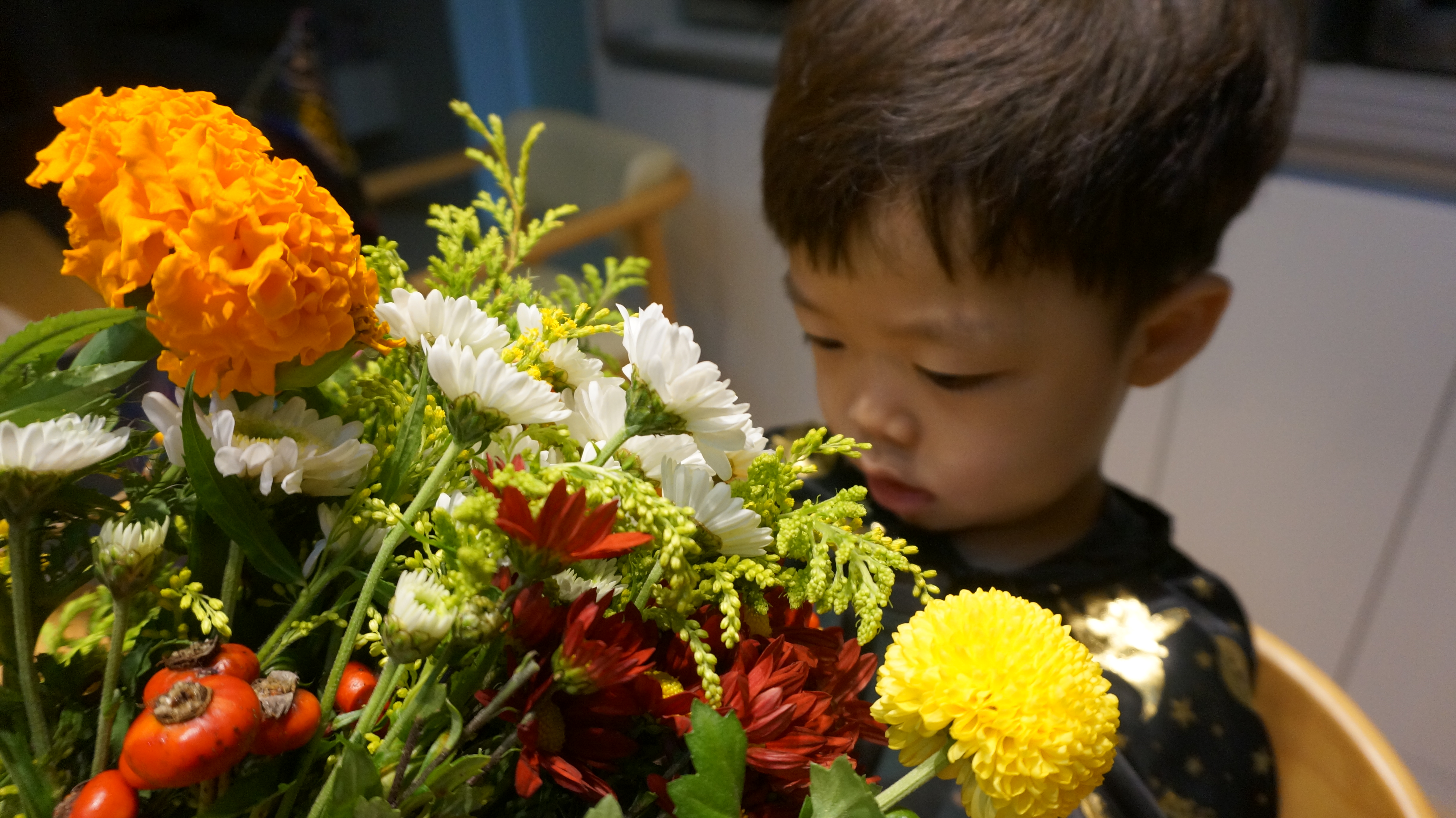 가을느낌 뿜뿜하는 소국도 동글이가 예쁘다며 쓰담쓰담 해주는 모습이 참 귀여웠답니다.