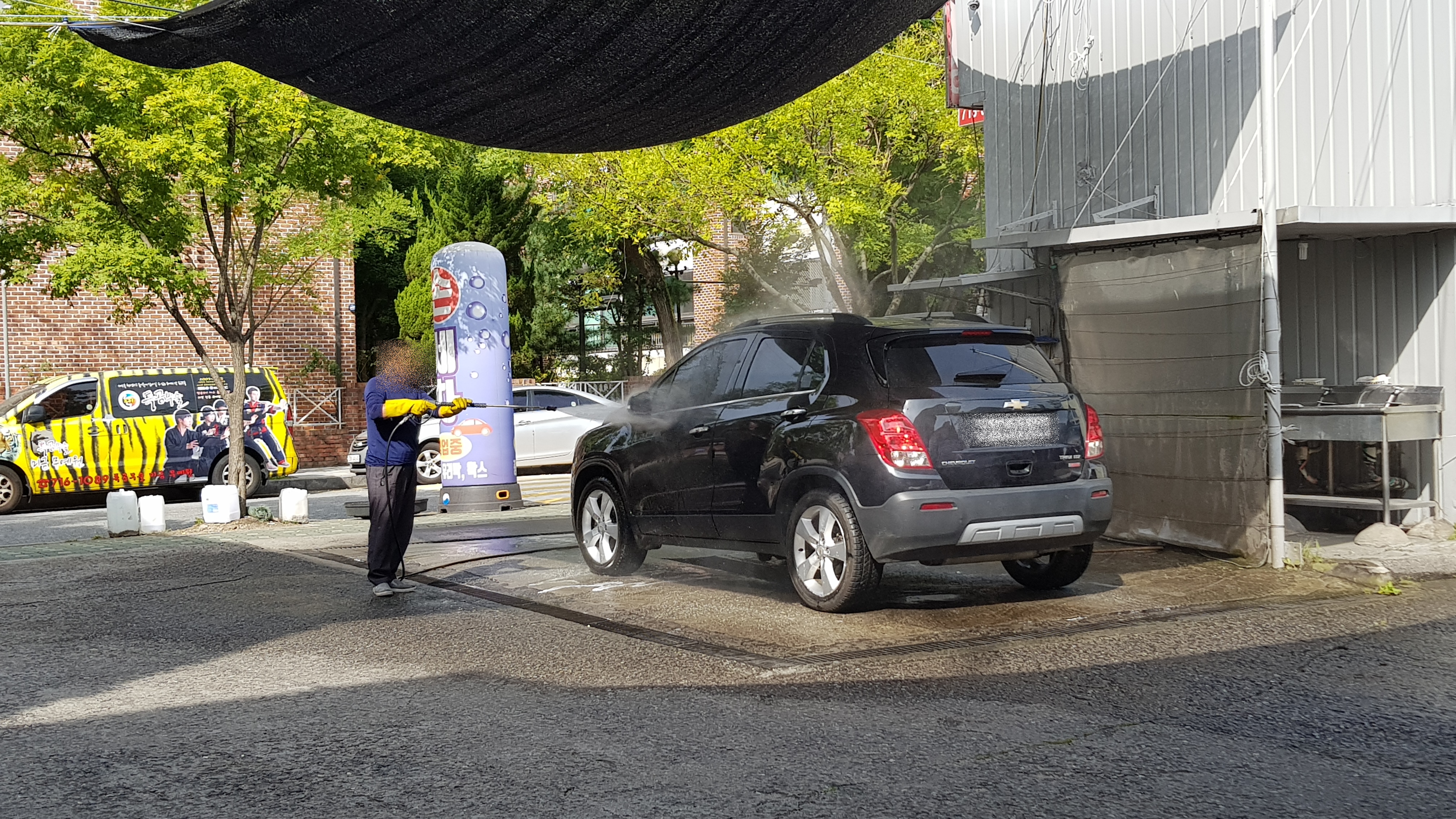 고압수로 물을 시원하게 뿌려주고 열심히 문질문질 문질러 오염을 제거한 후 깨끗하게 씻어내주시더라구요.
