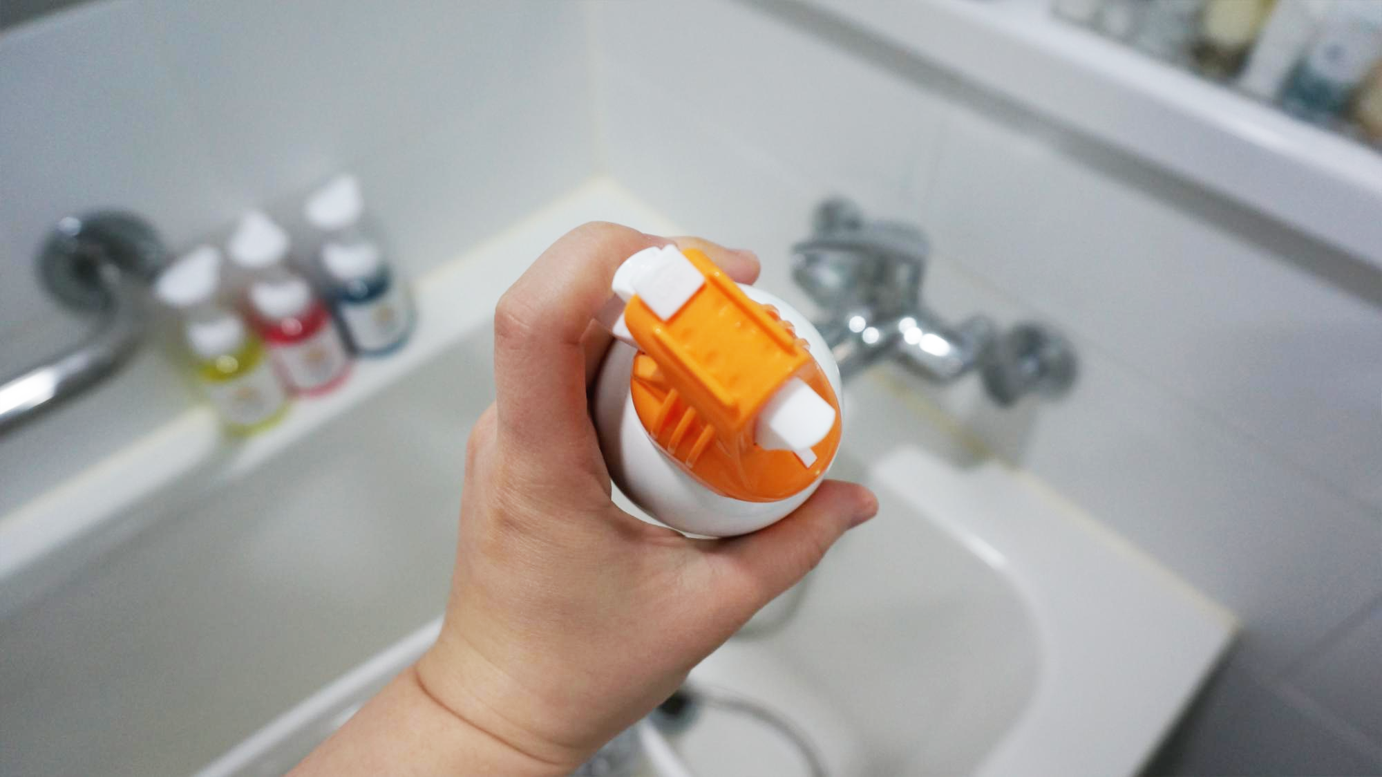 제가 동글이와 놀이한 제품은 대용량 건타입이라 상단에 안전마개가 있어 뜯어내주어야 했어요.