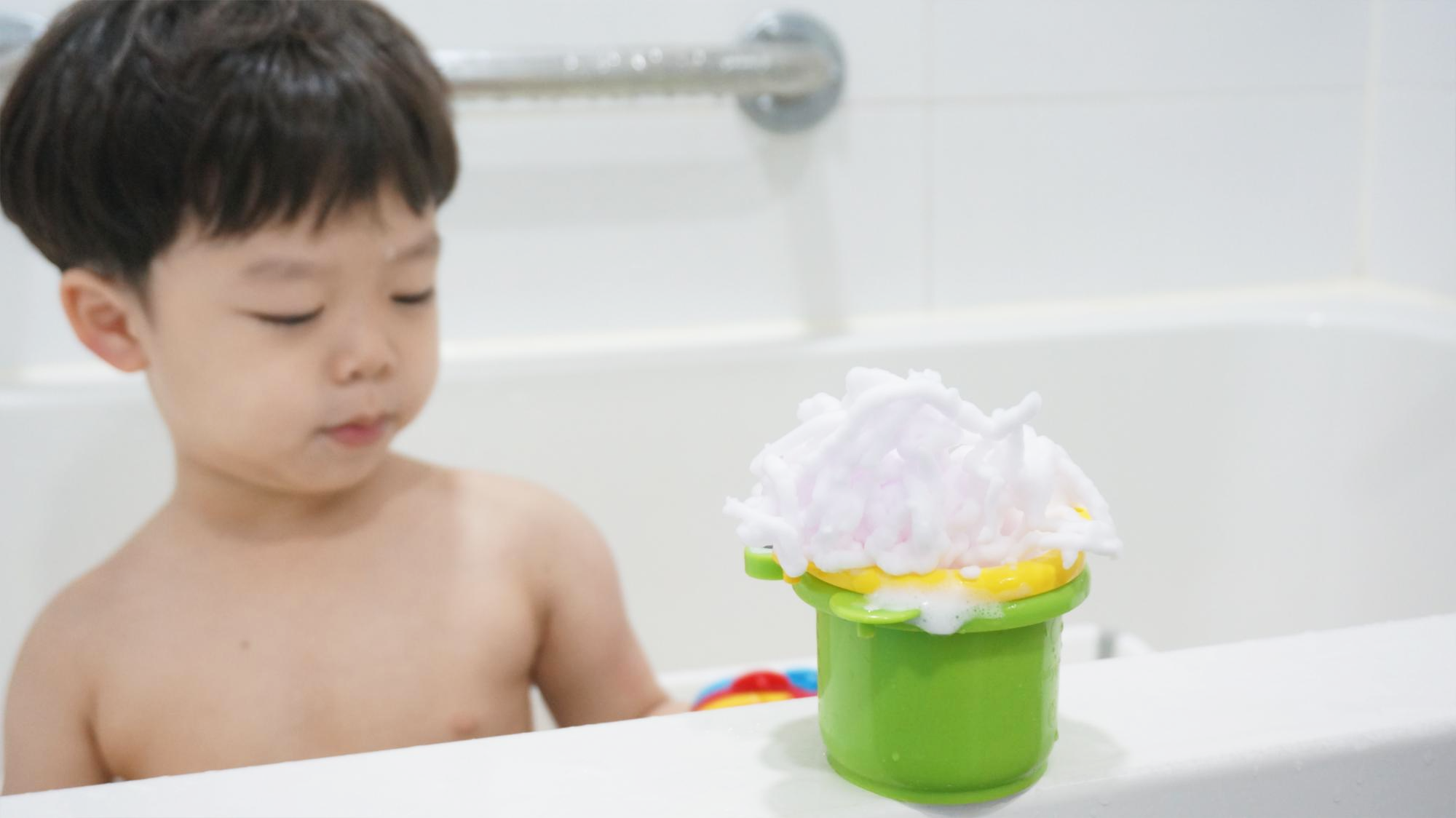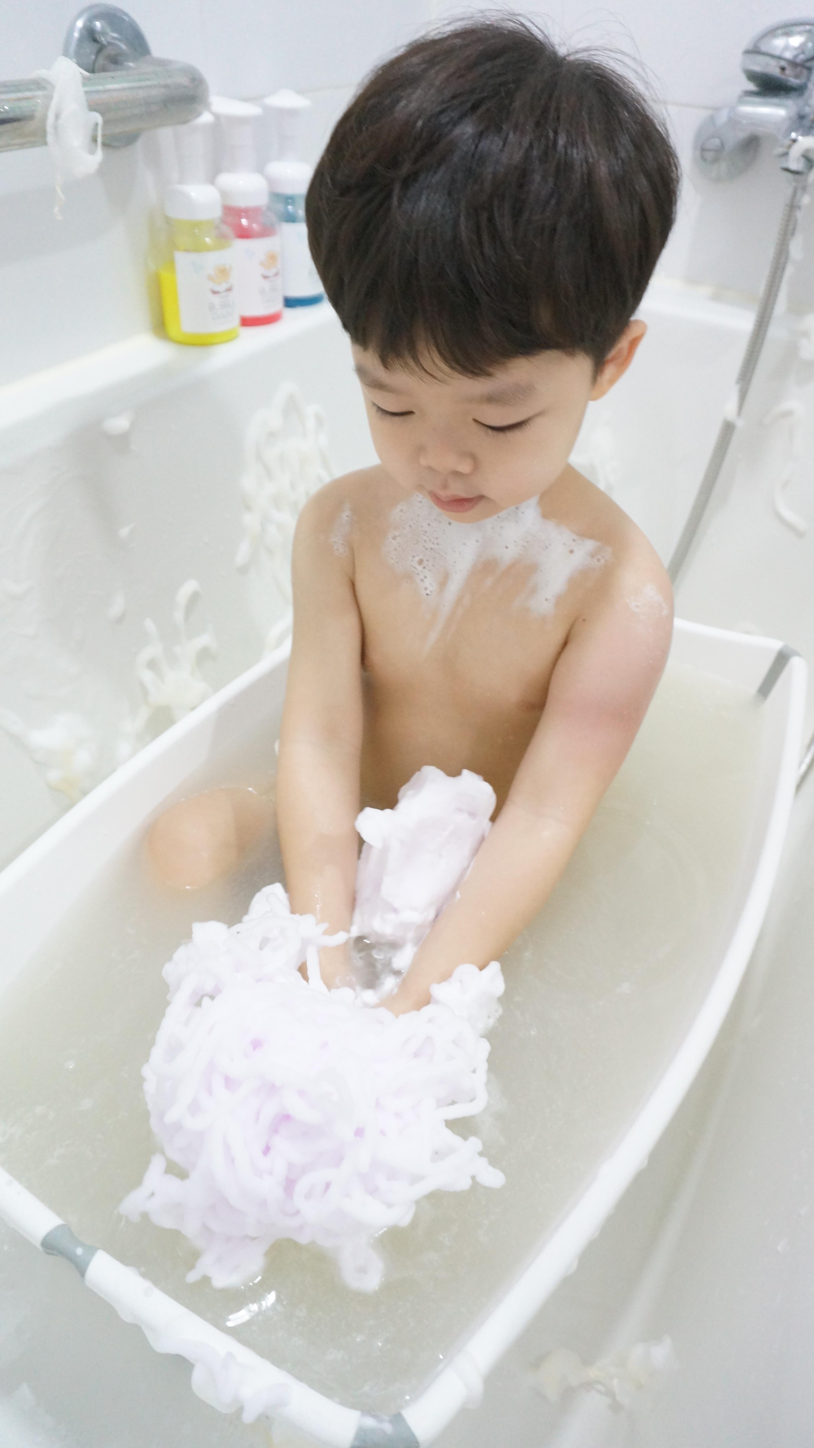 거품이 단단해서 목욕놀이 컵에 채워 넣고 그 위에 또 컵으로 누르는 놀이도 재미있었어요.