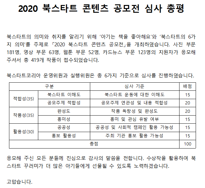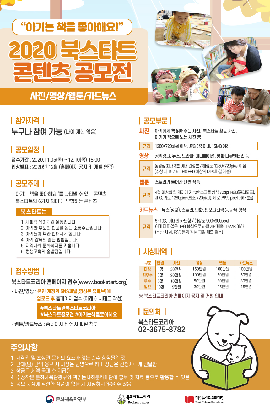 지난 2020년 11월 05일~12월10일 동안 2020 북스타트 콘텐츠 공모전이 진행되었었어요.