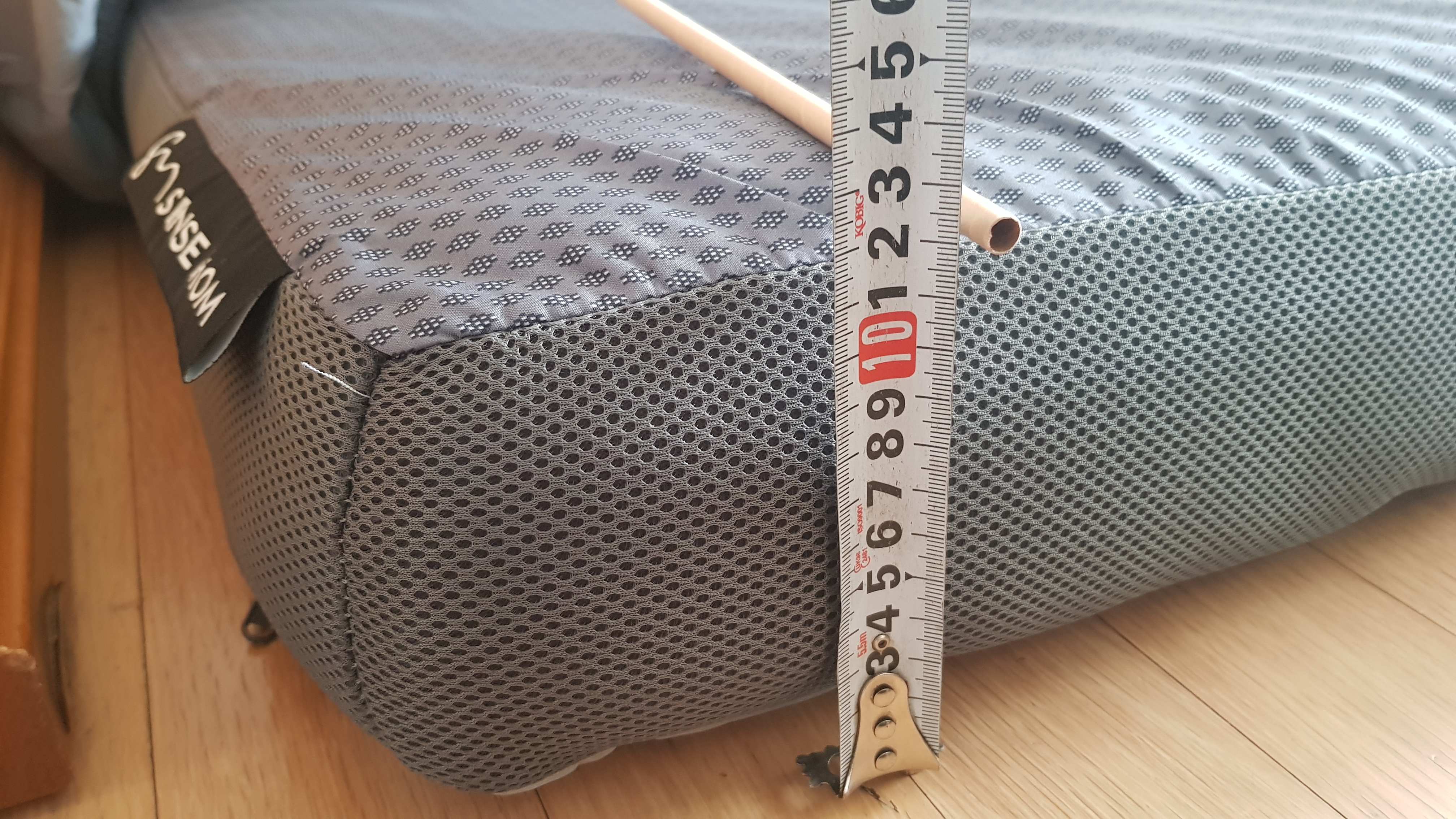 최초 개봉시나 압축팩에 넣어 보관 후 재사용시 최소 30분에서 최대 이틀이 지나야 길이와 높이가 원래사이즈로 돌아온다는 말에 측정은 하지 않았었는데요 이틀 써보면서 몸이 배기거나 했으면 높이를 재어봤을 것 같아요.