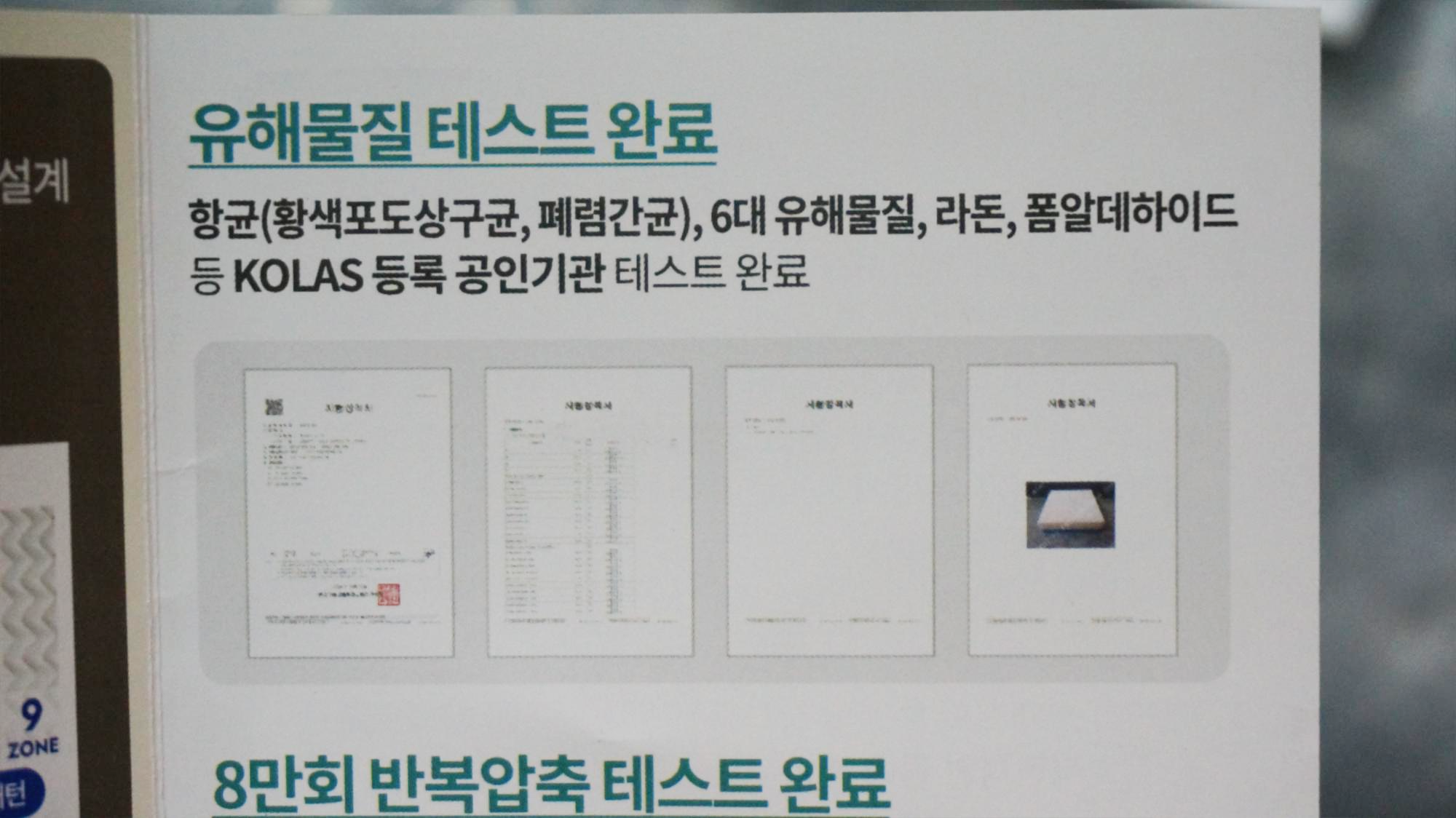 항균(황색포도상구균, 폐렴간균), 6대 유해물질, 라돈, 폼알데하이드 등 공인기관의 테스트를 완료 했다고 하더군요.