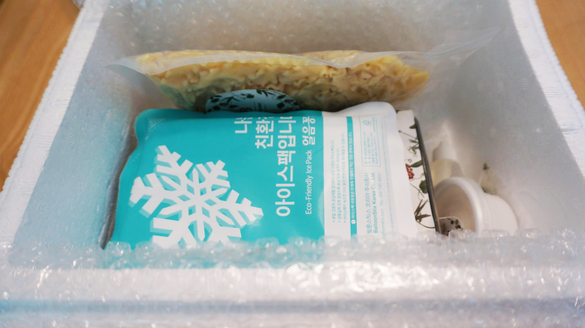 식품의 신선도가 떨어지지 않도록 아이스팩도 하나 꽝꽝 얼려진 상태로 들어있었어요.