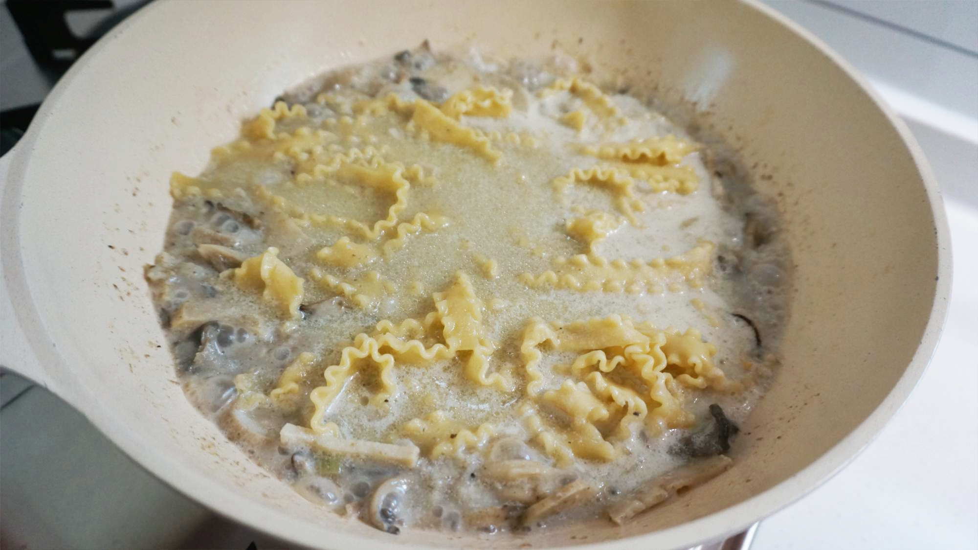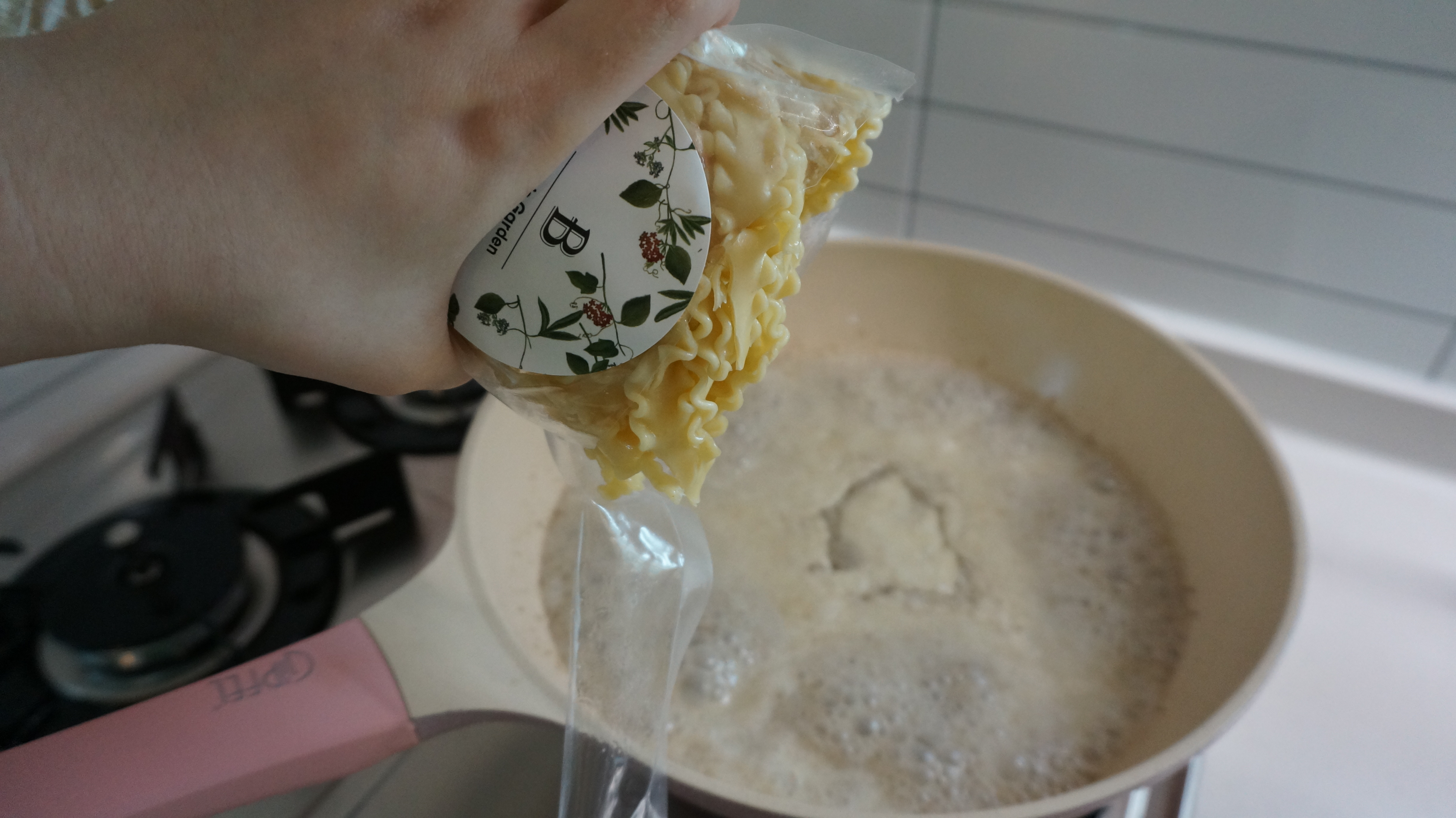 소스가 해동되면 중불에 놓고 끓인 후에 마팔디네 면을 넣어줬어요.