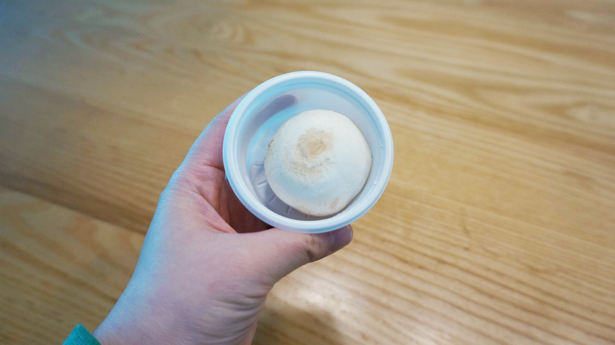 플라스틱 포장용기에 크림 소스가 들어있어요.