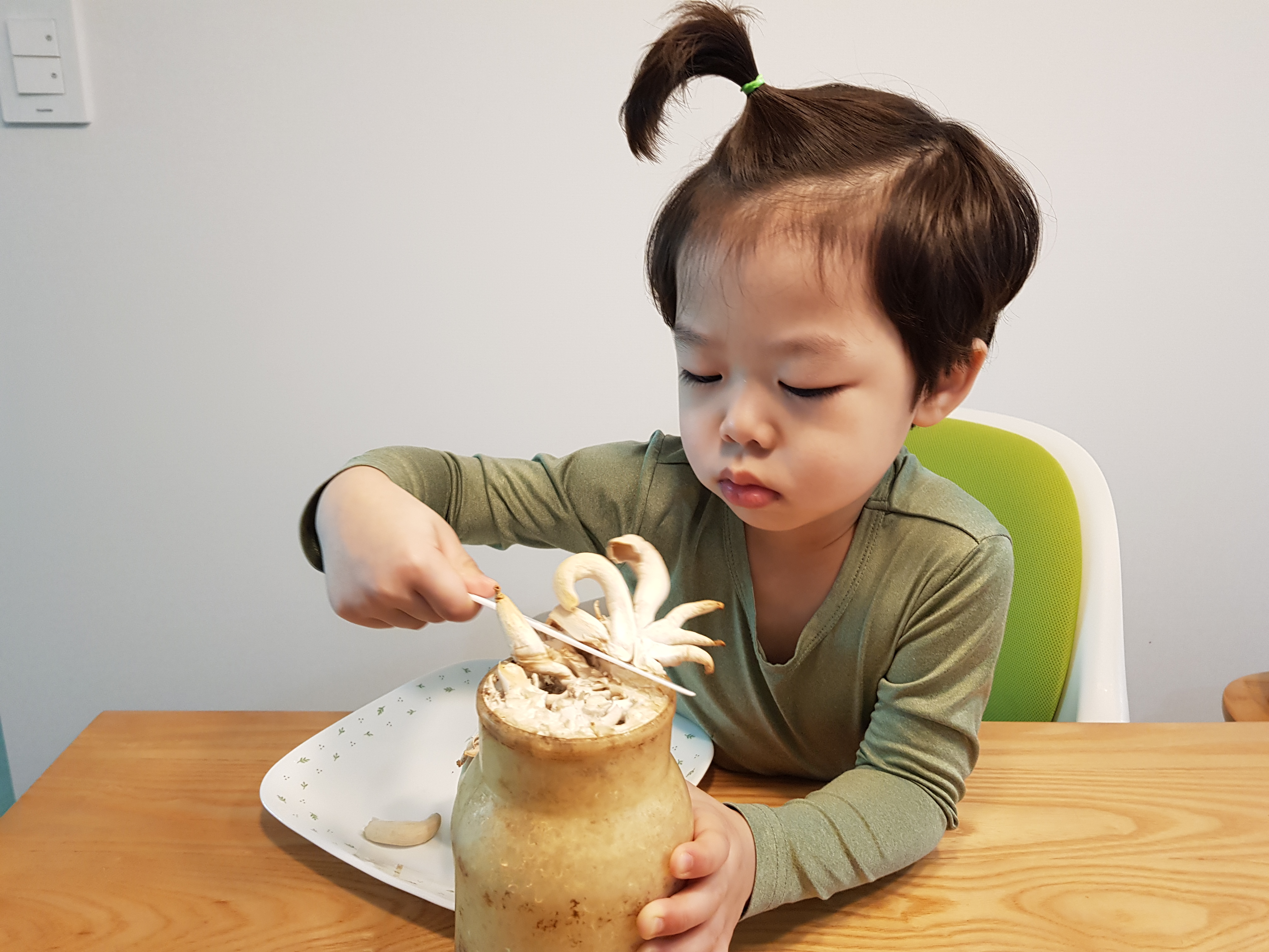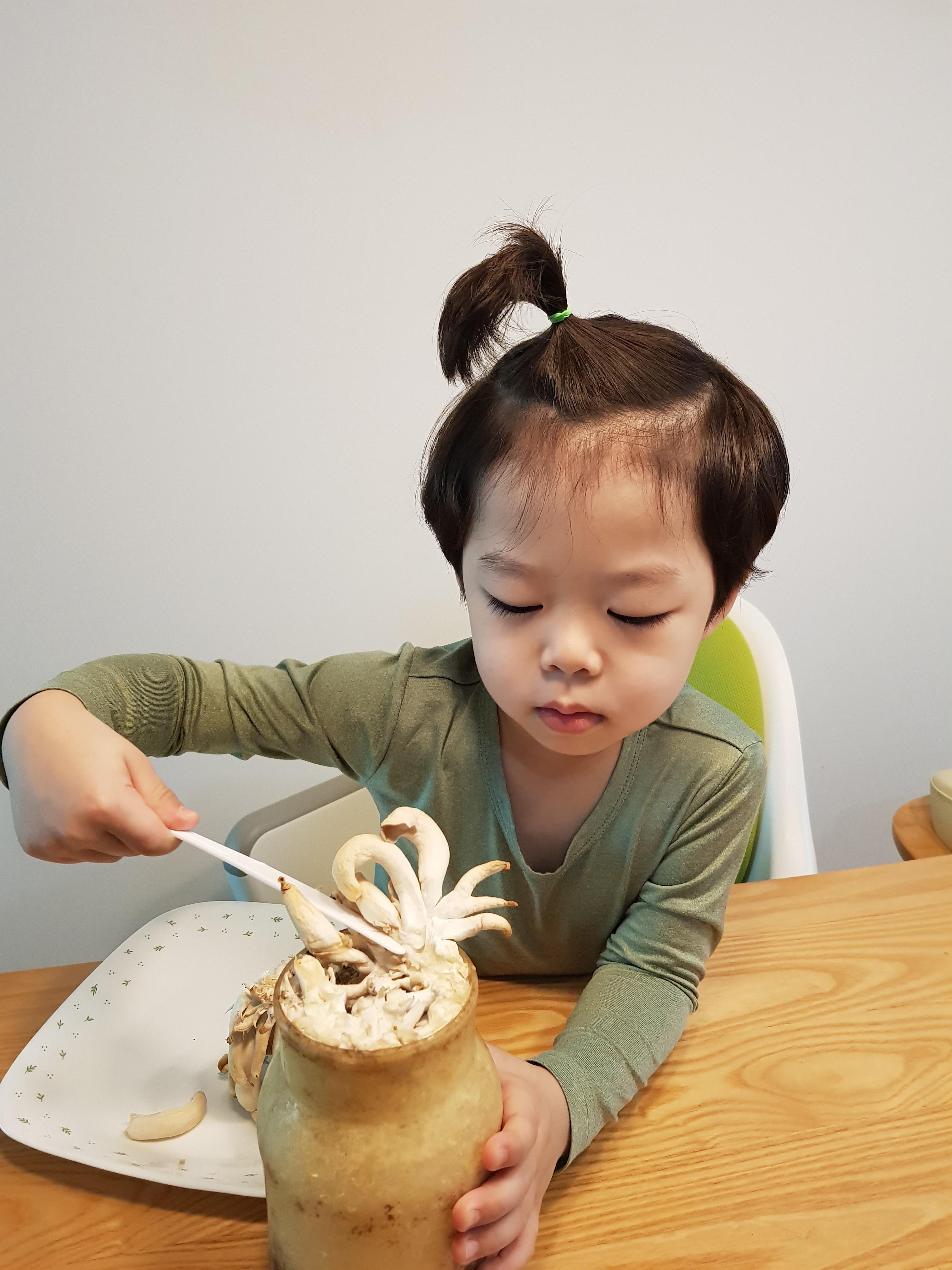동글이는 소꿉놀이 할 때 쓰는 숟가락으로 살살 긁어내주었답니다.