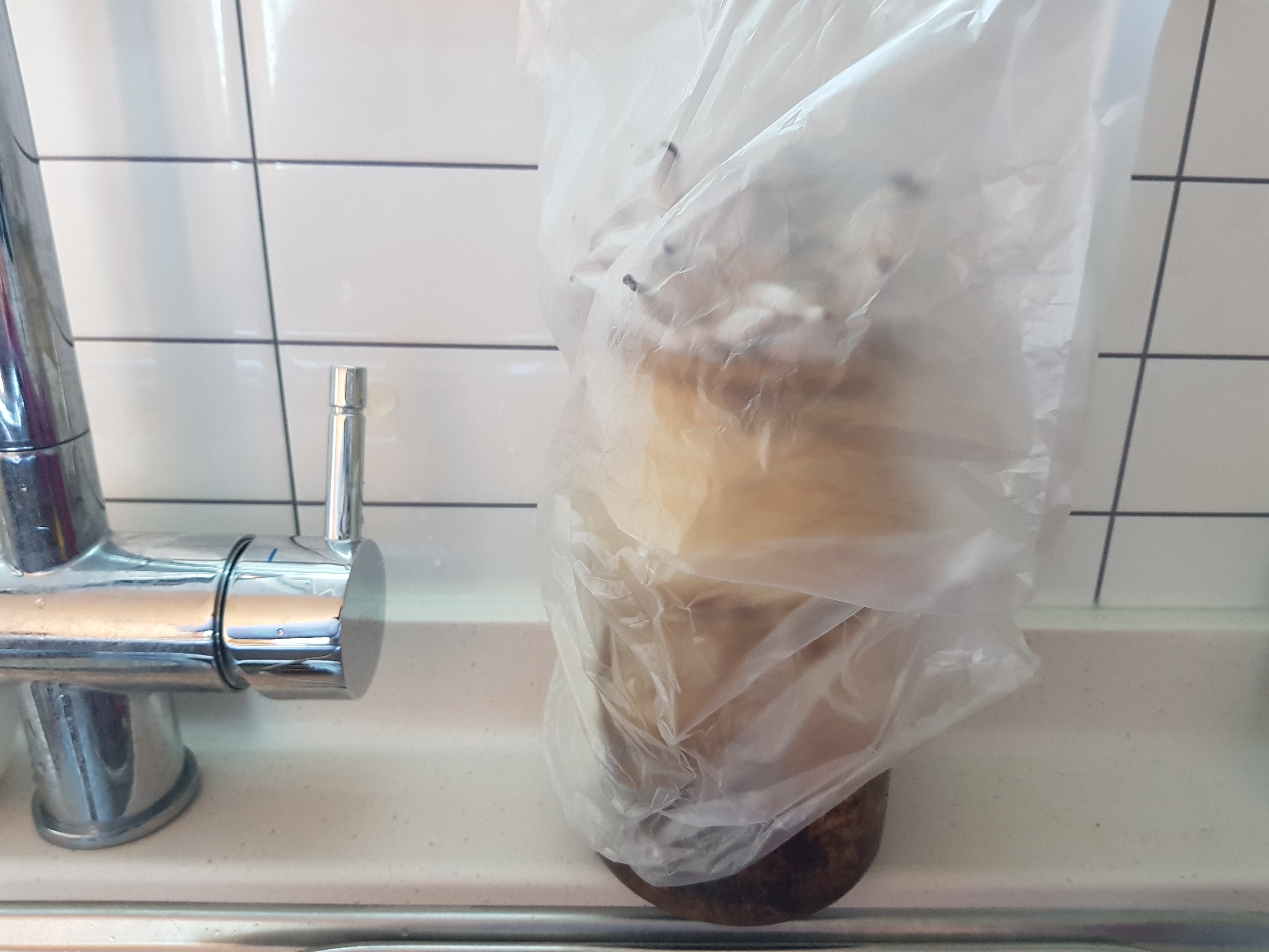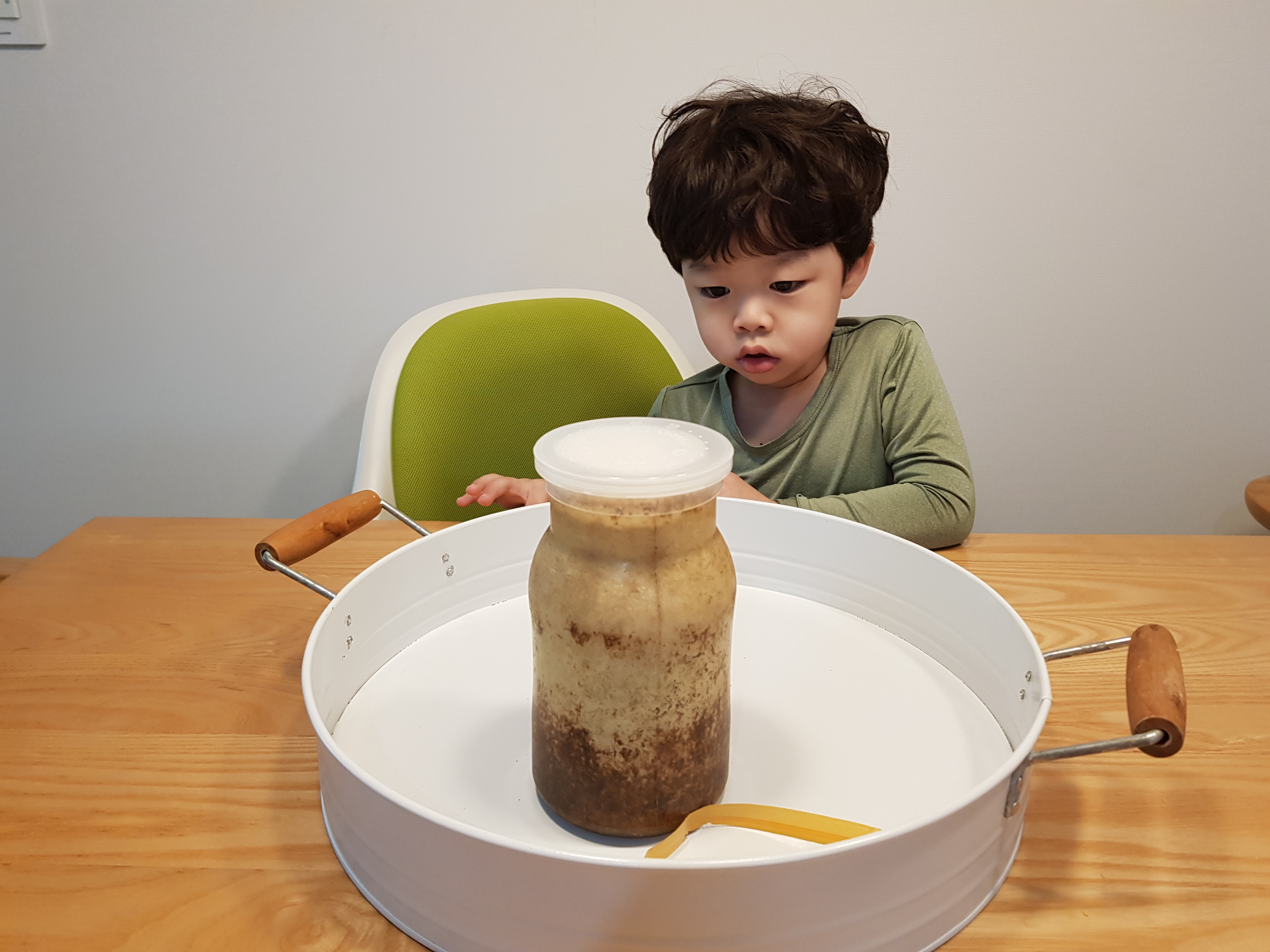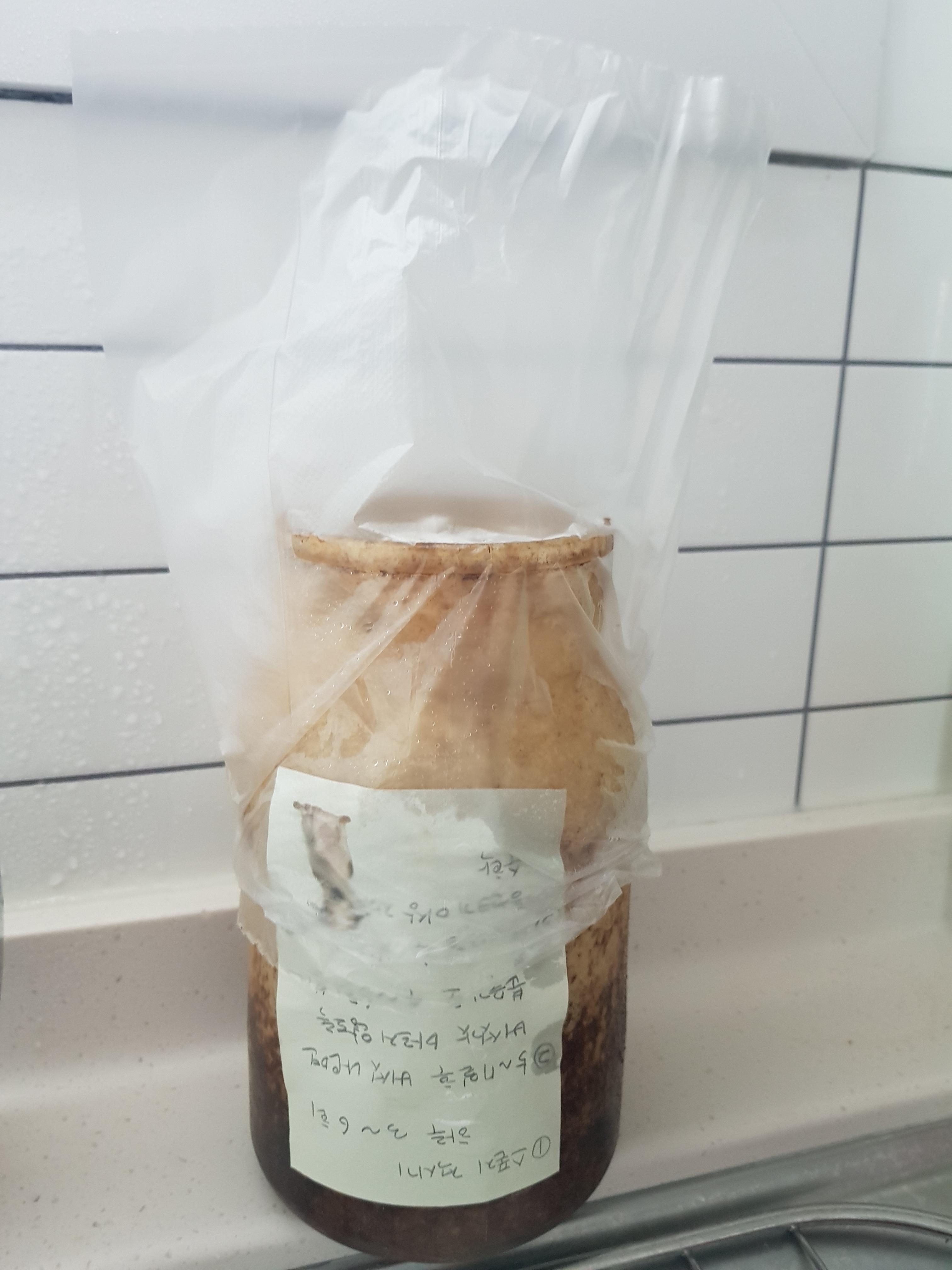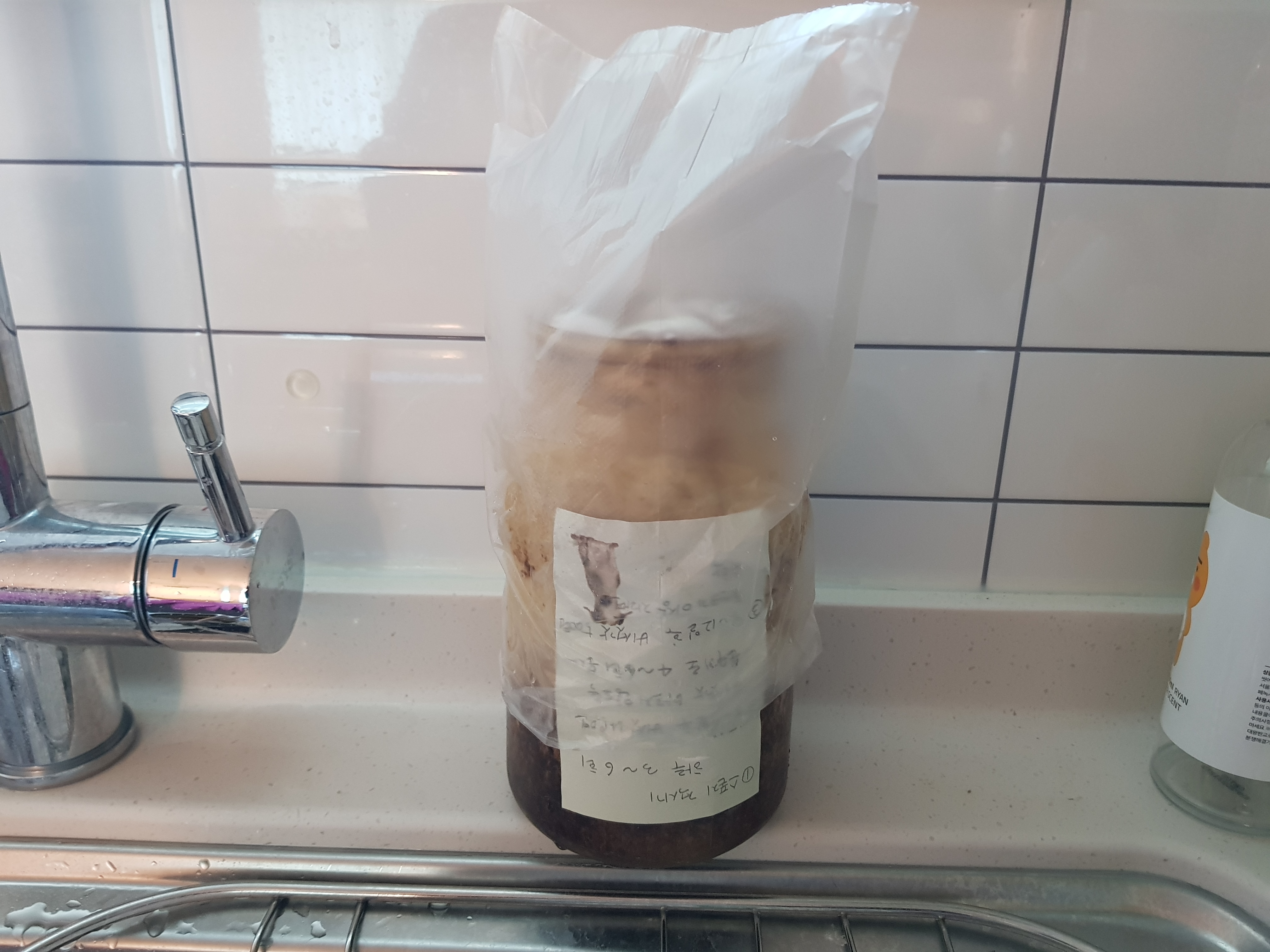 병뚜껑을 열고 하얀 노화균 포면을 숟가락으로 1cm정도 긁어주기