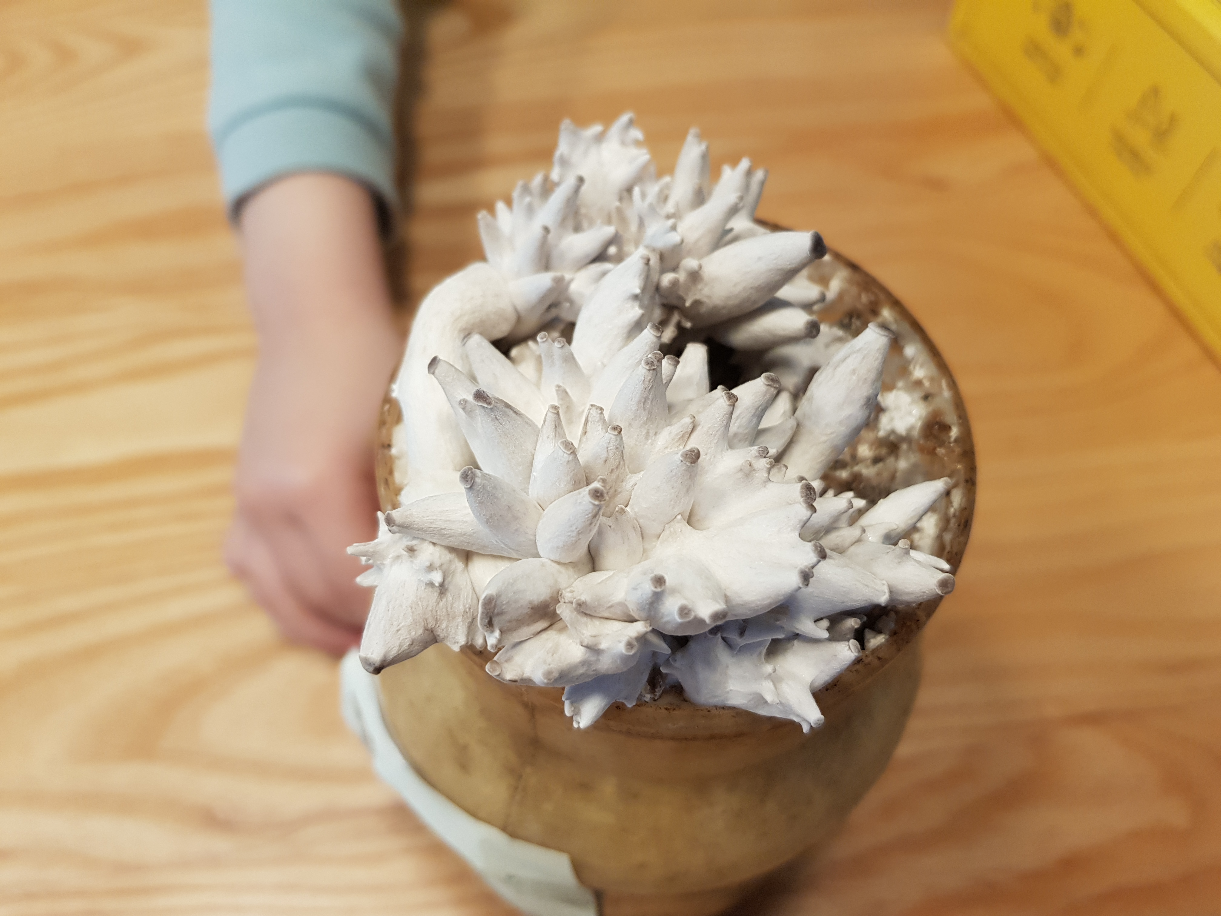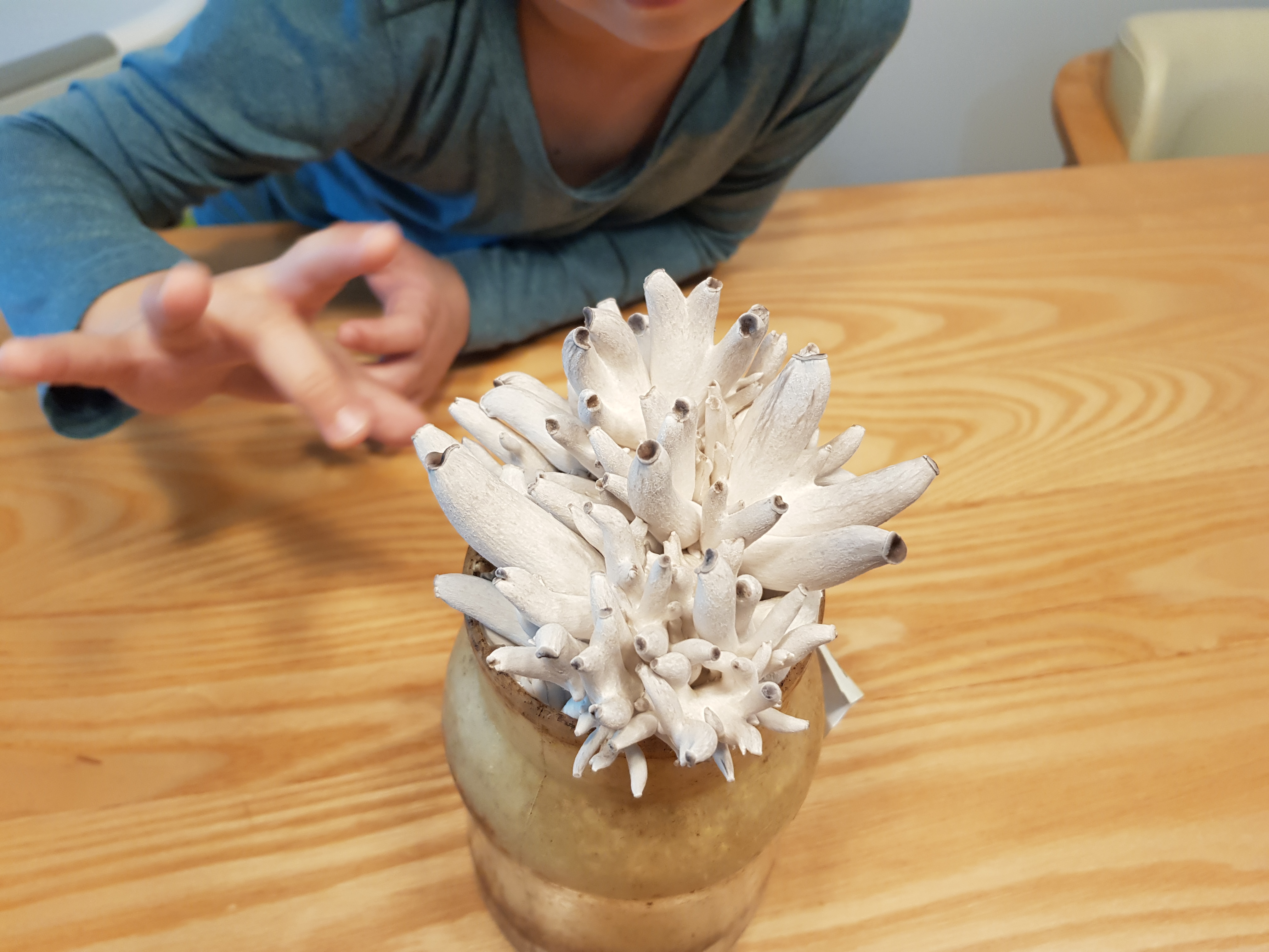 설명에는 버섯 아랫부분을 잡고 좌우로 젖혀 빼면 된다고 나와있었는데 저는 톱밥도 귀찮고 해서 동글이에게 빵칼 주고 잘라 수확하도록 했어요.