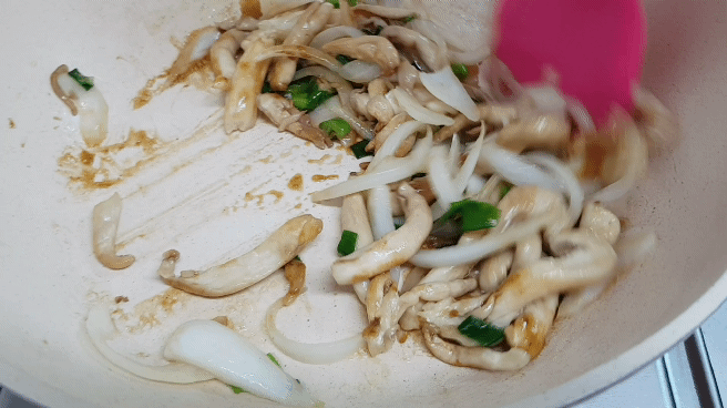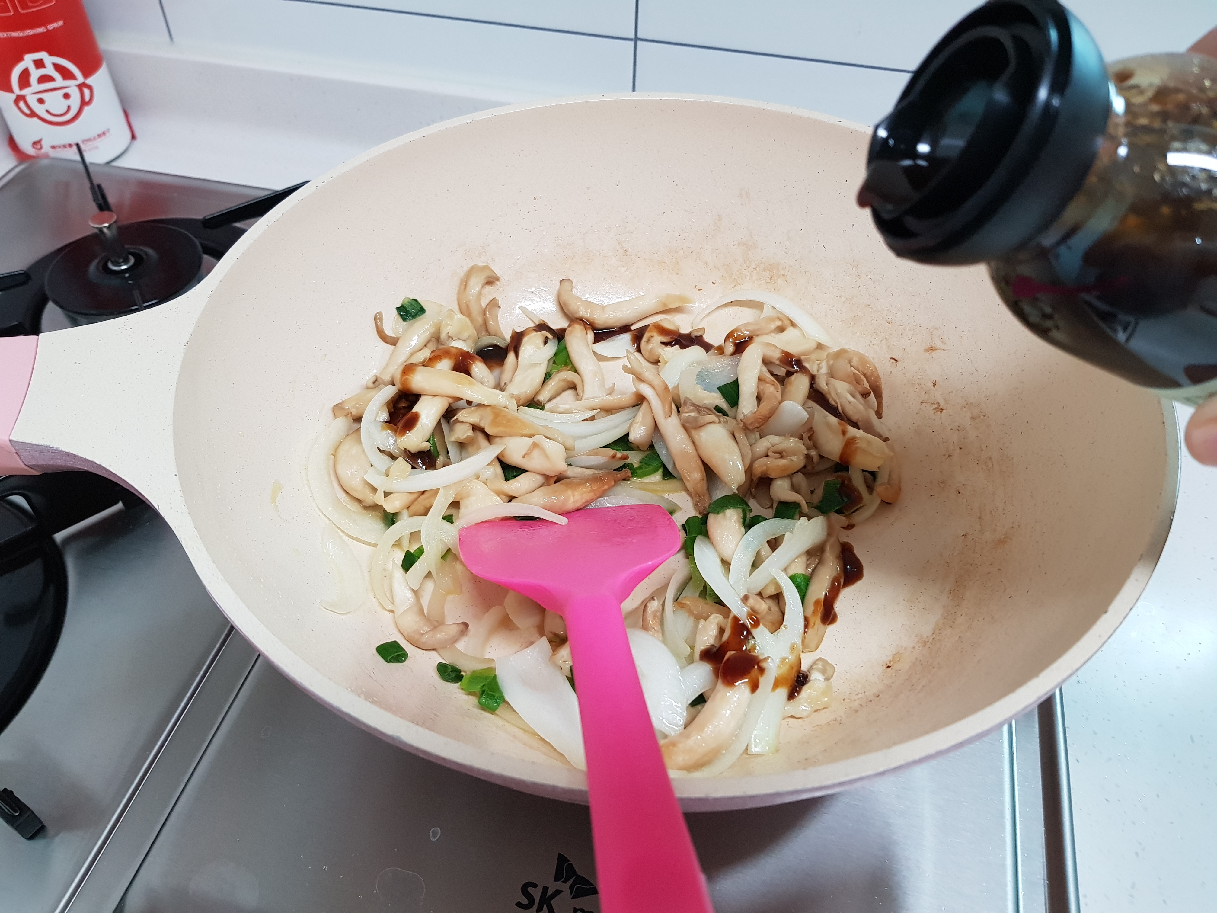 버섯볶음 양념으로는 새미네부엌 쇠고기야채잡채소스 휘리릭 둘러 신나게 볶아볶아 주었어요.