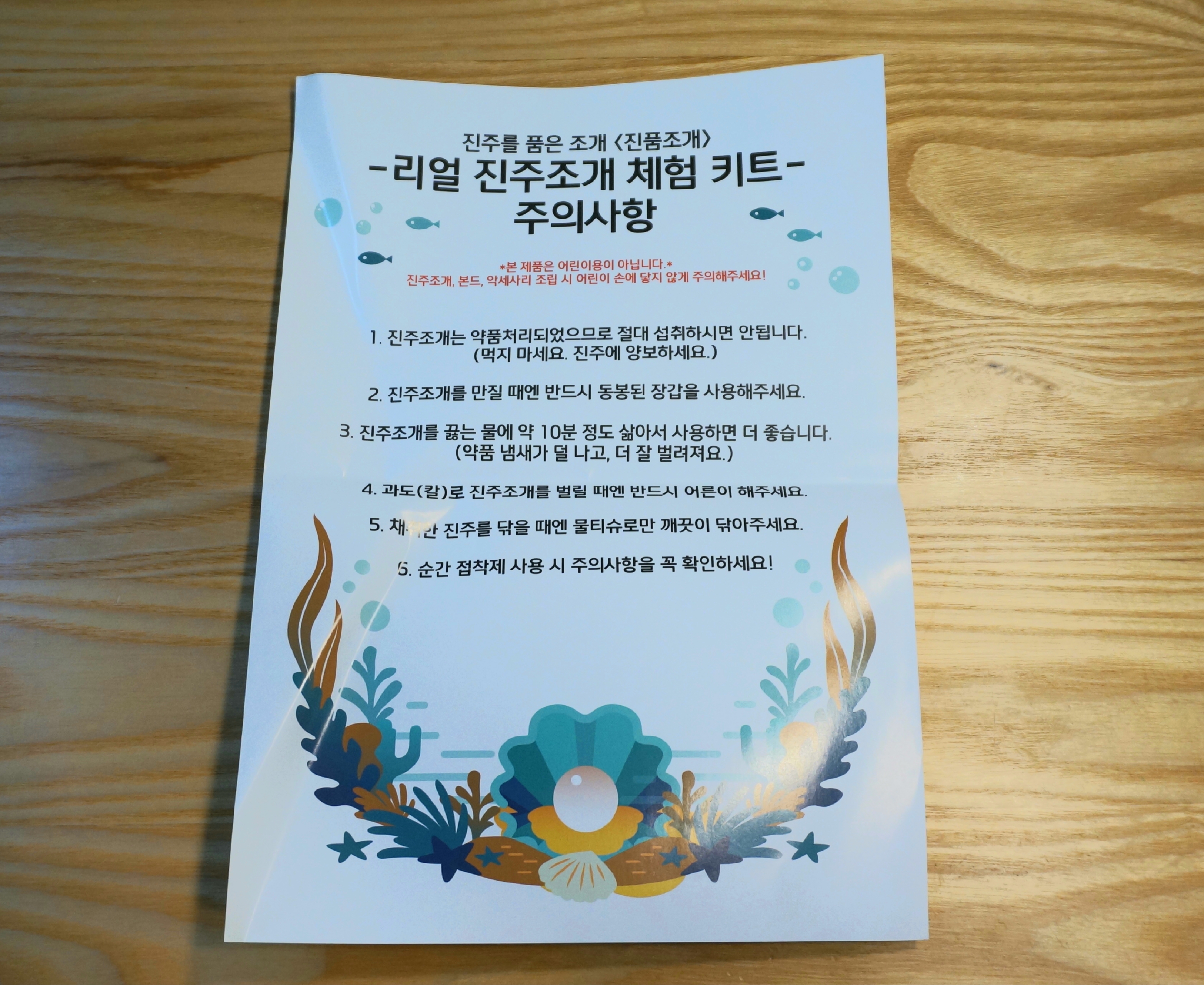 칼로 진주조개 벌릴때에는 반드시 어른이 하고, 채취한 진주를 닦을 때에는 물티슈로만 닦아줘야 광택을 잃지 않아요.