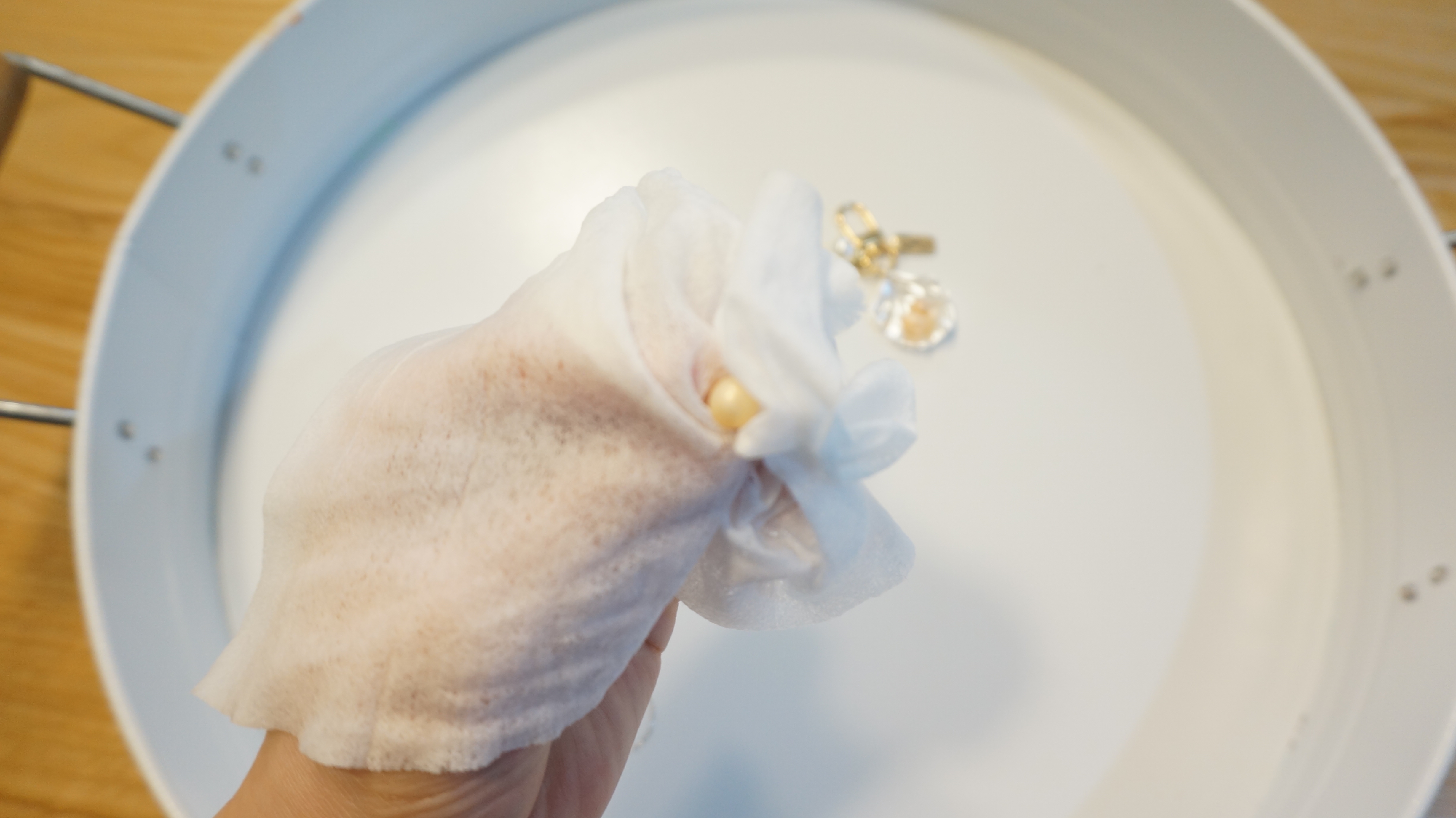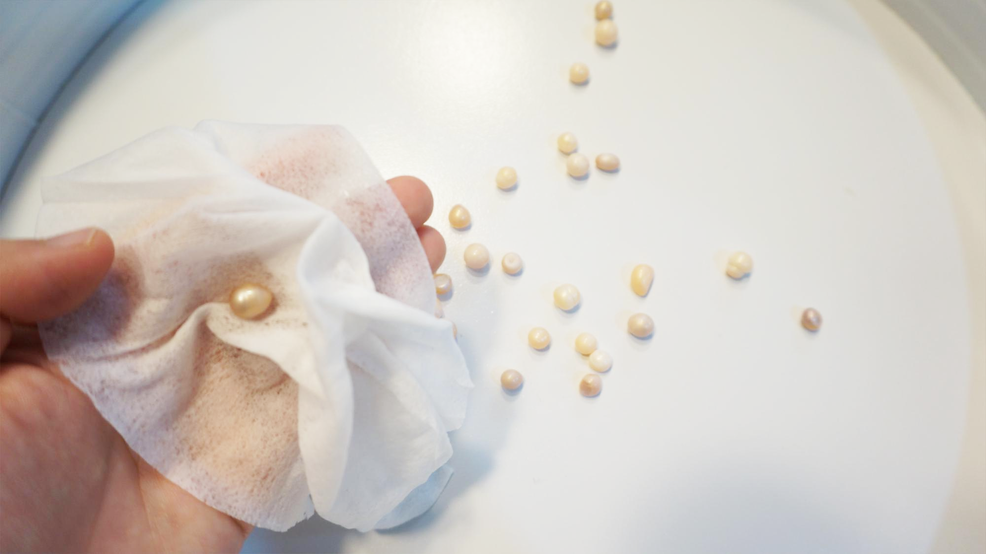 채취한 진주는 물에 씻으면 광택을 잃을 수 있어 물티슈로 꼼꼼하게 닦아주었어요.