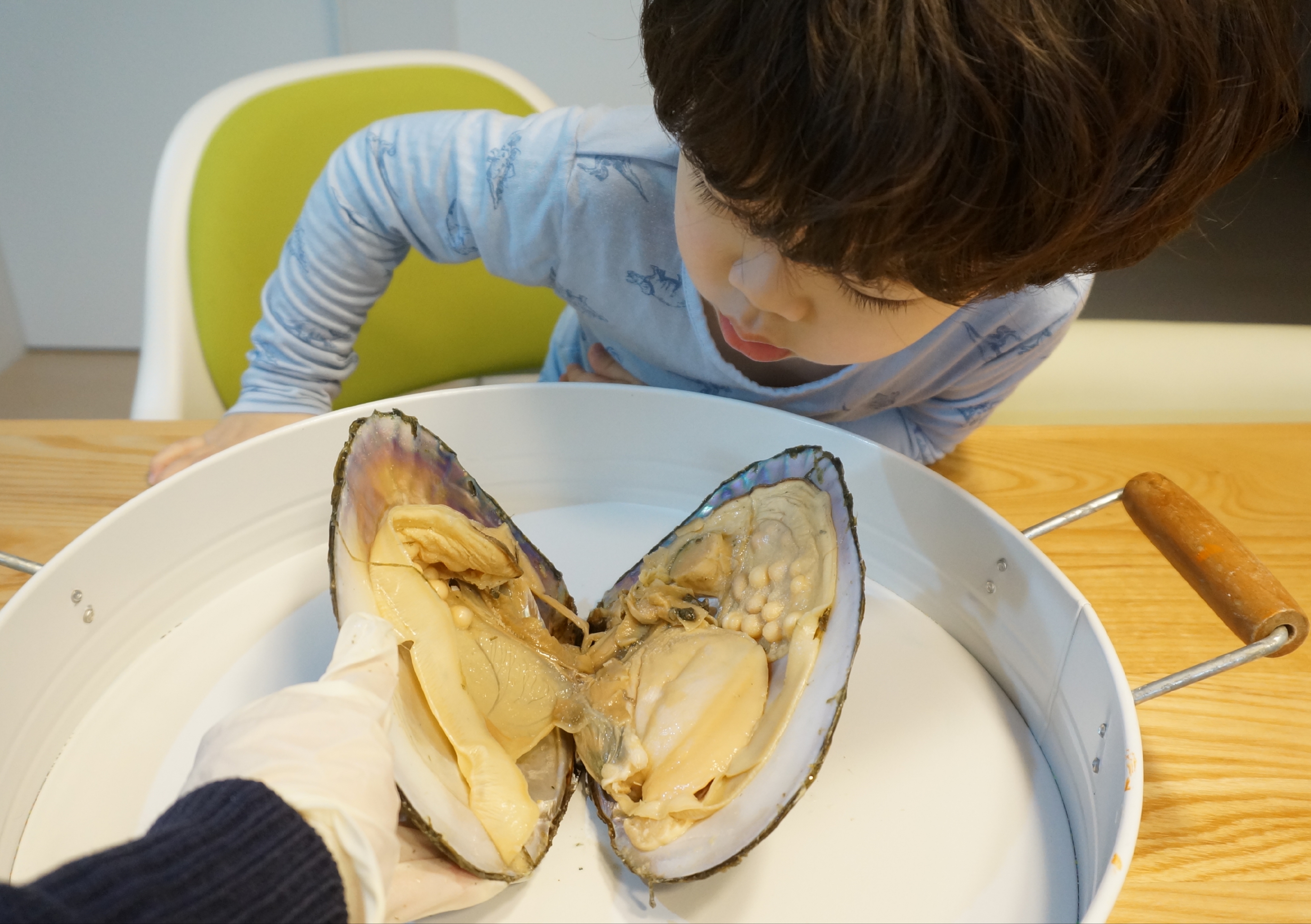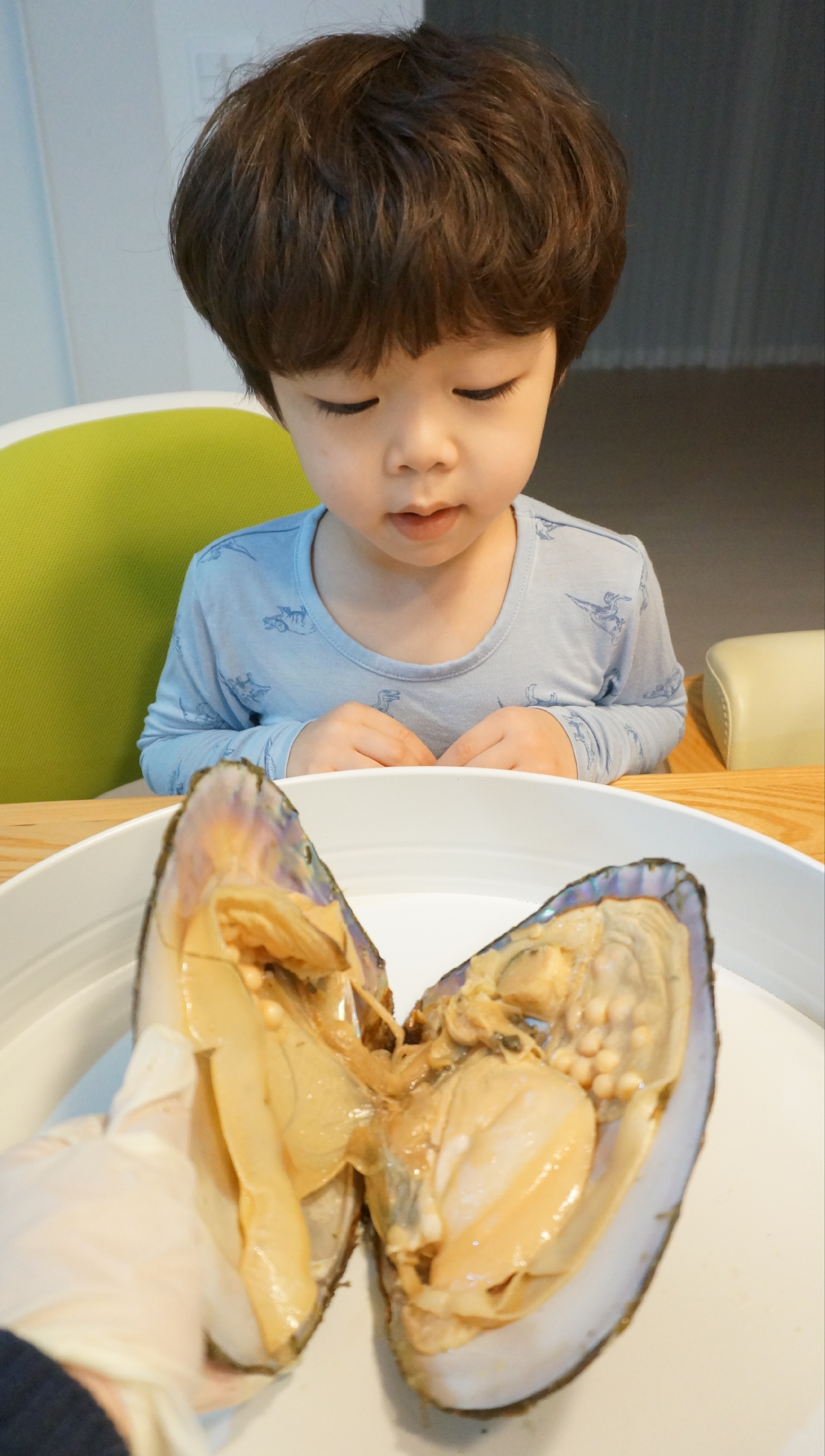 진주조개 체험키트는 어린이용이 아니기 때문에 동글이와 함께 해볼까 고민하다가 진주를 품은 조개의 모습을 보여주고 싶어서 진주채취까지만 같이 해보았어요.