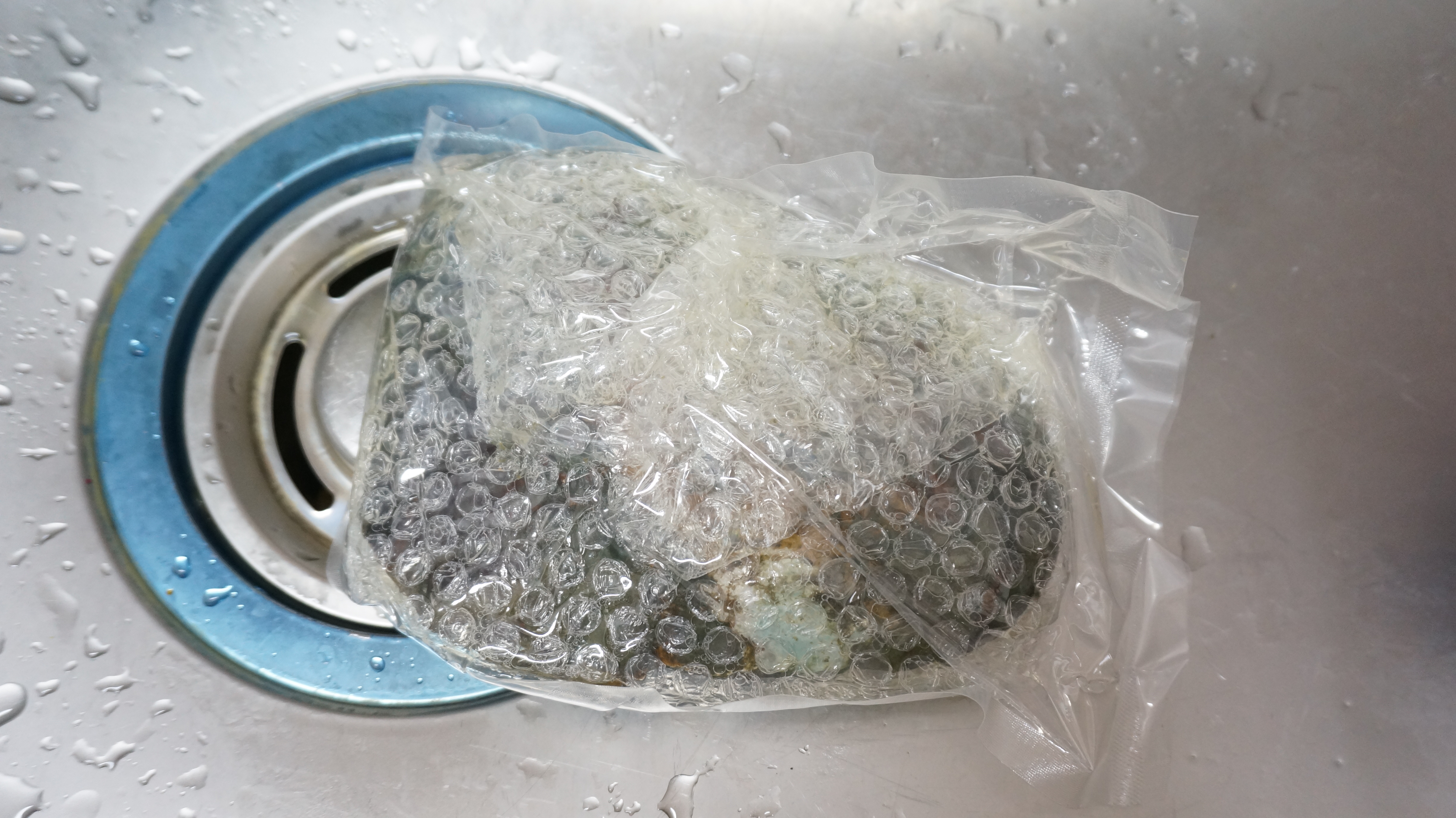 진주조개는 이렇게 밀봉되어 있어서 싱크대에서 개봉했어요.