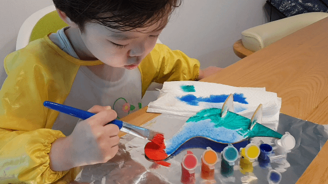 동글이는 빨리 꾸미고 싶은데 물감이 축축하다며 불평하길래 드라이기로 말려주었어요.