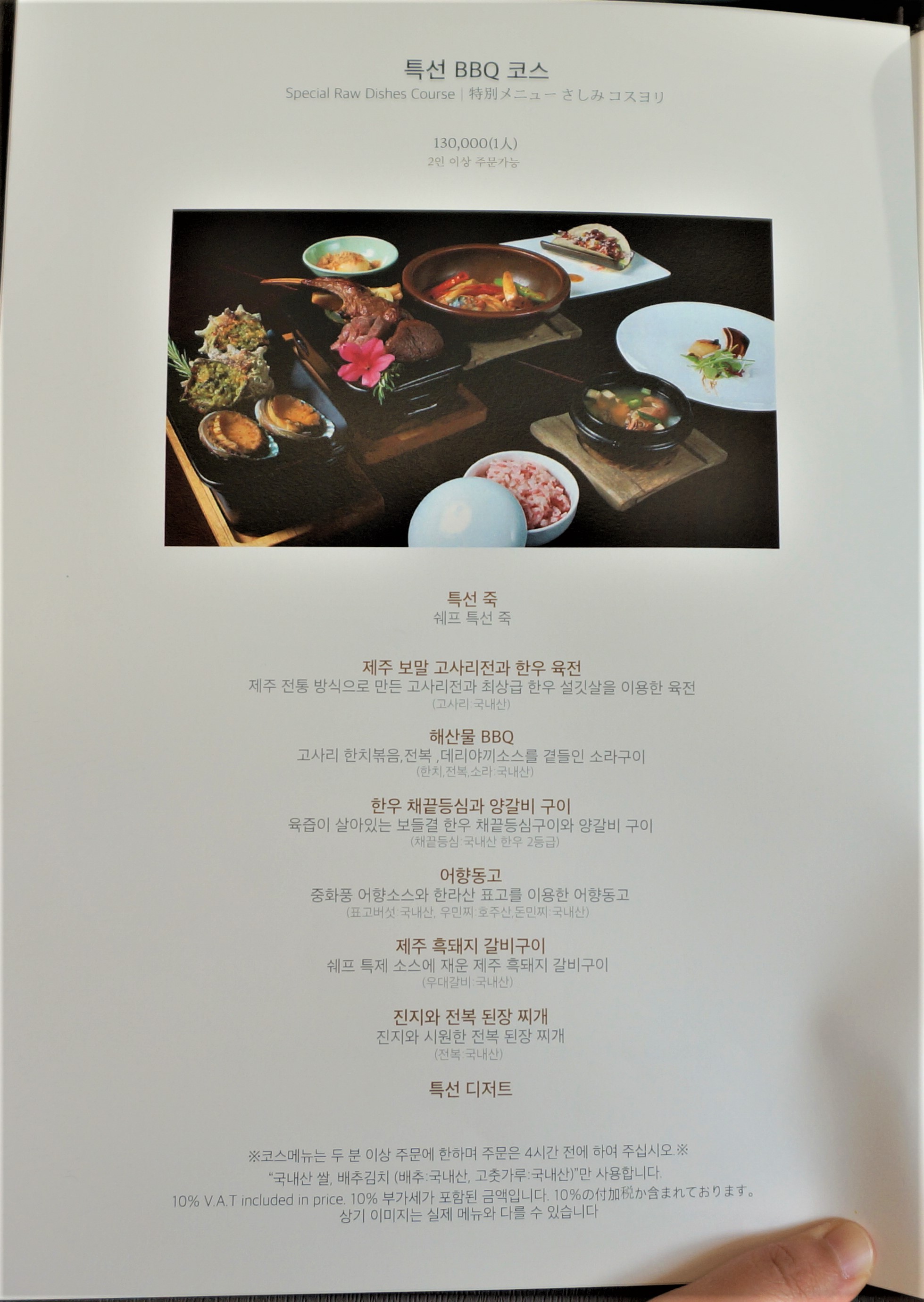 특선 bbq코스는 메뉴판에 이렇게 나와있었는데 제가 식사했던 날은 구성이 죽대신 세비체가 나왔고 된장찌개 대신 전복물회가 나왔어요.