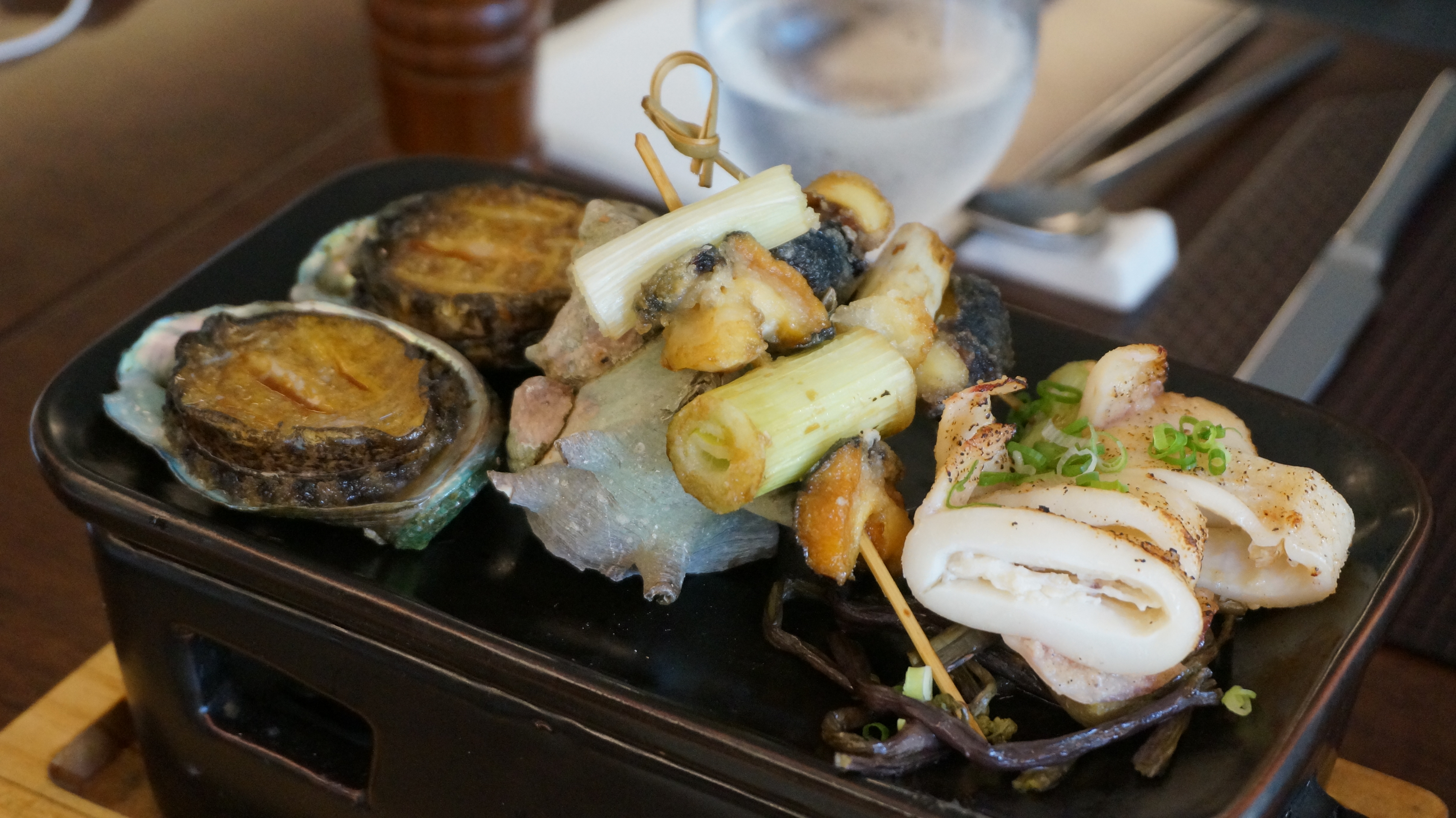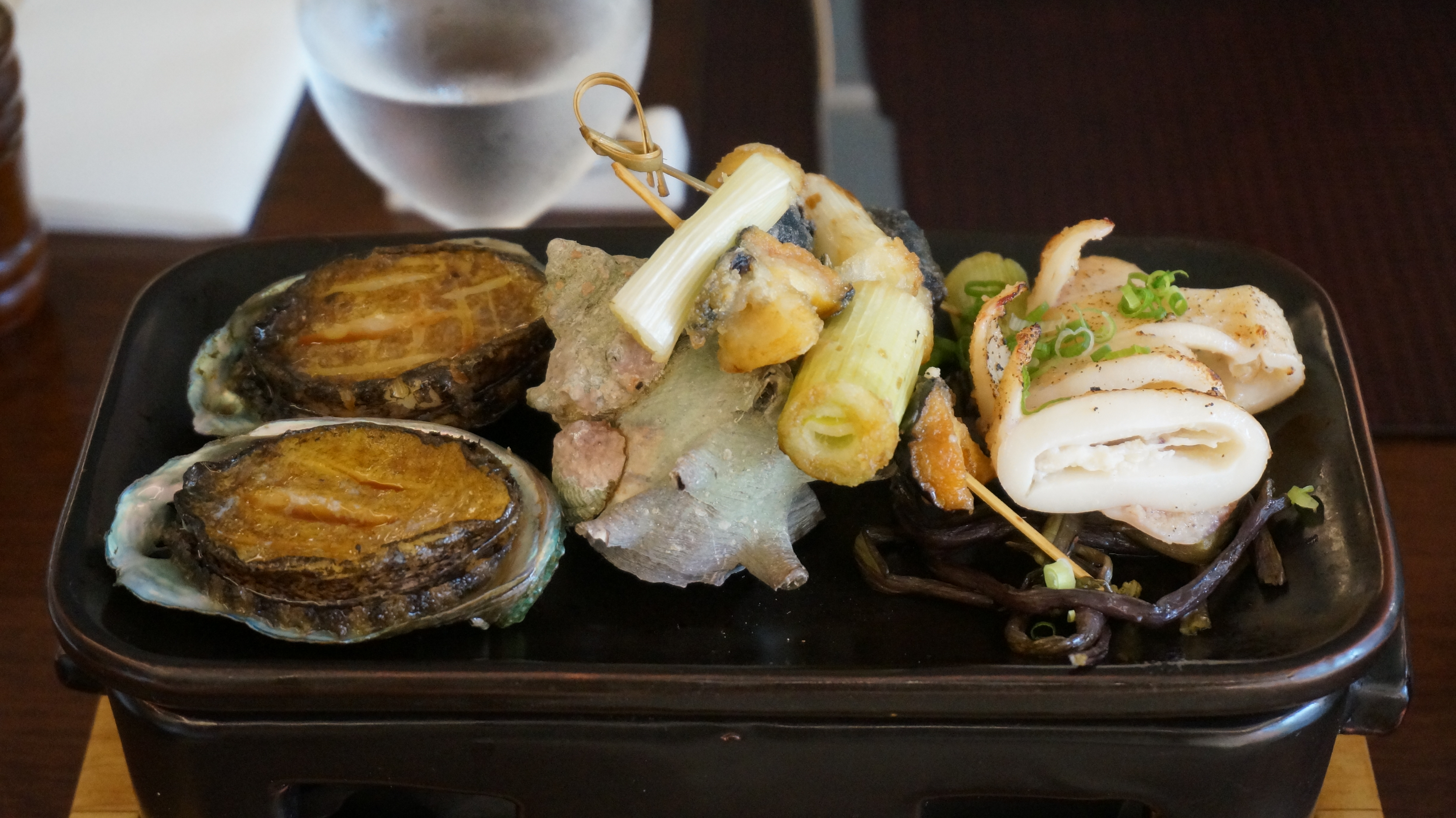 전복구이, 데리야끼소스를 곁들인 소라구이, 고사리한치볶음이 나왔어요.