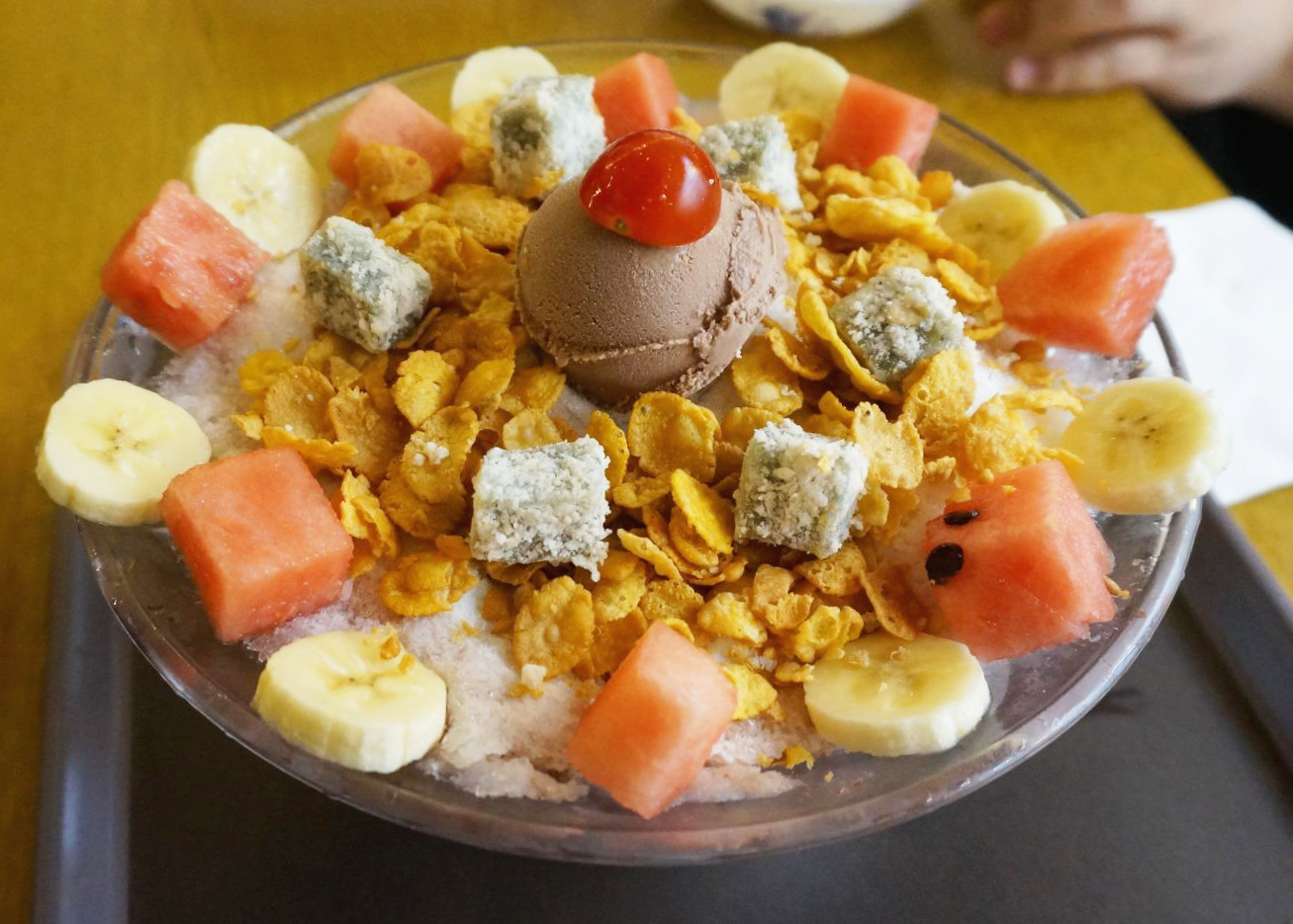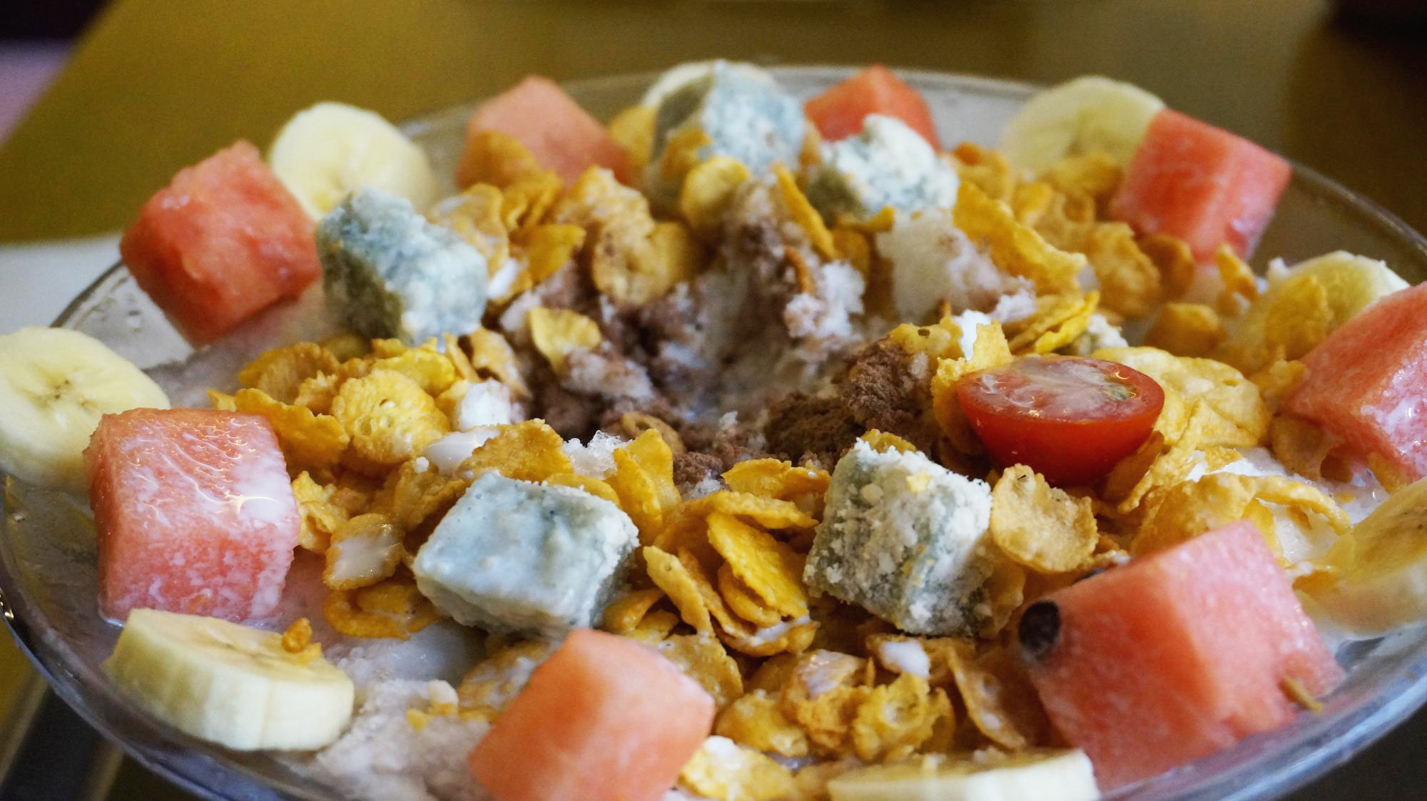 토핑으로는 바나나, 수박, 콘프레이크, 찰떡, 초코아이스크림, 방울토마토가 올라가 있었어요.