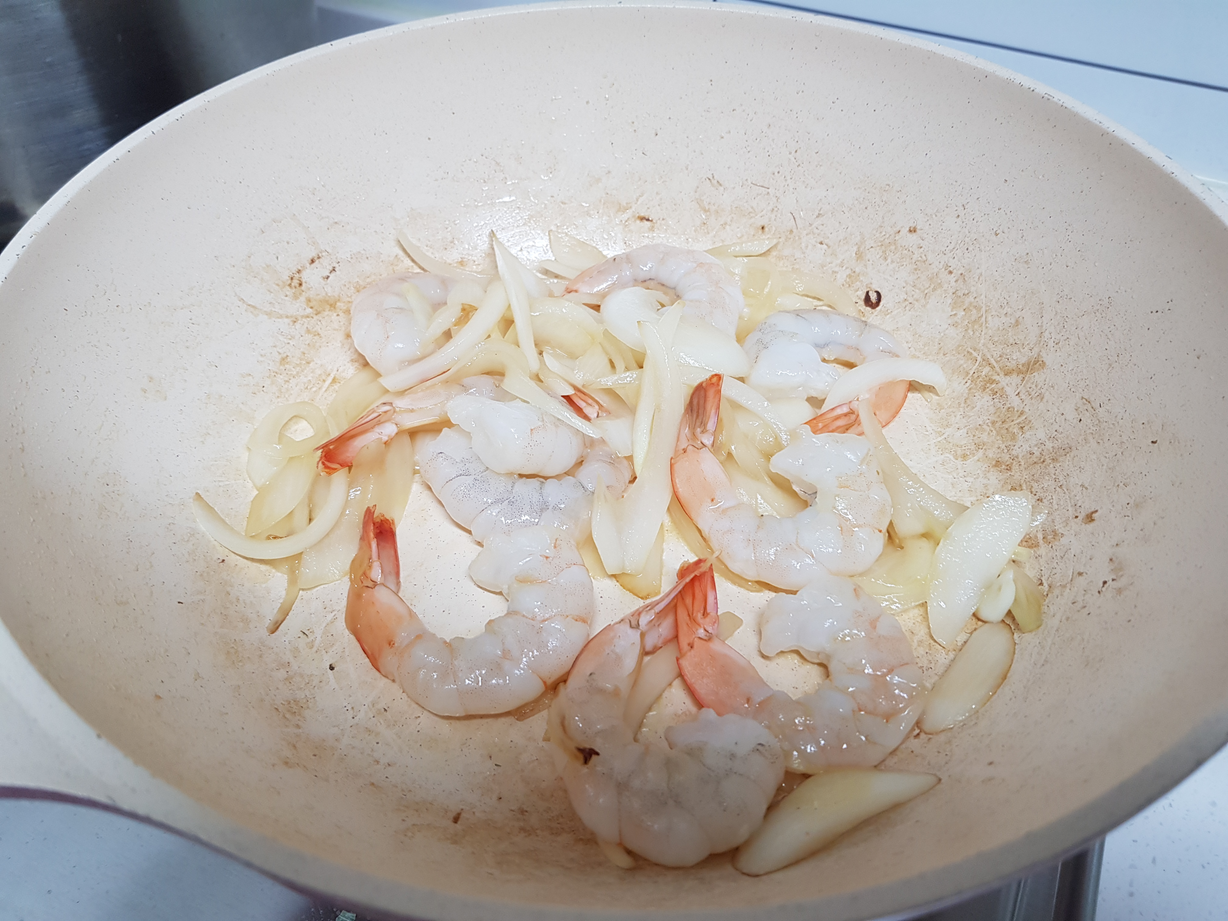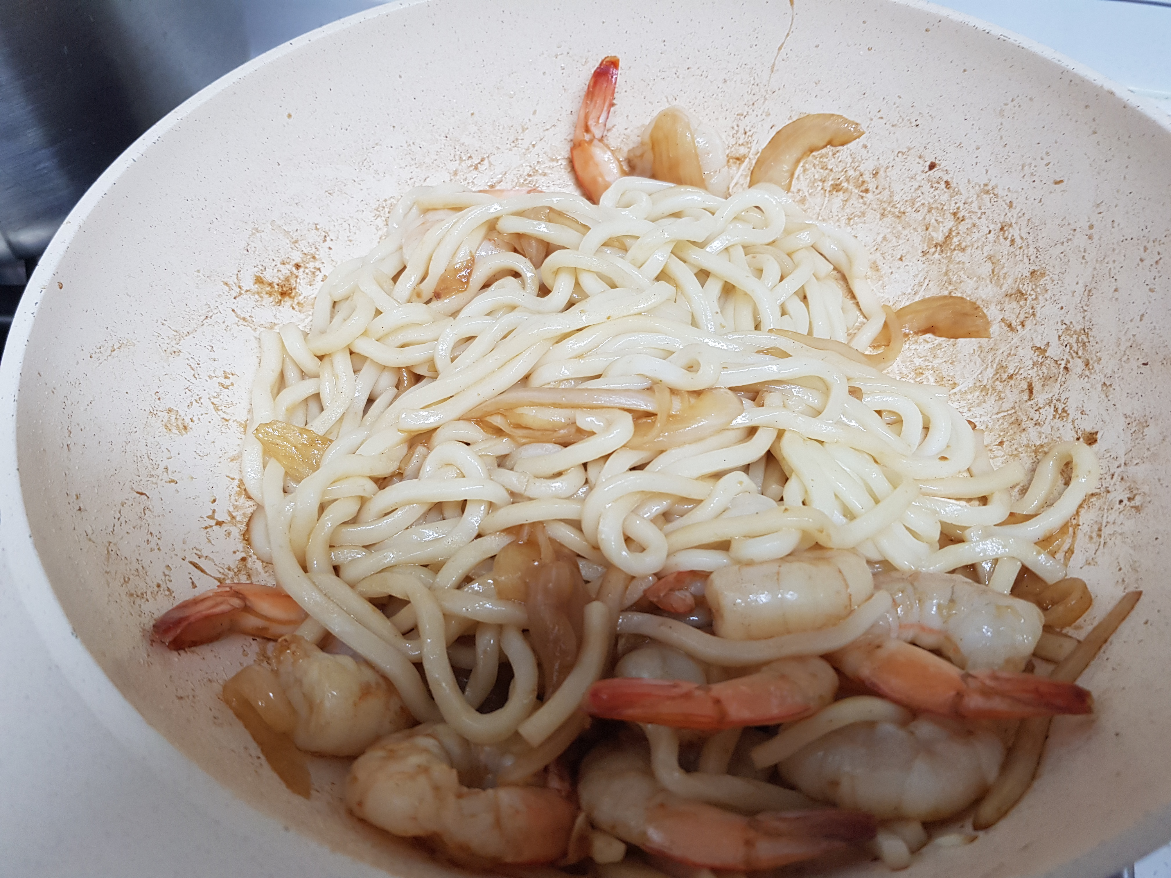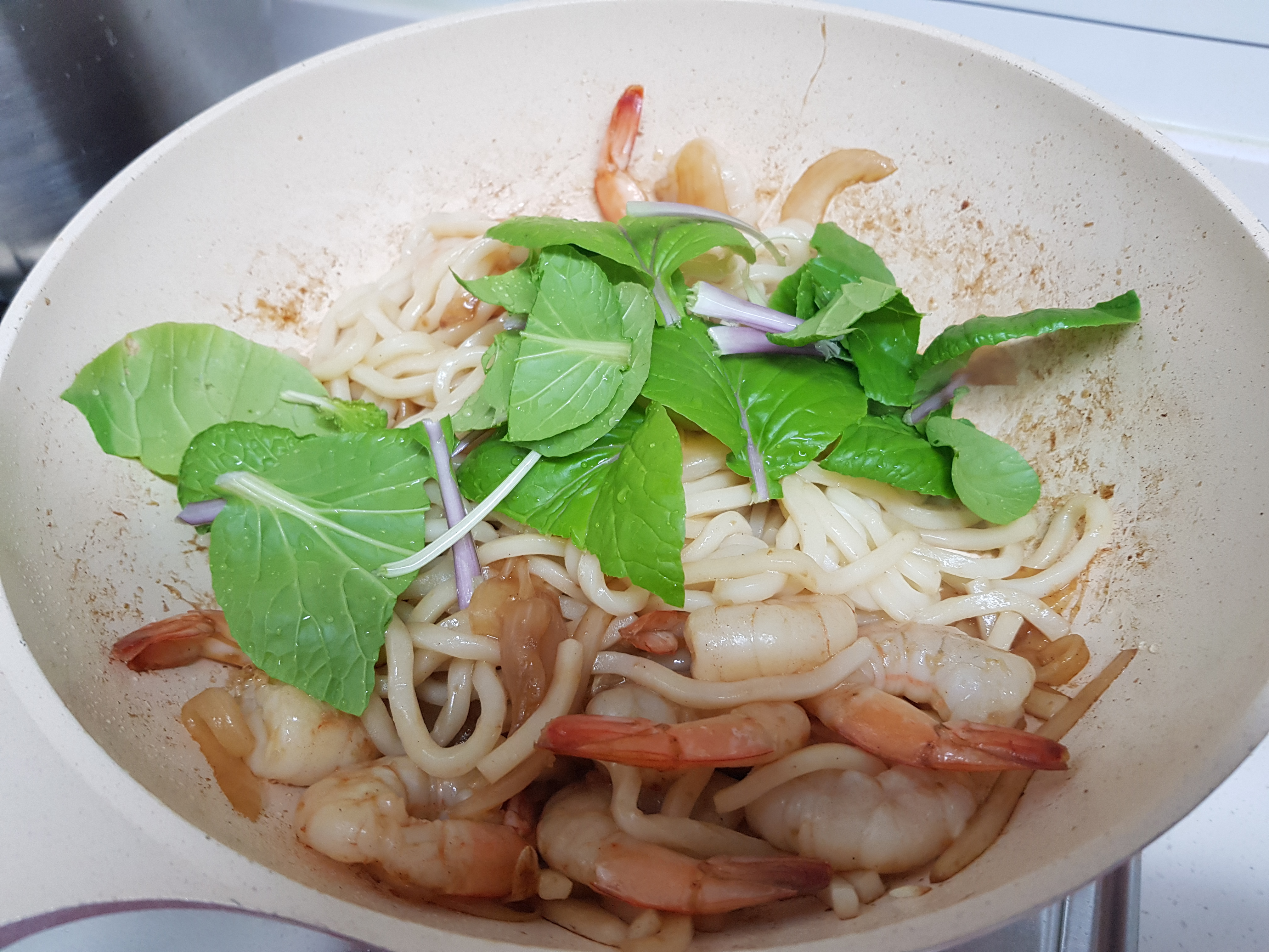 먹음직스러운 새우청경채 볶음우동이 완성되었어요.