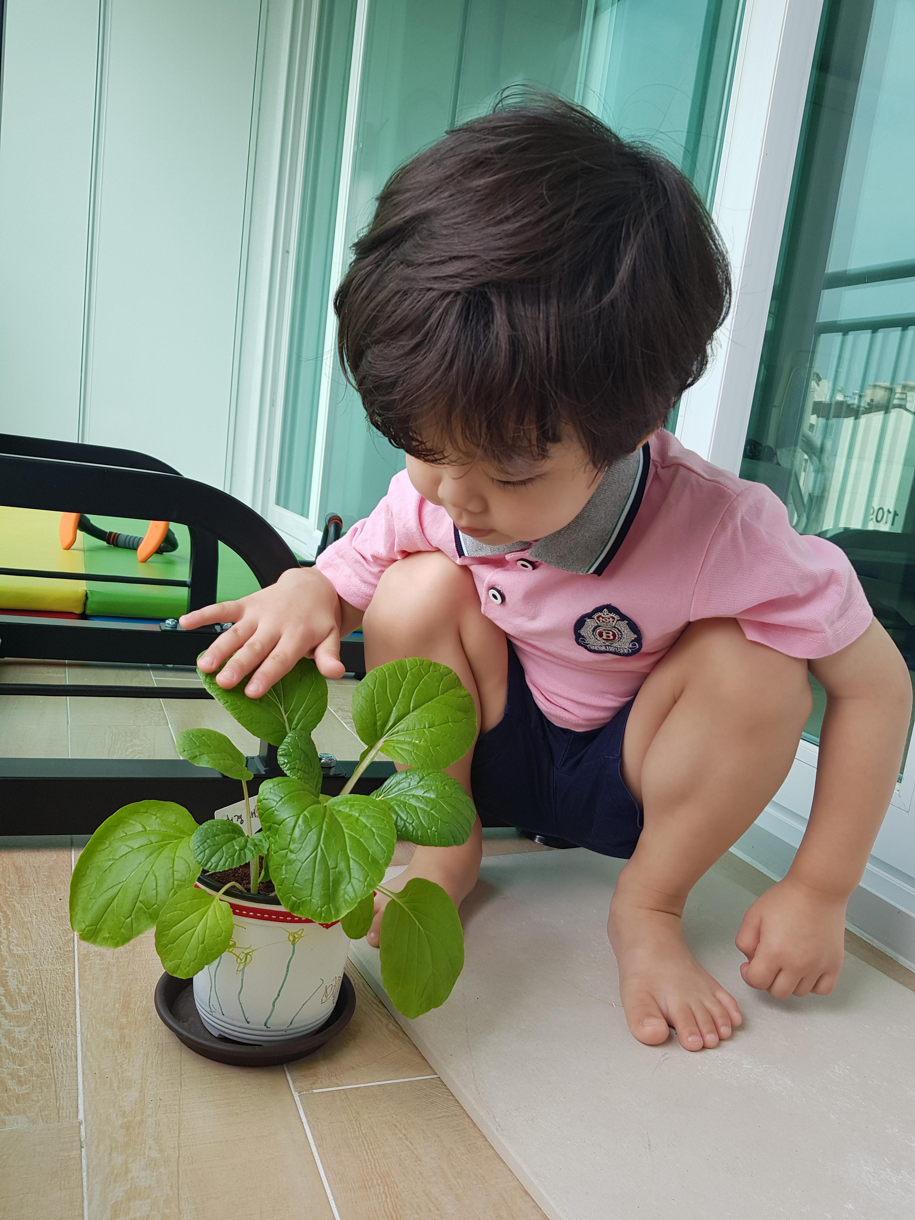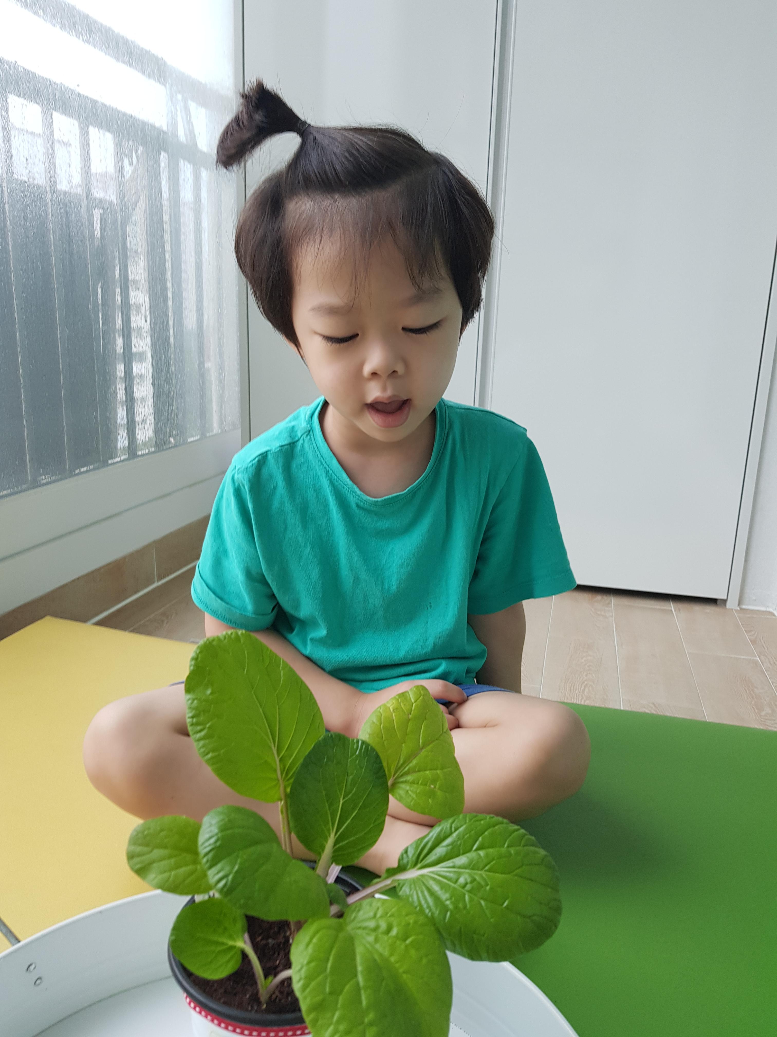 어린이집 등원하기 전에 청경채에게 잘 자라라고 힘내라고 응원해주는 동글이 모습이예요.