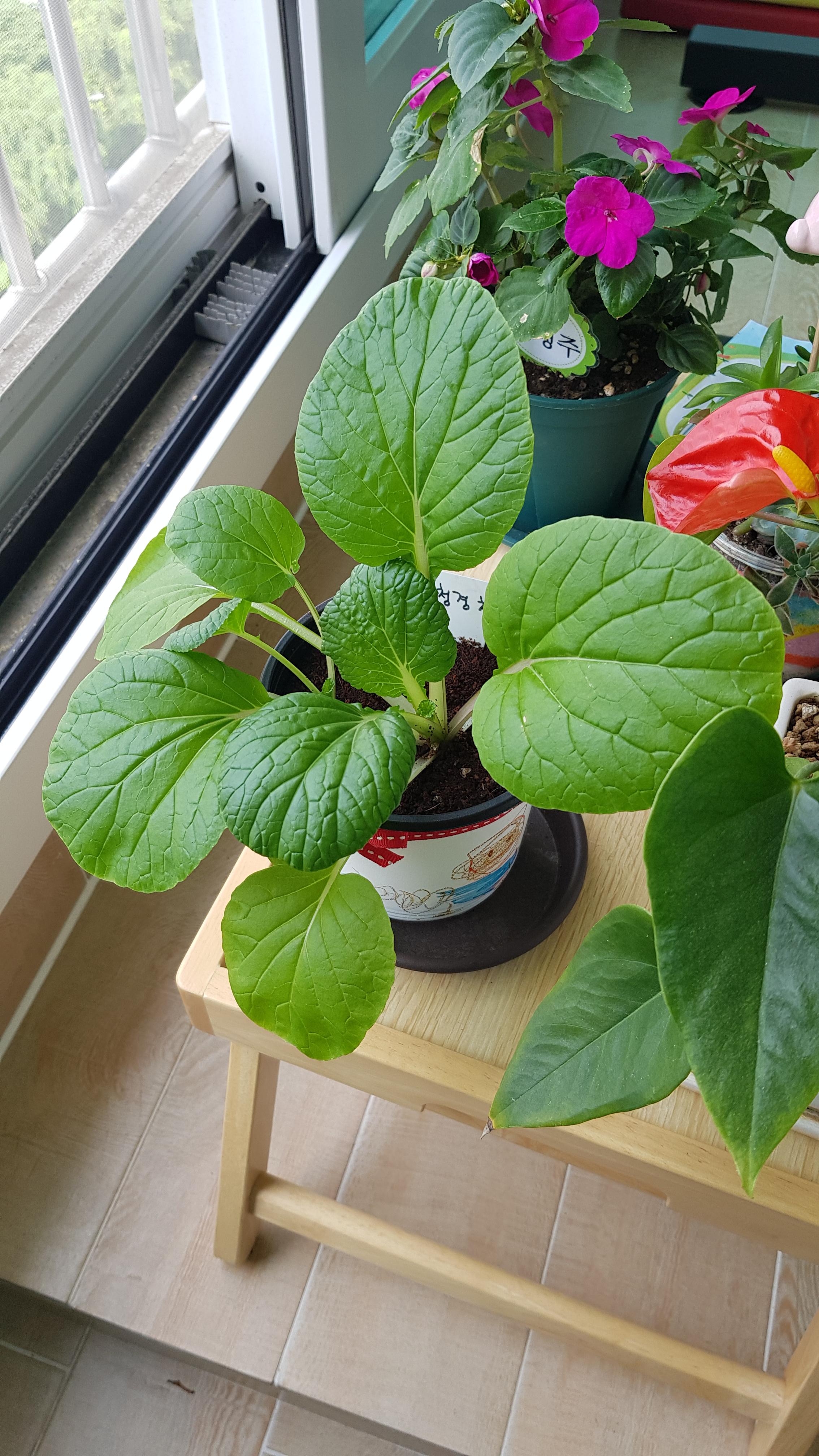 햇빛을 더 잘 보고 자라는 큰 청경채는 잎사귀가 큼직큼직하게 자라는데 고 옆에 작은 녀석은 부실하더군요.