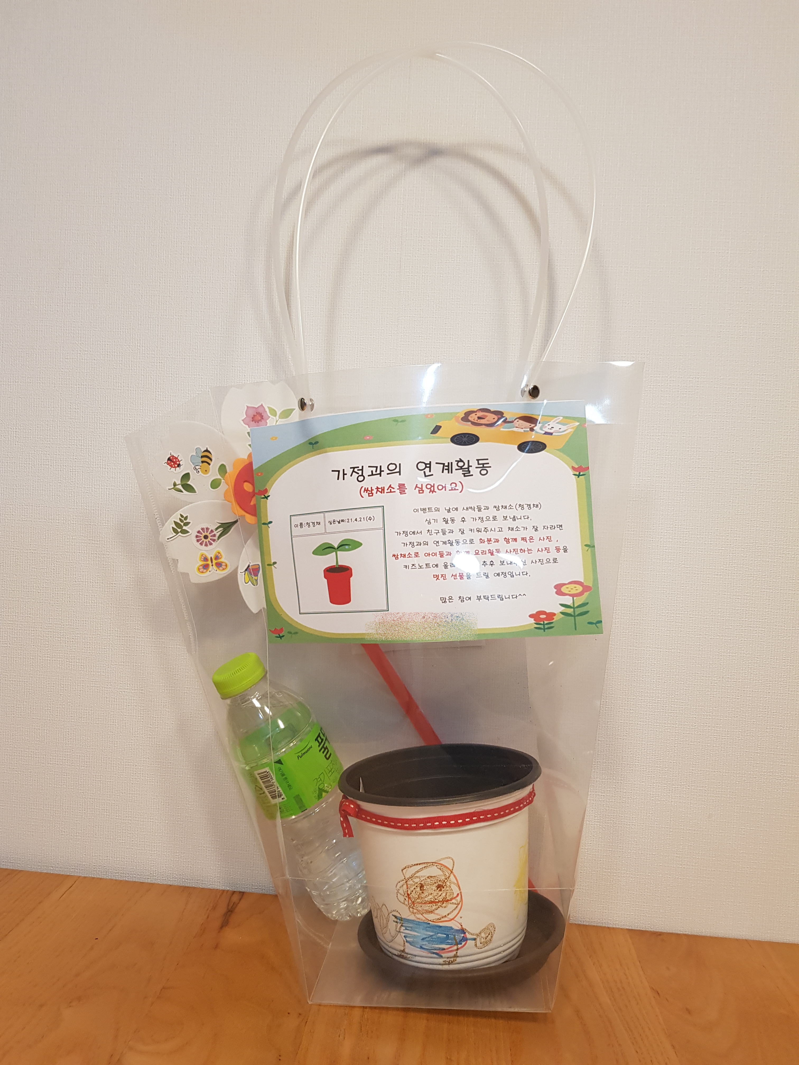 가정연계활동으로 화분과 함께 찍은 사진, 쌈채소로 요리활동 하는 사진 등을 키즈노트로 보내면 선물을 주신다고 나와있었어요.