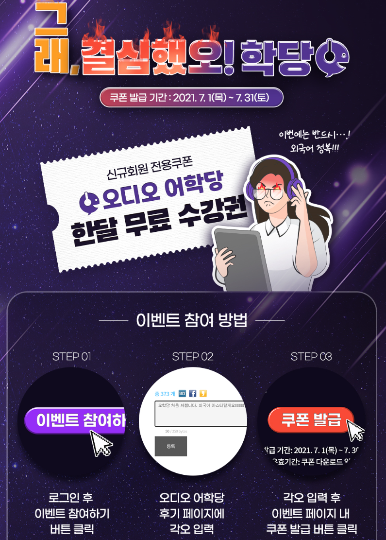 위 링크에서 참여하시면 되구요, 하루 선착순 100명씩 혜택이 주어진다고 하니 이번 기회에 오디오어학당 이용해보시길 바랄게요.