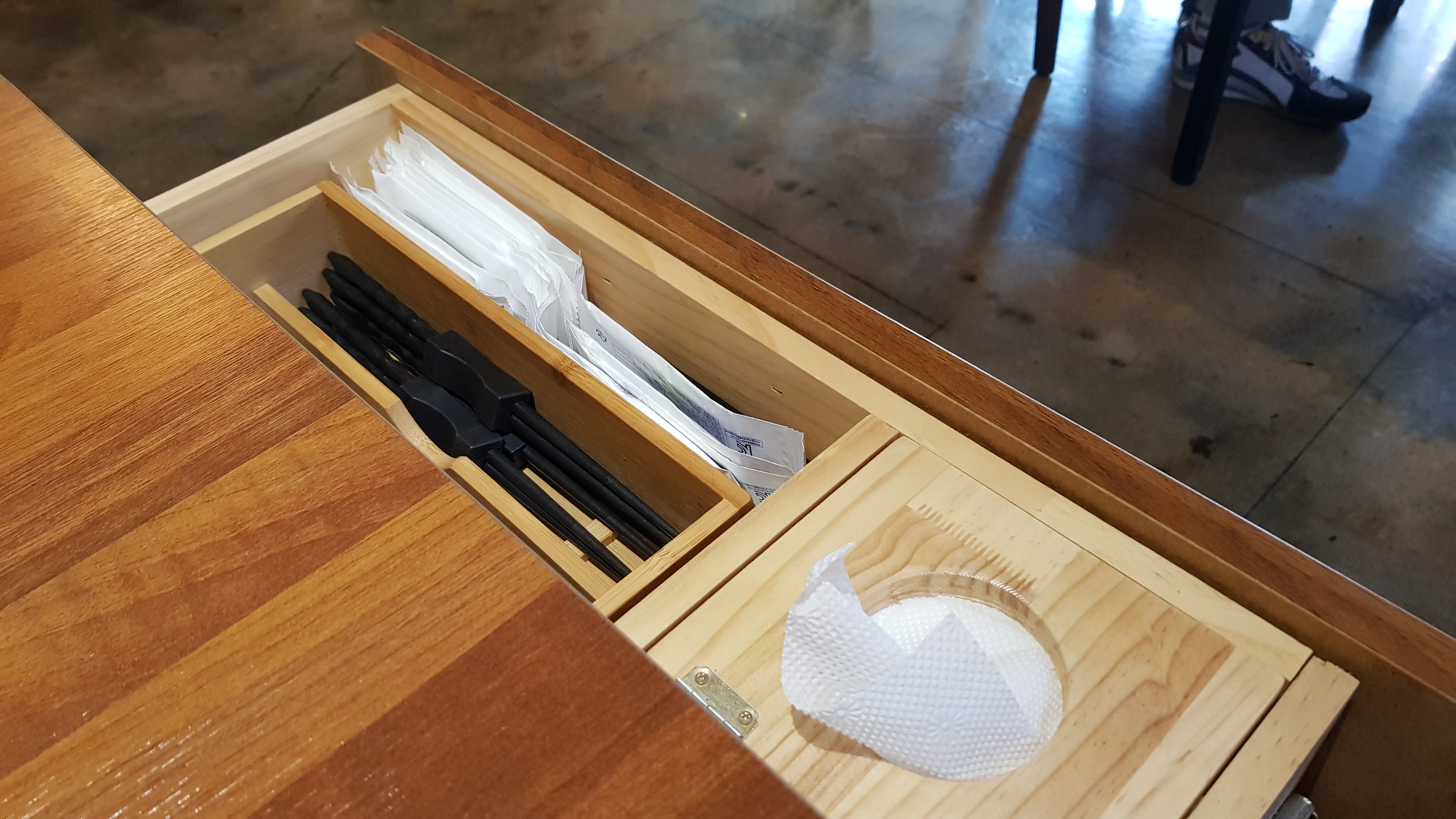 서랍을 열면 냅킨과 수저, 젓가락, 물티슈가 들어있어요.