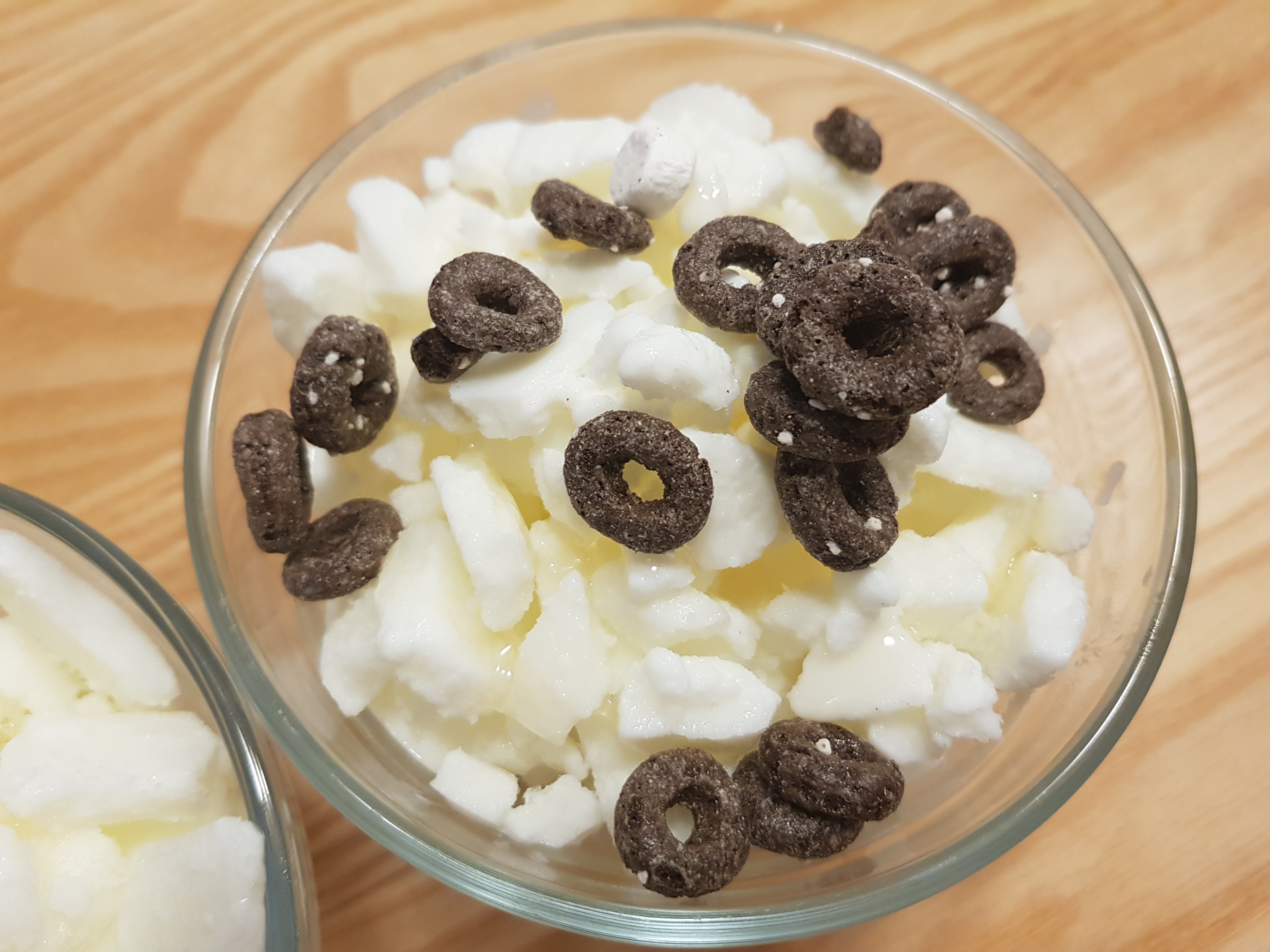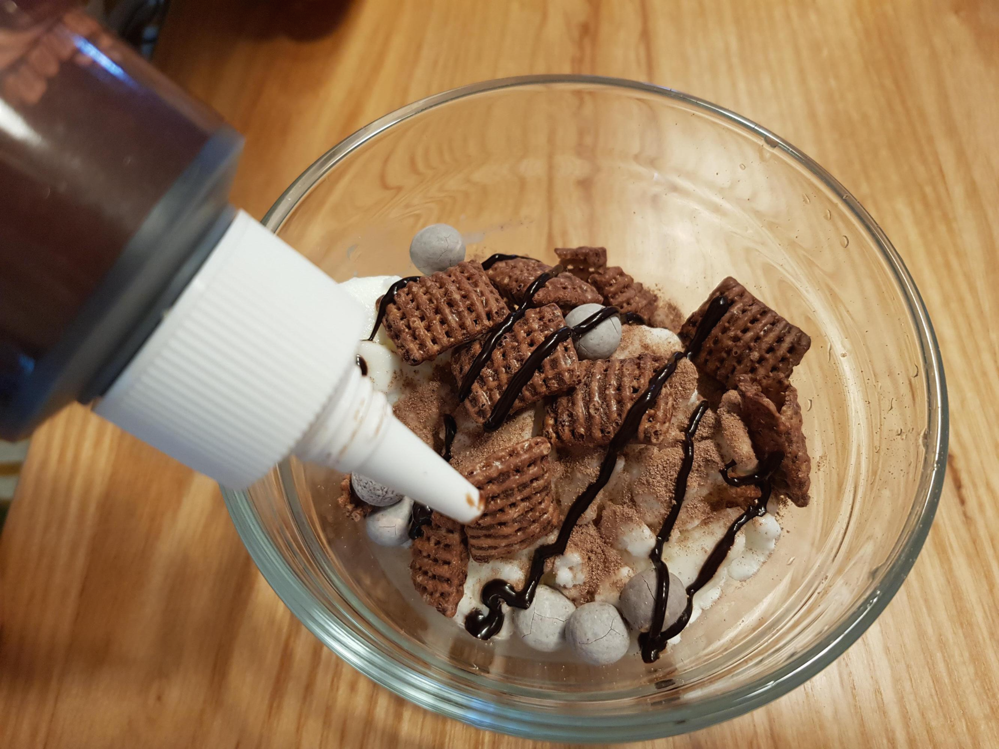 초코빙수 만들기 - 재료 : 초코가루(미떼or네스퀵or제티 등), 초코씨리얼 or 초코과자, 초코시럽