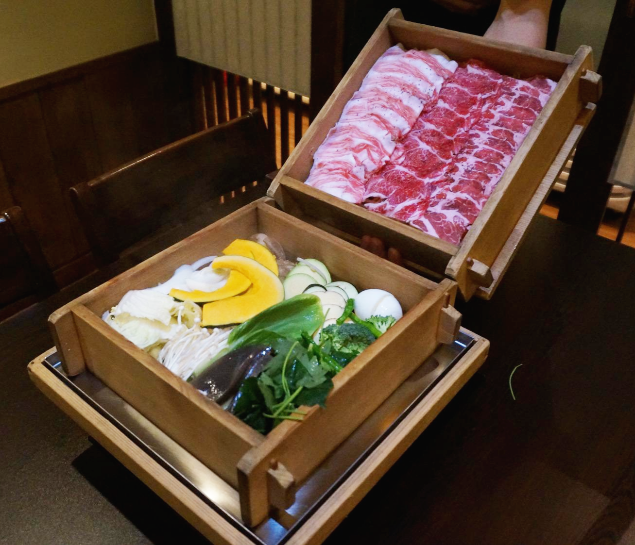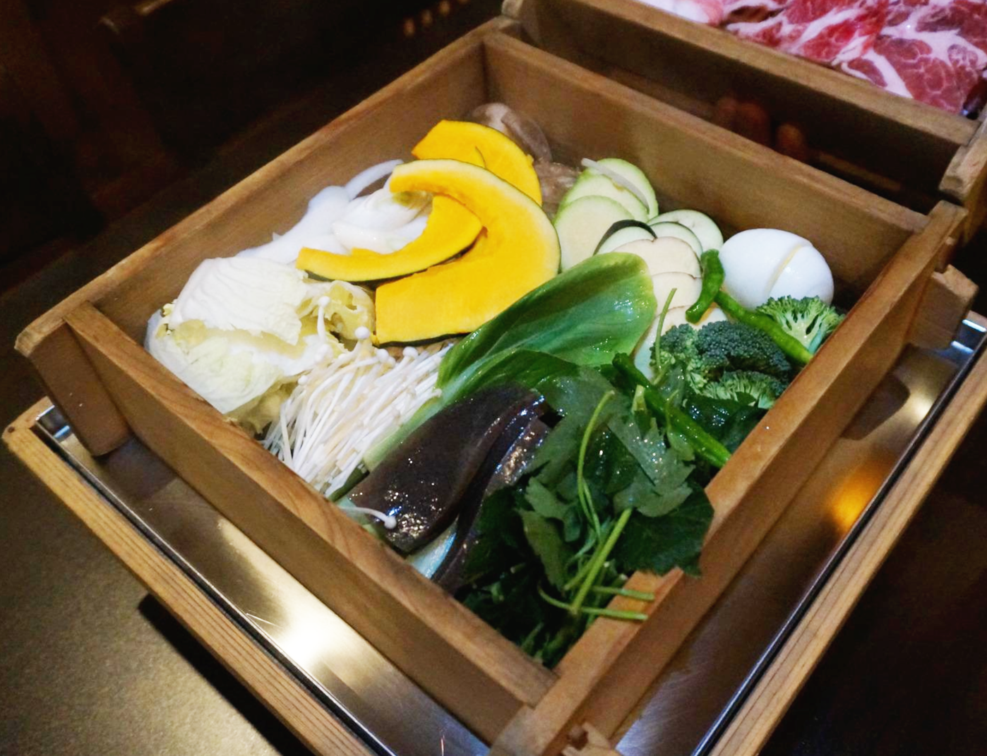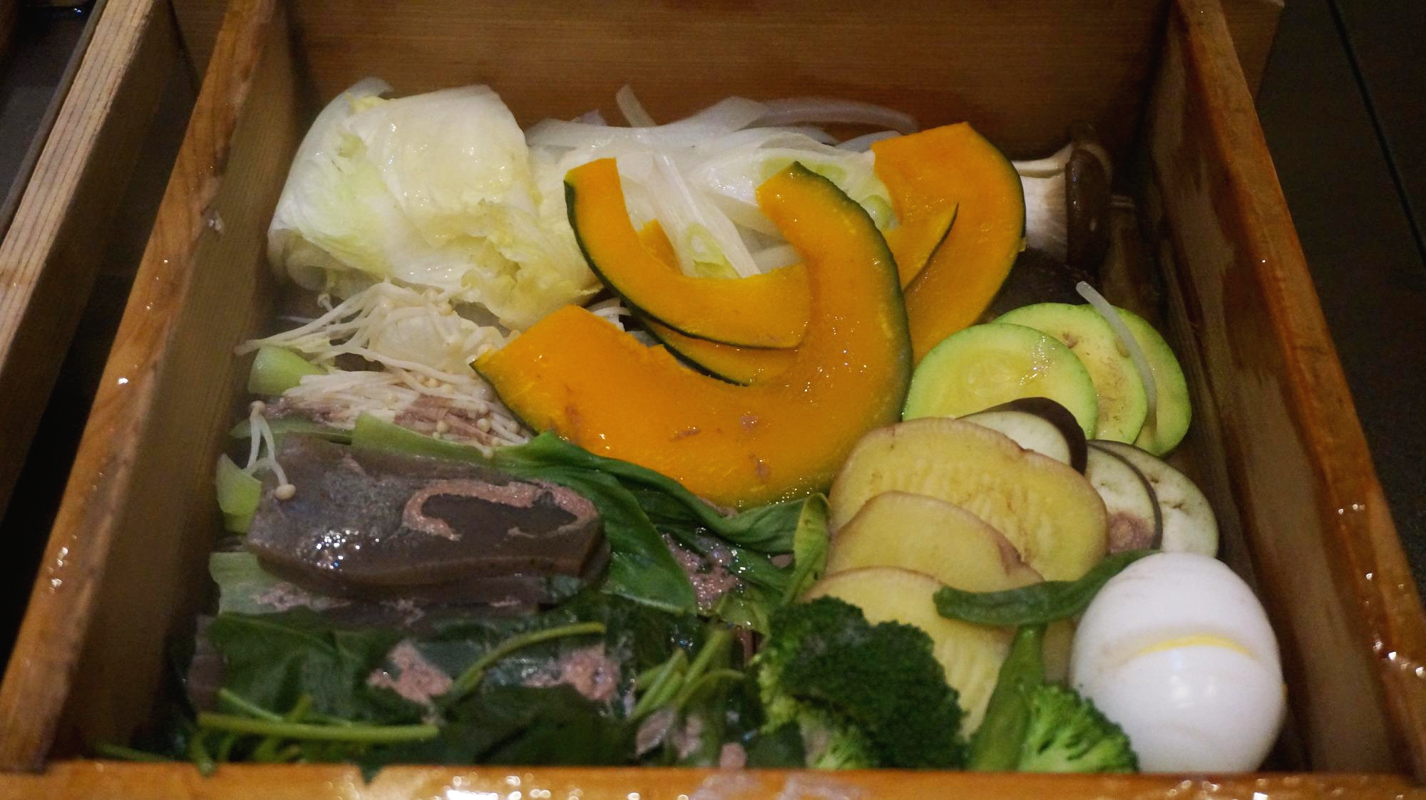 한우등심/이베리코 꽃목살/차돌 밑에 숙주가 깔려있는 것으로 한 칸, 애호박, 가지, 곤약, 팽이버섯, 배추, 단호박, 찐달걀, 청경채, 브로콜리 등 채소들이 한칸 총 두칸의 찜기로 음식이 조리 되어요.