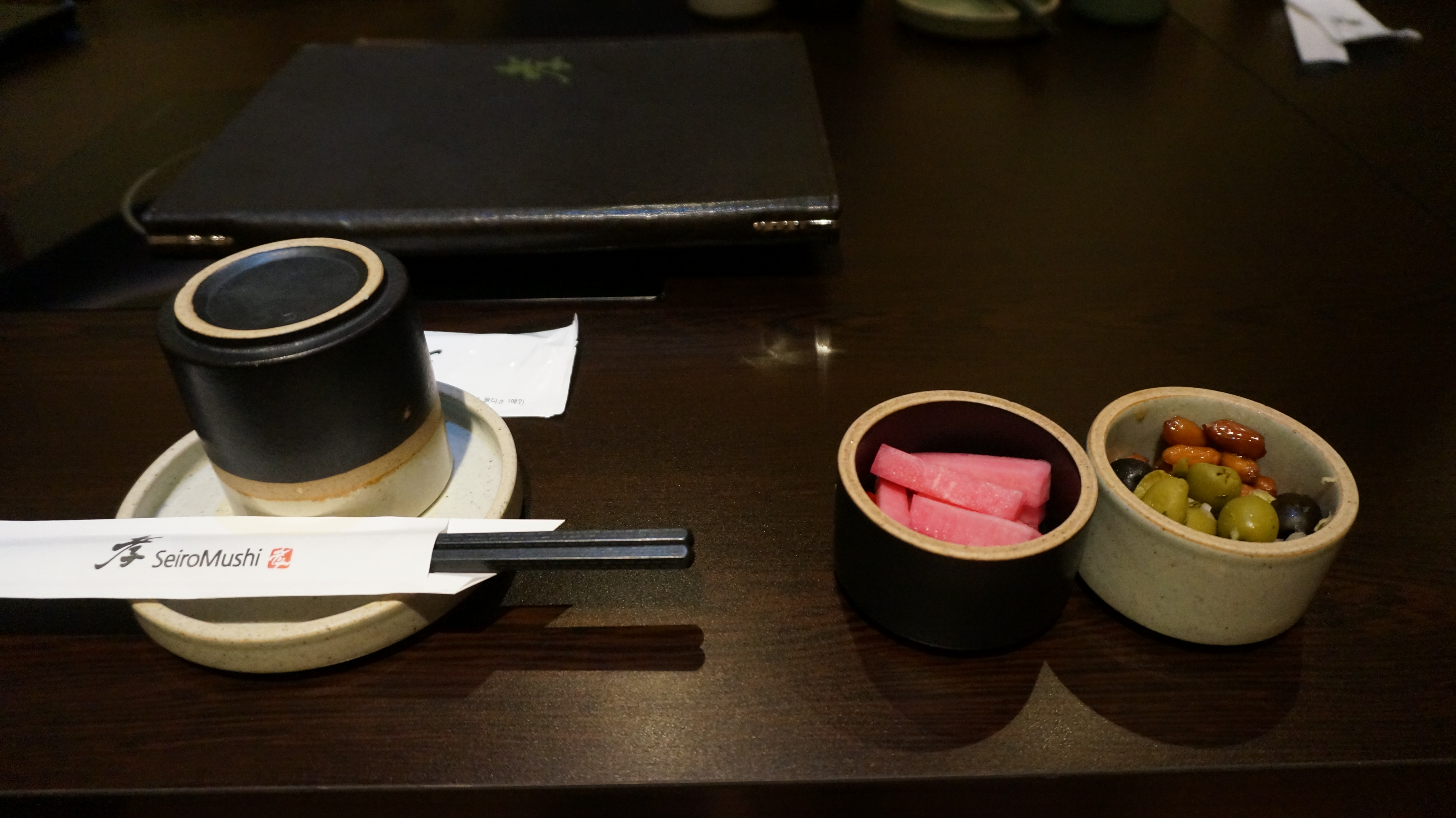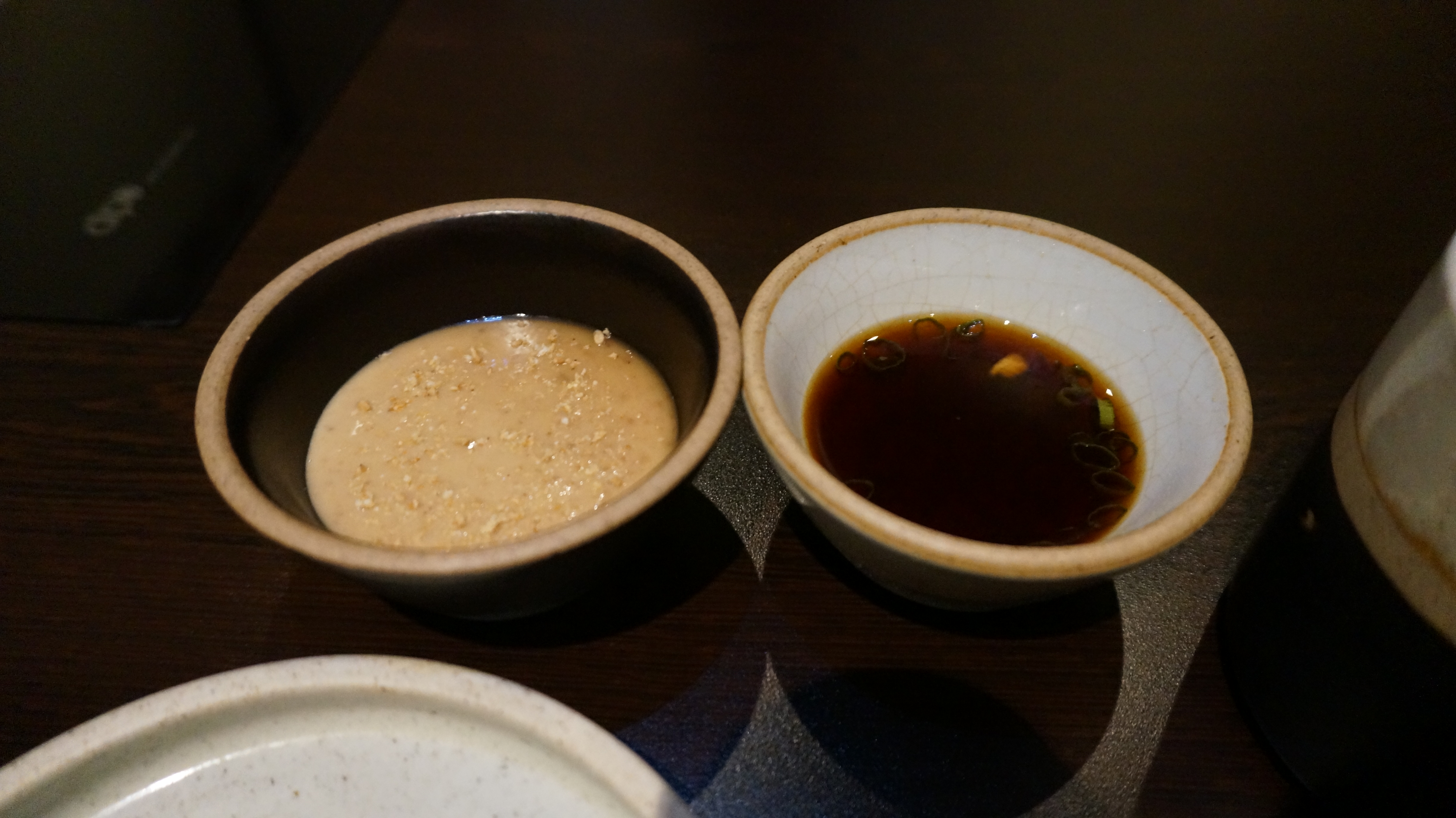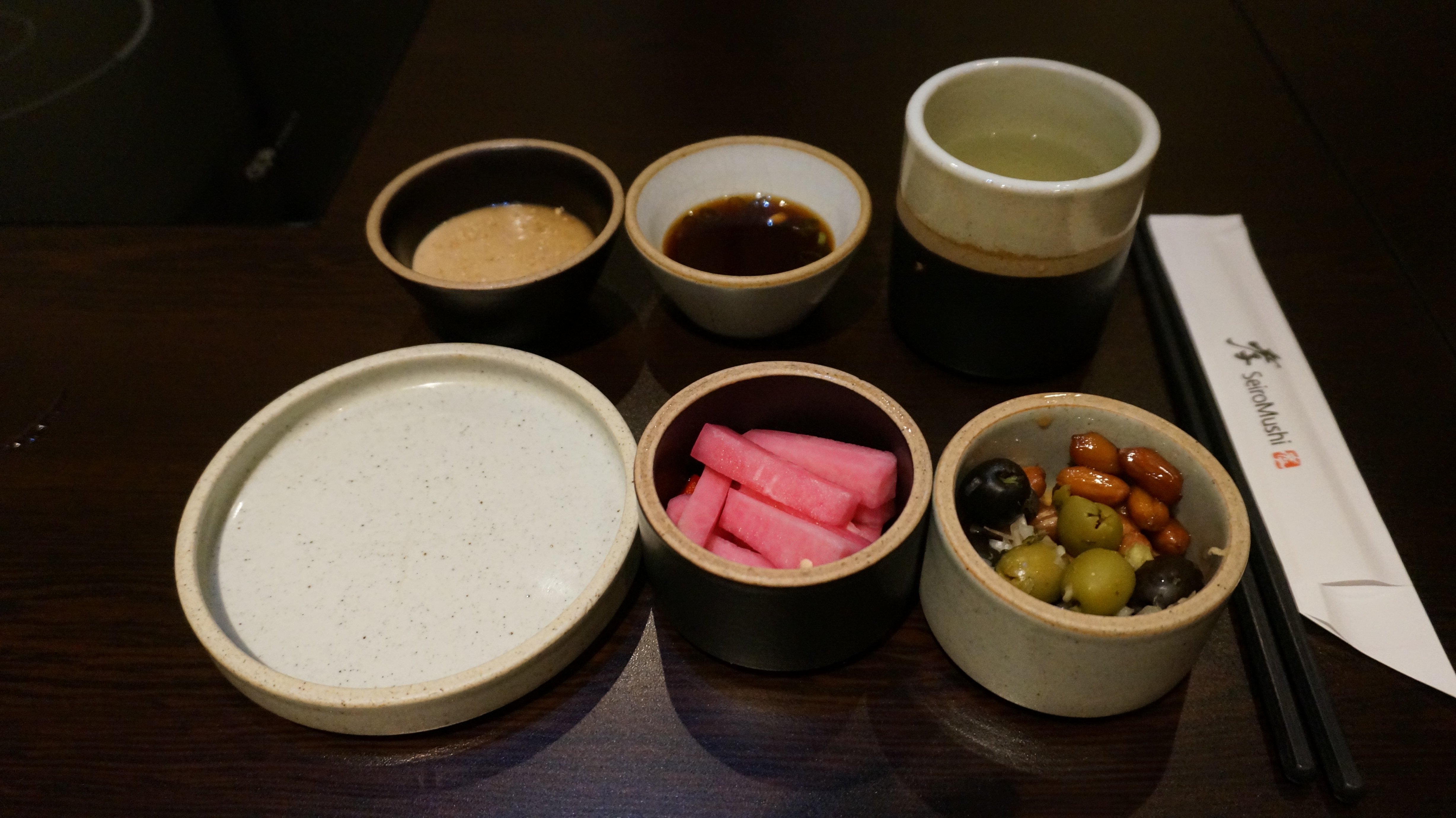 세이로무시에 찍어먹을 참깨소스와 폰즈, 그리고 칼칼한 맛을 더할 수 있도록 청양고추 슬라이스를 함께 주셨어요.