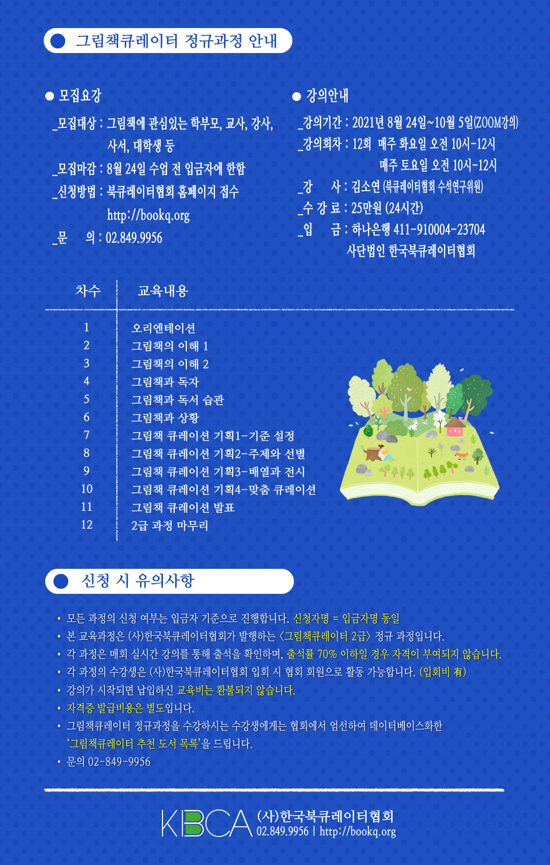 제가 수강했던 수업은 그림책 큐레이터 2급 양성과정으로 9기였고 강의기간은 8월 24일~10월 5일 총 12회의 강의로 진행되었었어요.