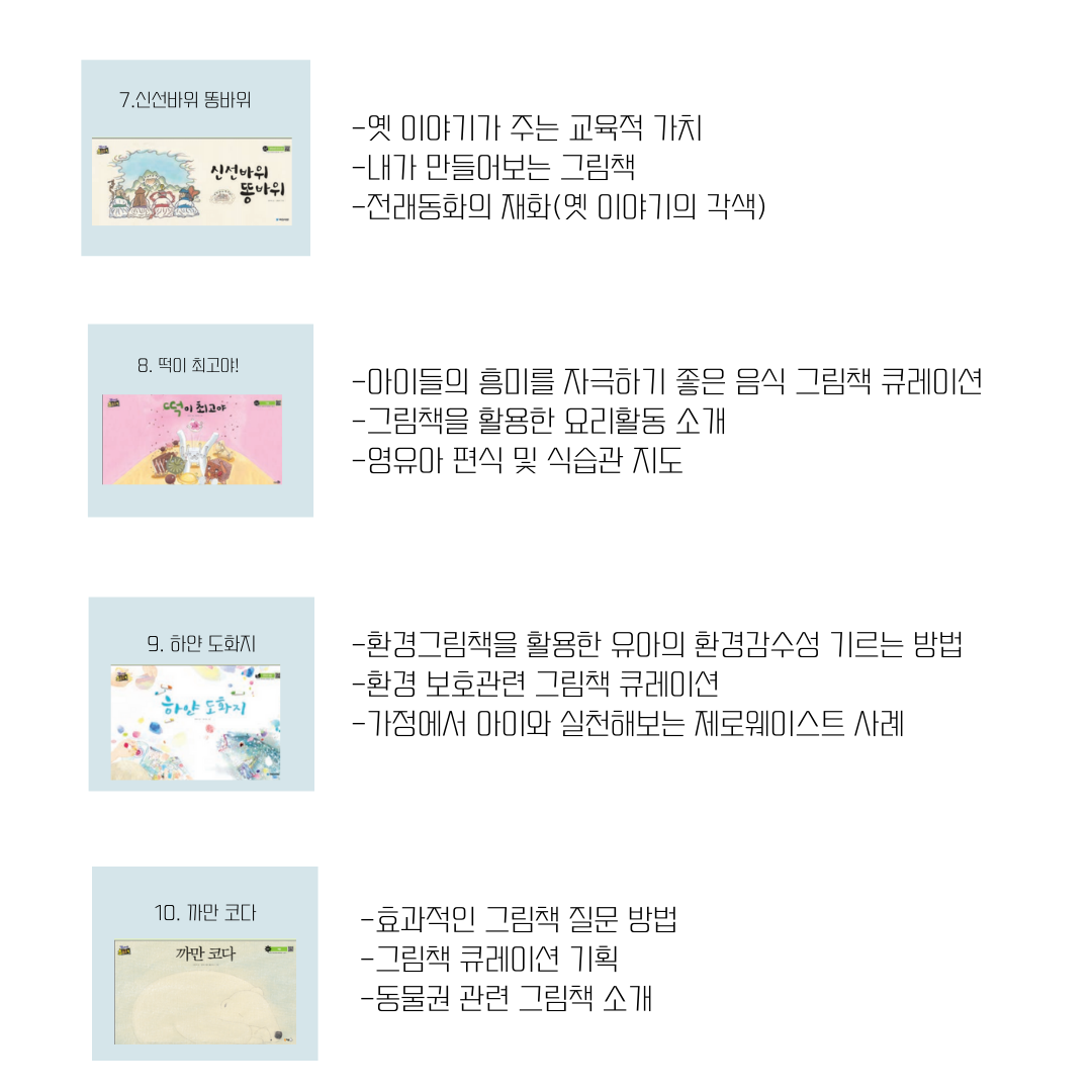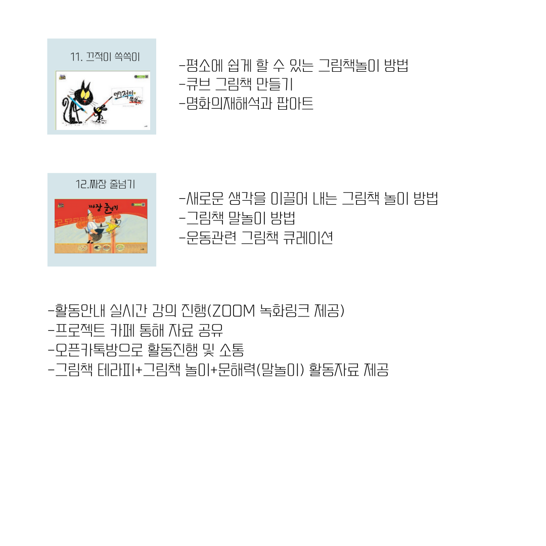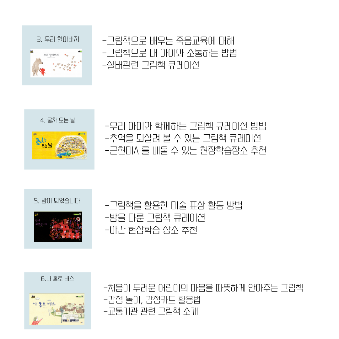 1주일에 1번 그림책 2권에 대한 워크지 제공과 부모님 대상으로 그림책교육을 진행해요.