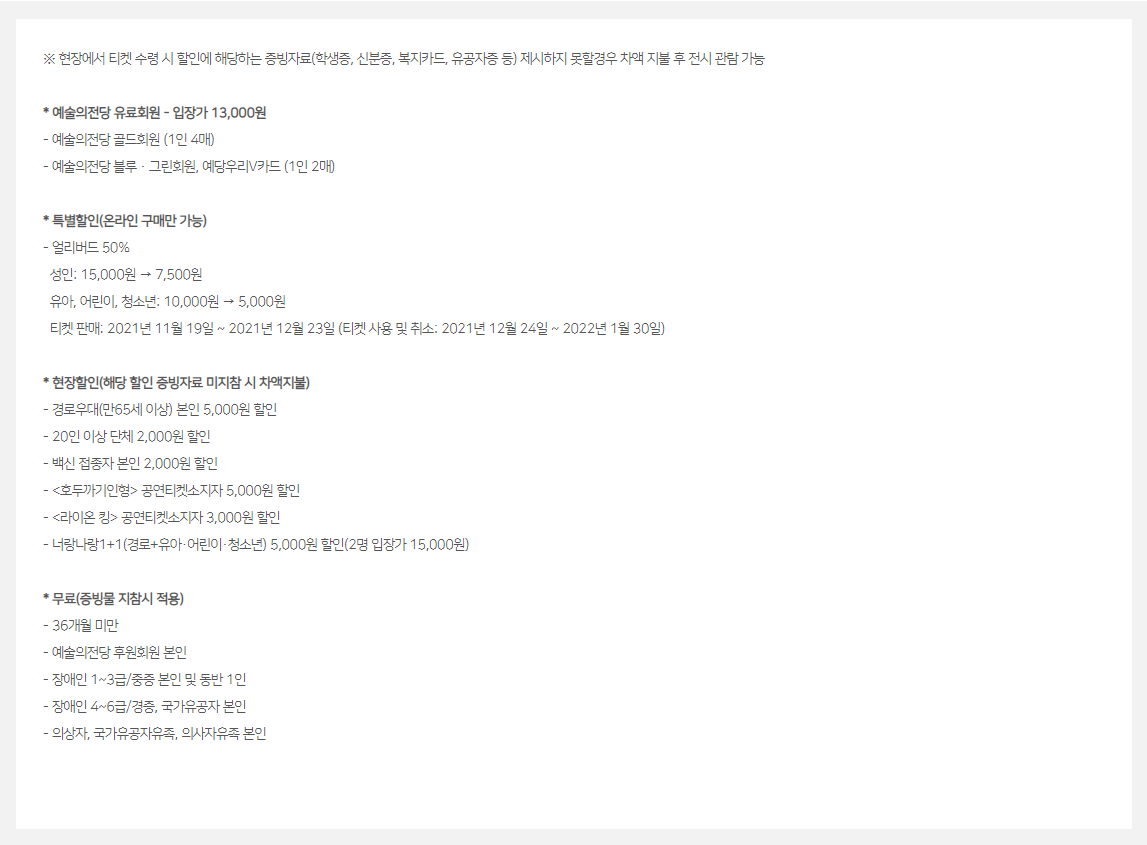 관람료 성인15,000원 / 유아,어린이,청소년 10,000원