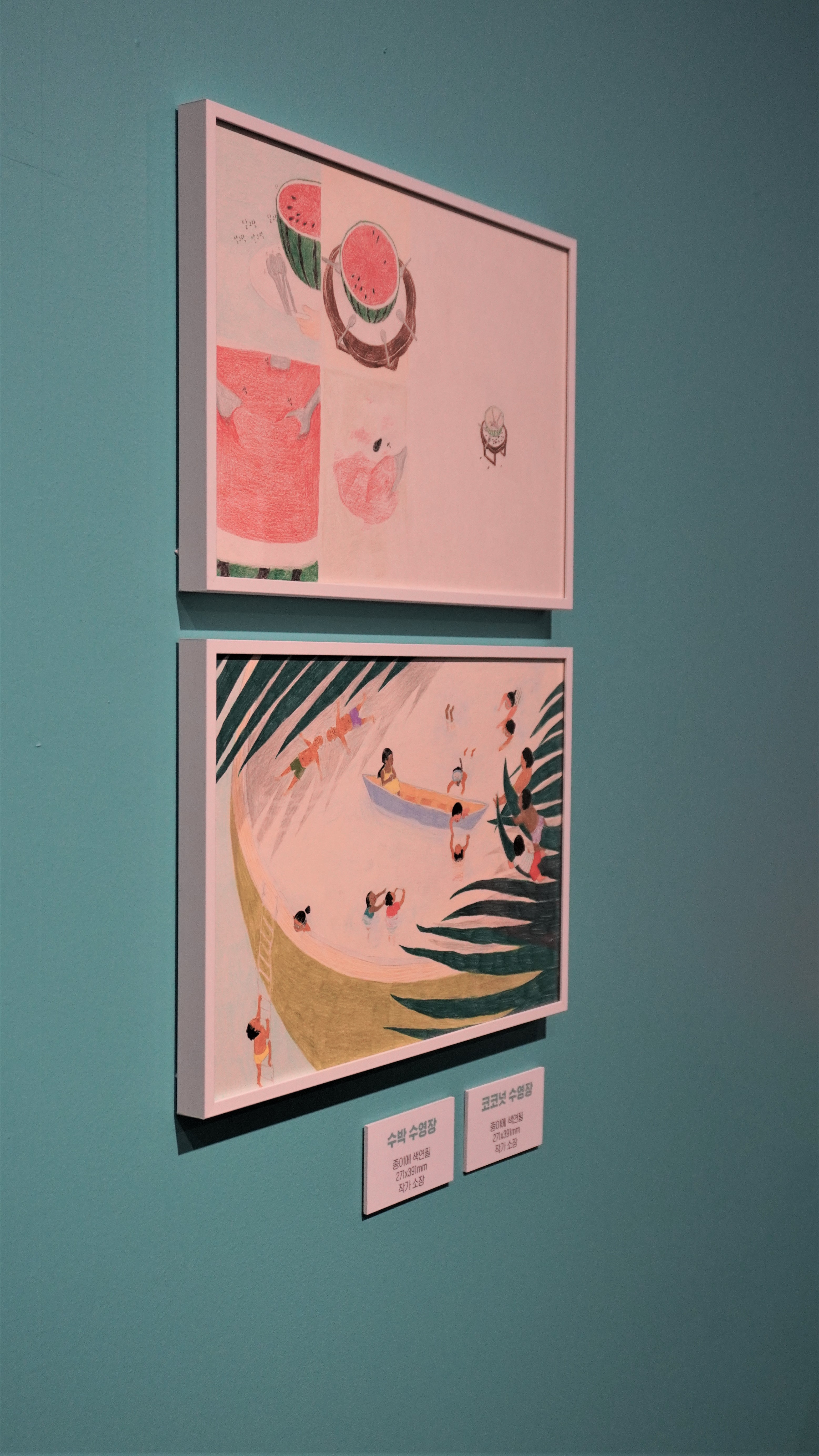 수박수영장 그림책에서는 옆 동네 코코넛 수영장도 개장했다던데 라는 말로 상상력을 불러일으키고 그림으로는 나오지 않았었어요. 그런데! 이렇게 전시장에서 작가의 코코넛 수영장 컷을 게다가 원화로 만날 수 있다니 너무너무 신나더라구요.