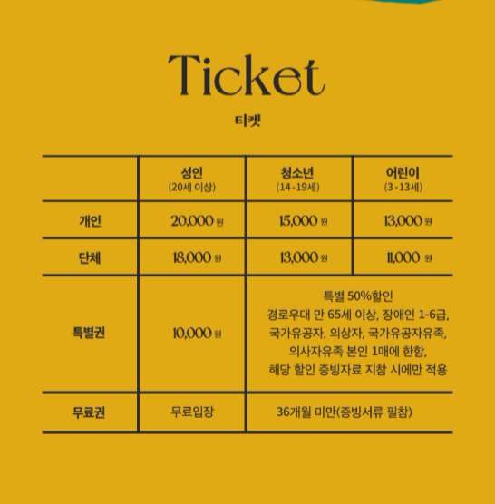 티켓 가격은 성인 20,000원, 청소년 15,000원 어린이 13,000원 이며 그 외의 경우는 위 이미지를 참고해주세요.