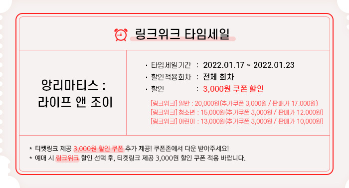 티켓링크에서 오는 1월 23일(일) 까지 3000원 쿠폰할인 적용이 된다고 해요.