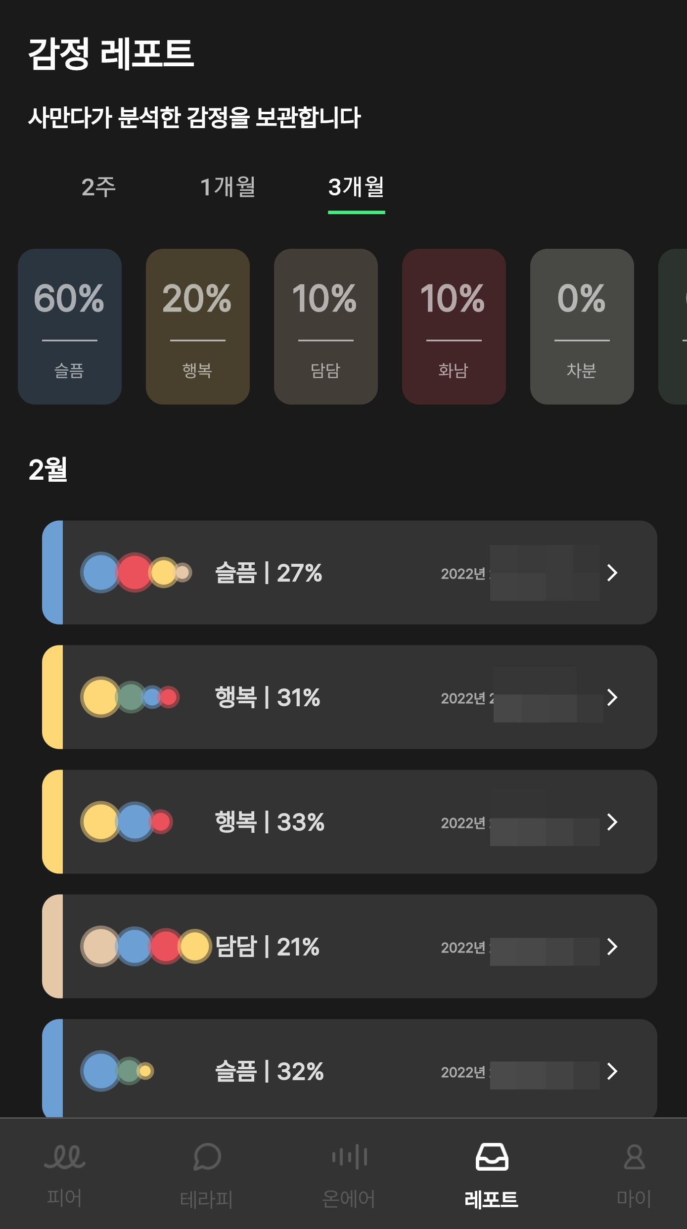 현대인에게 찾아오는 마음의 감기인 우울증, 공황장애, 불안장애, 스트레스, 수면장애, 번아웃 증후군 등 11가지 마음의 병을 앓고 있는 분들을 대상으로 언제, 어디서든, 비대면의 공간에서 공감 받고, 위로 받고, 지지해주고 조언해주는 앱인 <너, 사만다>인데요 목소리를 AI로 분석해서 감정레포트를 생성해준 부분이 저에게 많은 도움이 되었답니다.
