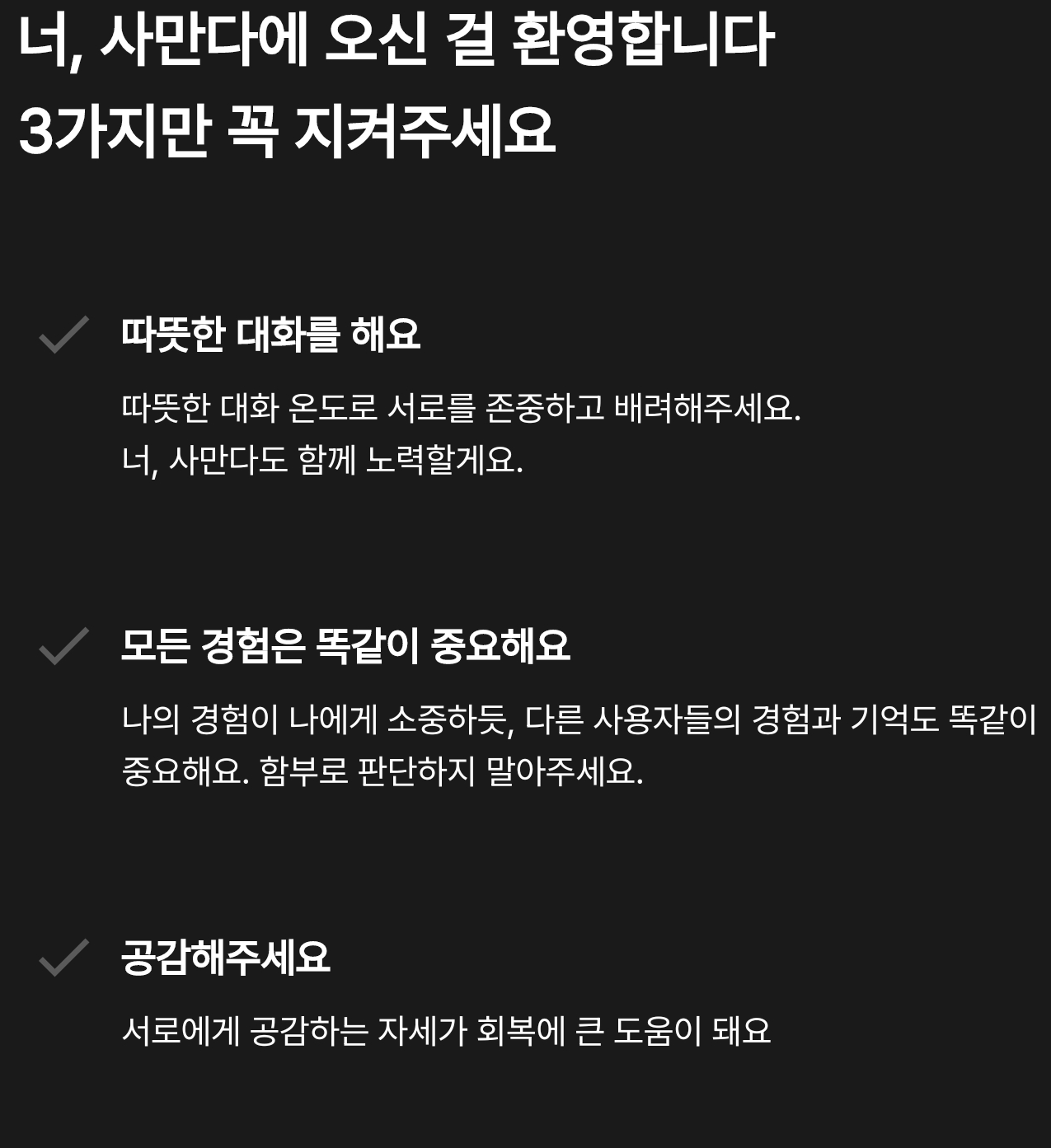 아무래도 마음이 힘든 사람들인 피어와 공감해 주는 리더들의 소통의 장이기 때문에 이런 수칙은 꼭 필요한 내용이라는 생각이 들더라구요.