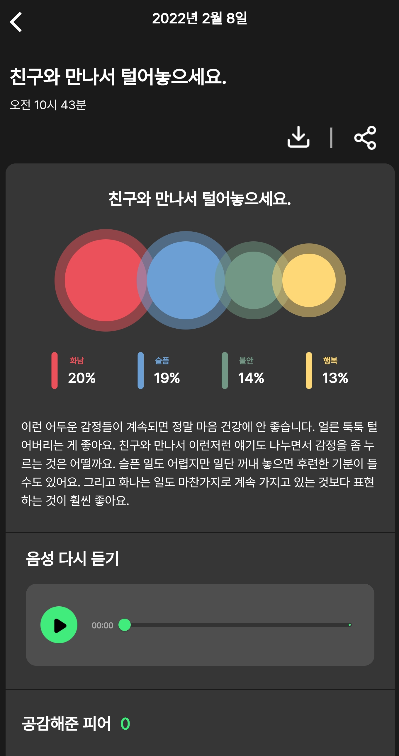 아무래도 힘든일은 혼자 삭히게 되는데 비대면이고, 익명이라 내 얘기를 자유롭게 할 수 있는 어플을 만날 수 있어 다행이라는 생각이 들었고 우울하고 힘들 때 공감받고 위로받고 싶을 때 저 말고도 많은 분들이 찾으시면 좋겠어서 이렇게 소개 해봅니다.