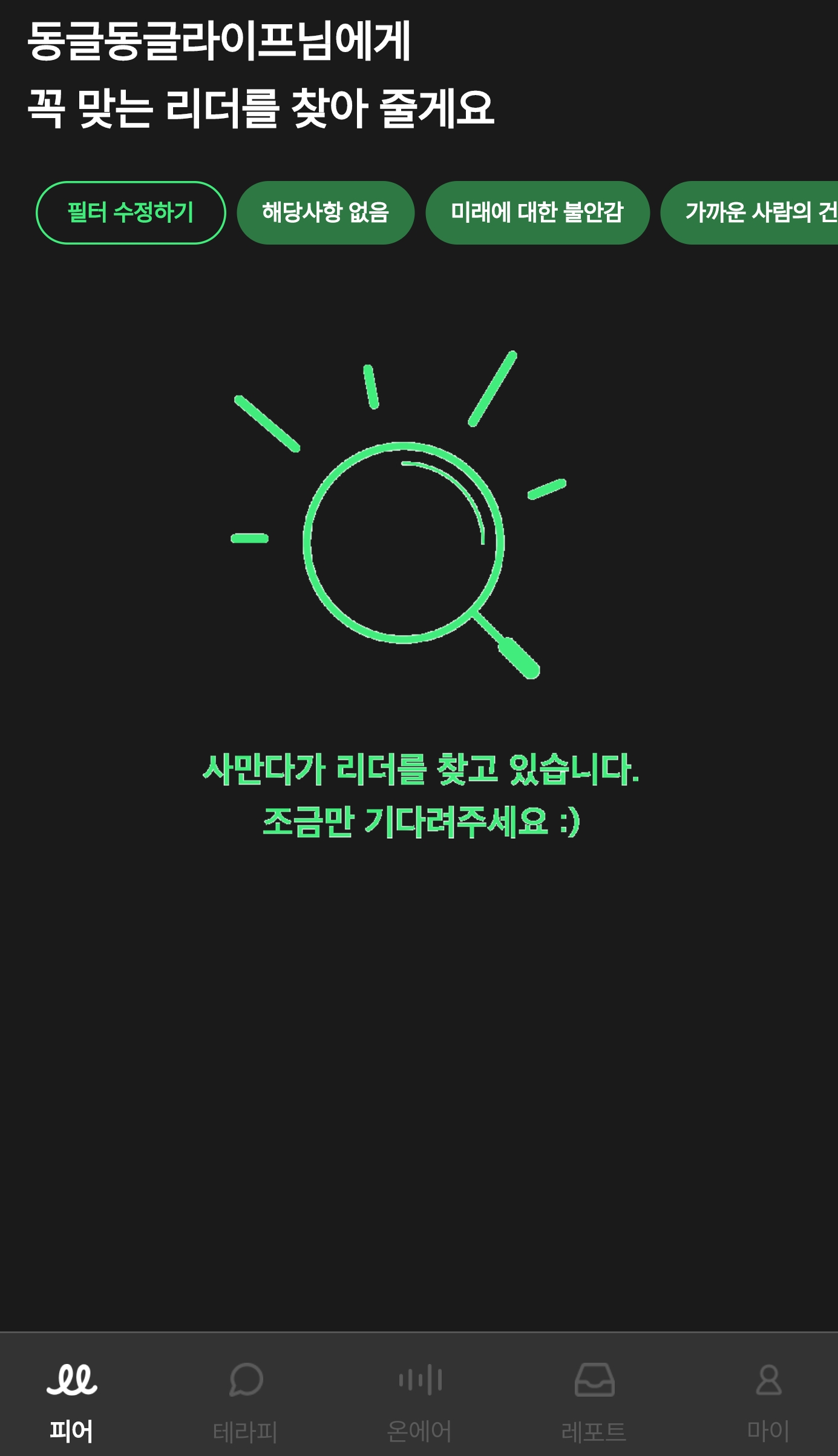 정신건강에 어려움을 격는 일반 회원인 피어와 유사한 경험을 극복한 경험자인 리더를 인공지능 AI기반으로 매칭해 공감과 위로를 제공해주고 있어요.