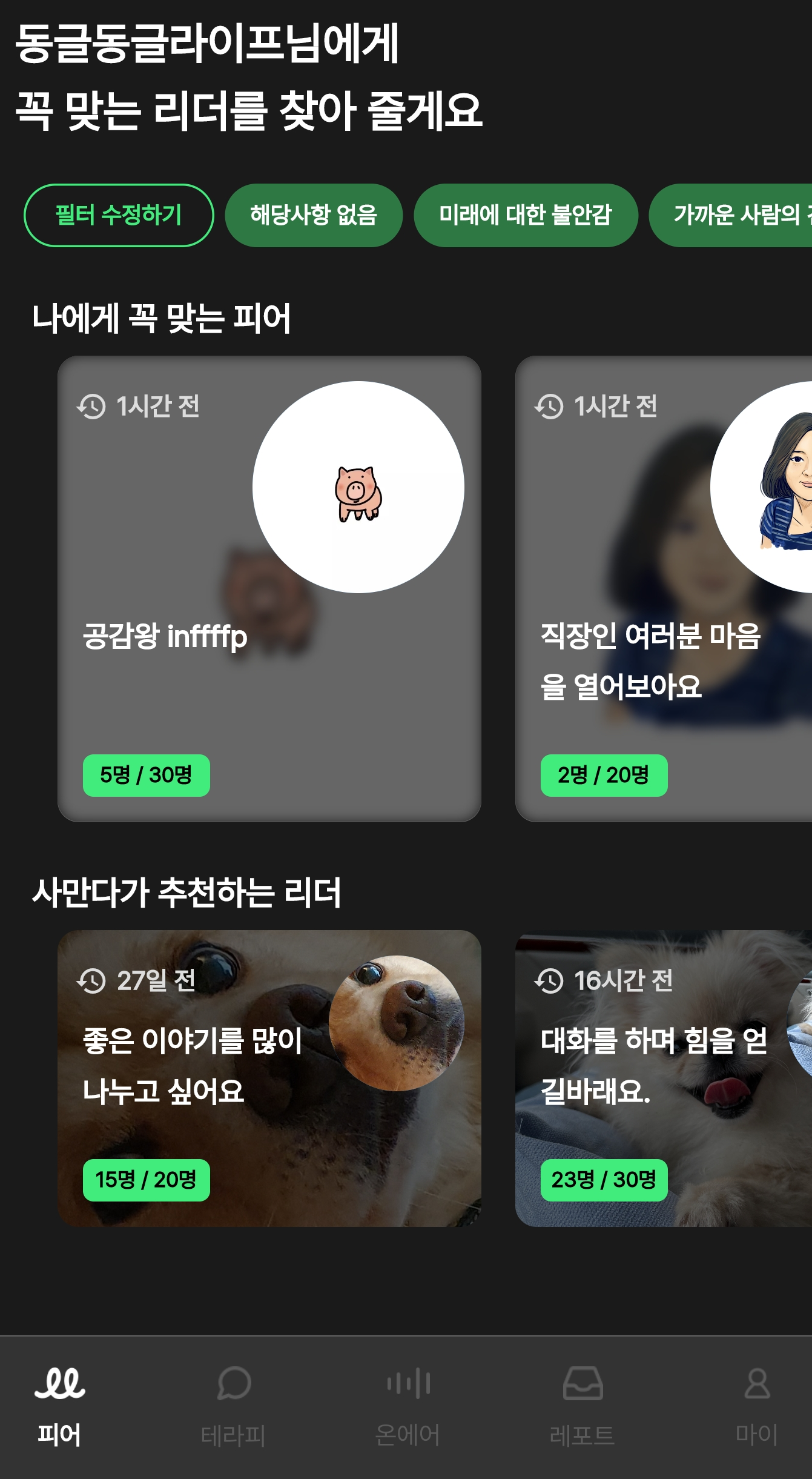 세부 내용들을 토대로 비슷한 어려움을 가진 피어와 추천 리더들을 안내받았어요.
