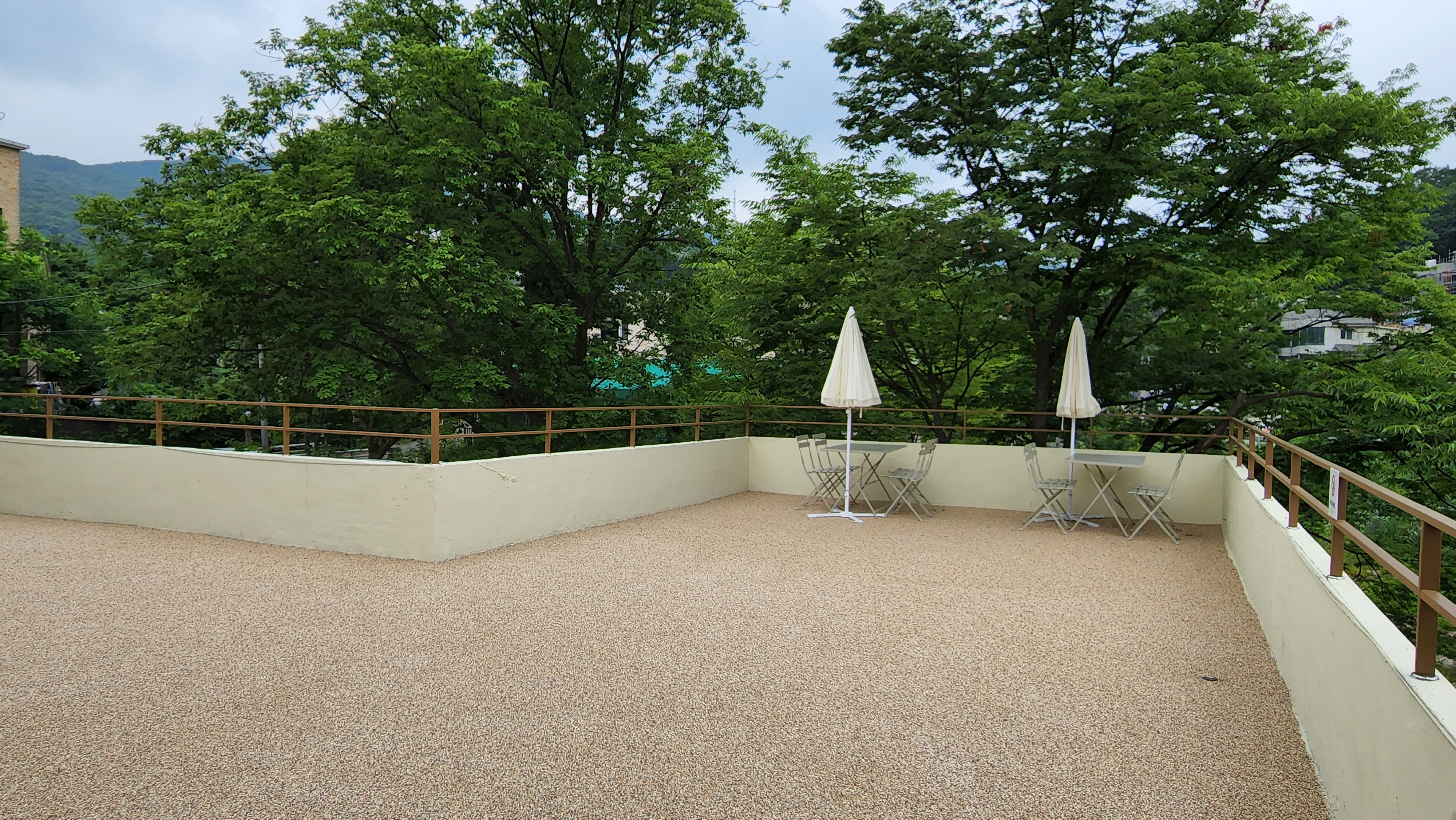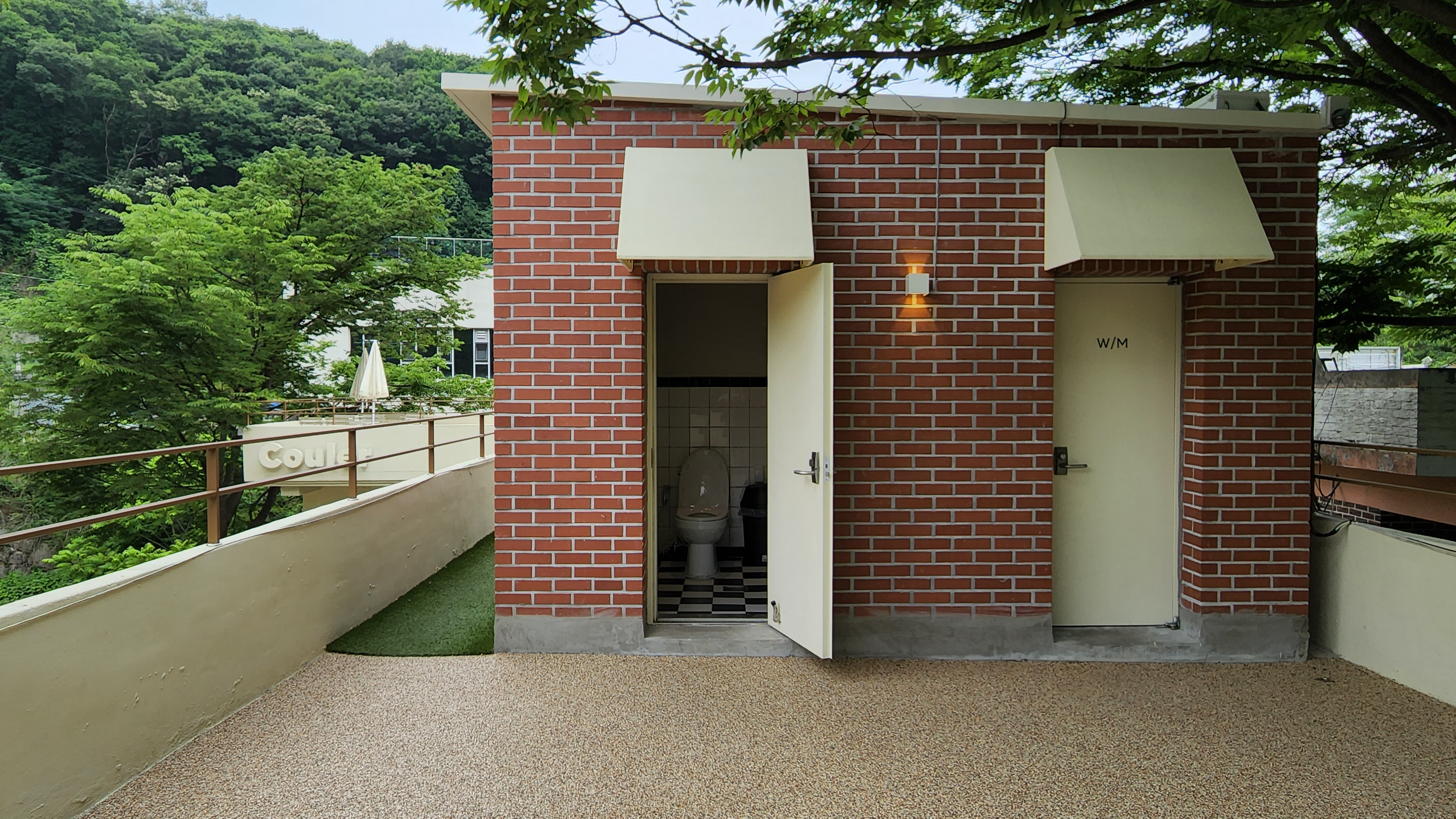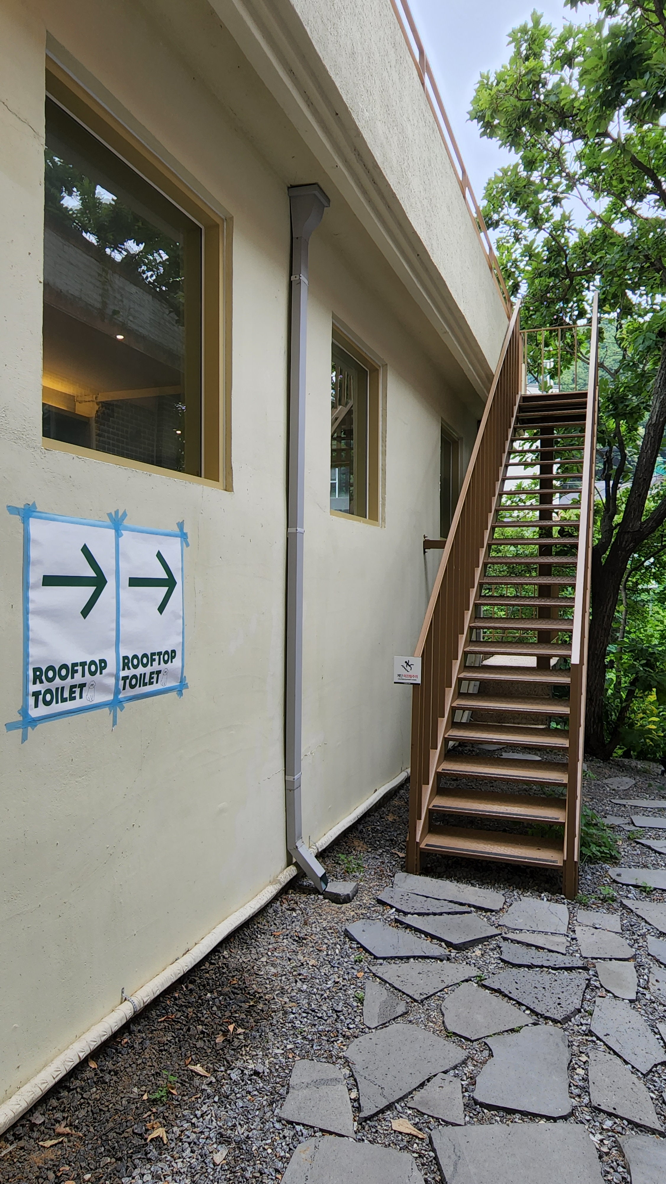 카페 뒷쪽에 계단이 있고 루프탑좌석과 화장실이 위치해있어요.