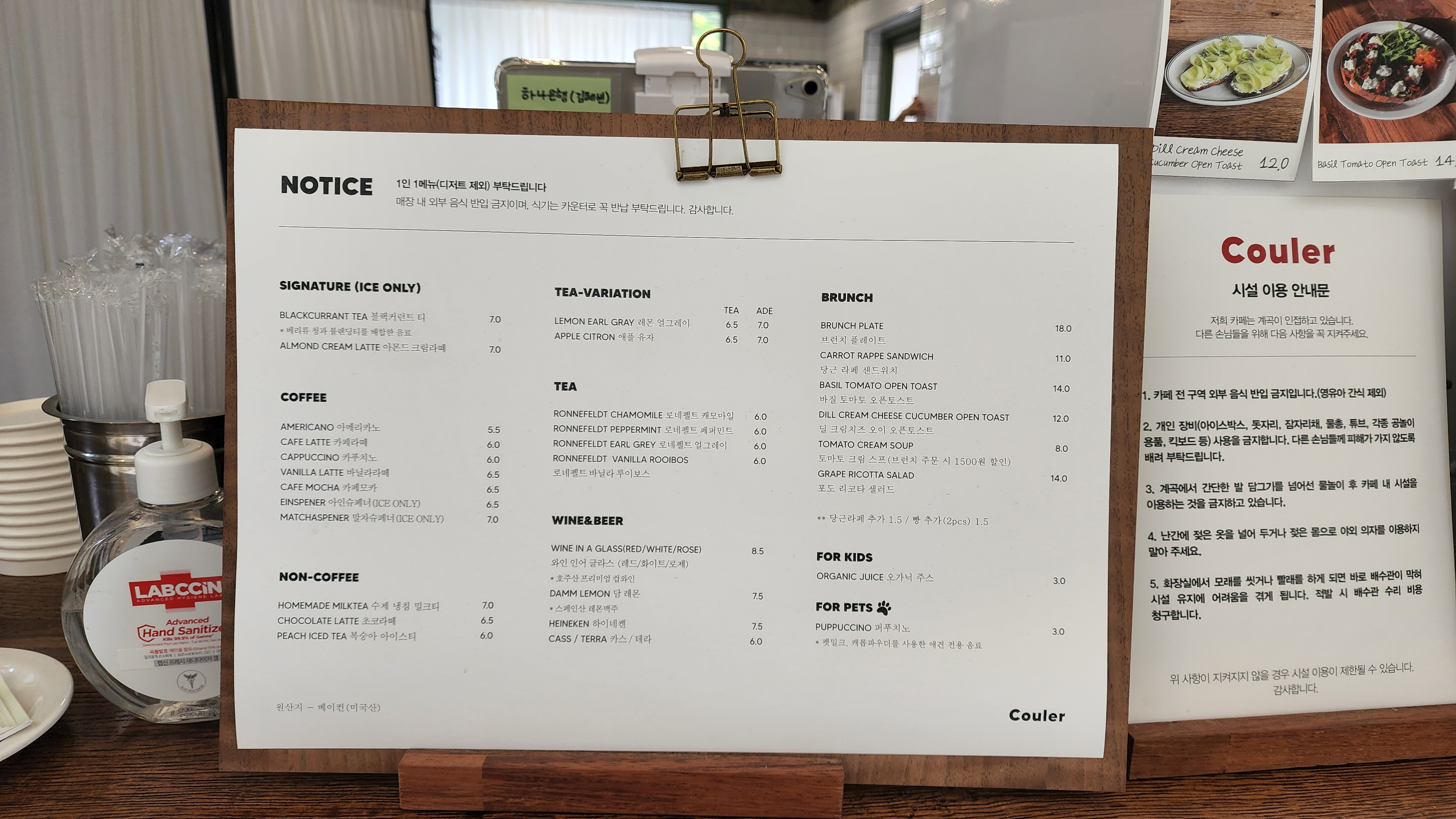 1인 1메뉴 부탁하는 안내와 함께 음료, 브런치 등 메뉴가 있었어요.
