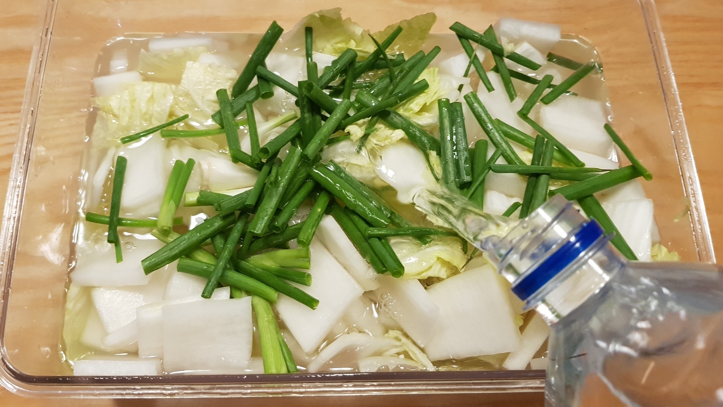 쪽파, 알배추, 무 그리고 새미네부엌 물김치 양념이 필요하고 사진엔 빠뜨렸지만 생수도 필요해요.